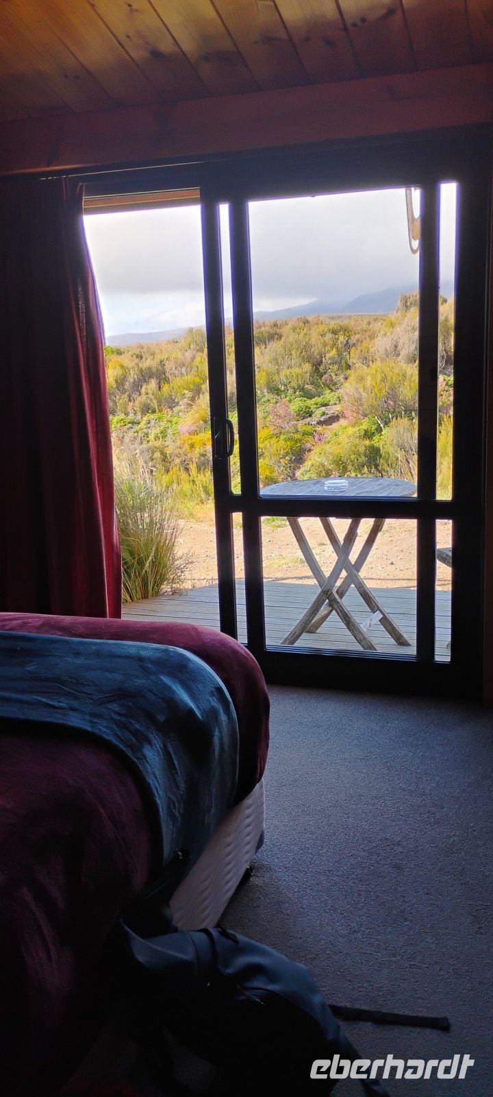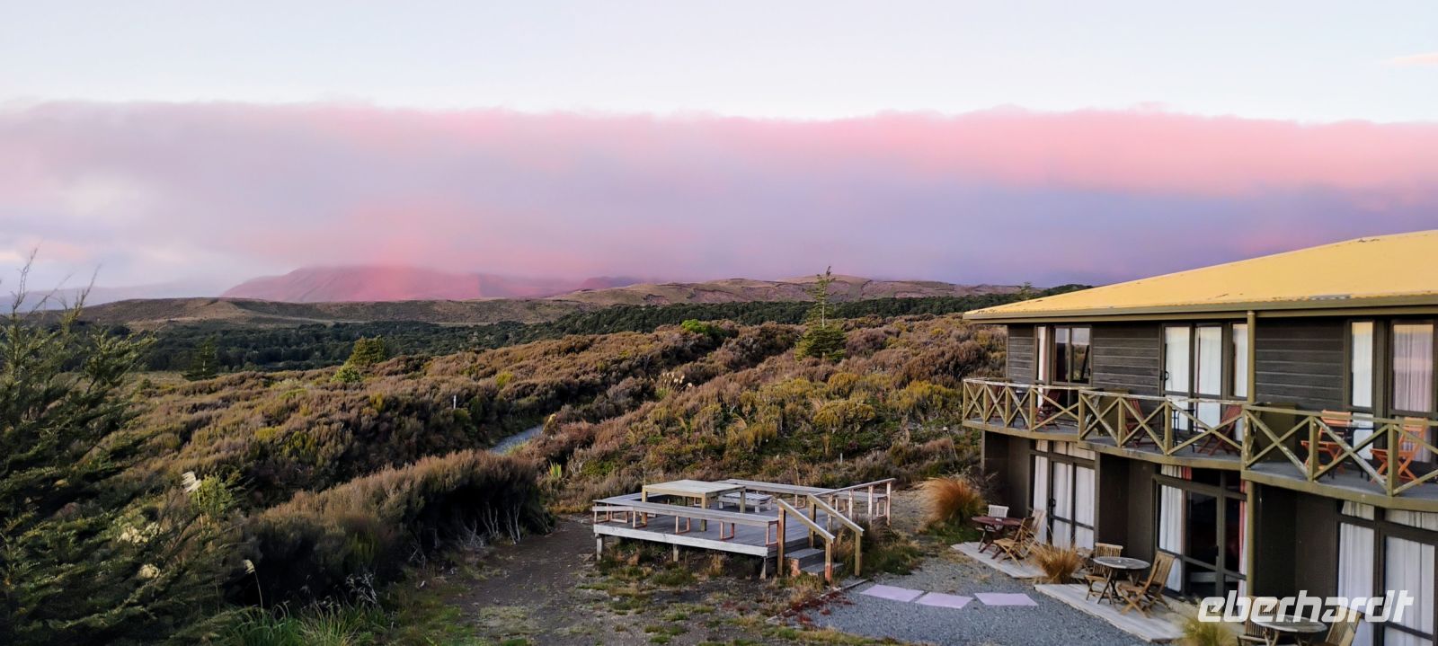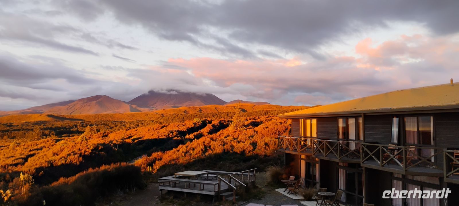Schließlich erreichten wir Whakapapa und checkten im „Skotel“ ein, das mit 1.142 m das höchst gelegene Hotel Neuseelands ist und für die nächsten zwei Nächte unser Zuhause sein würde. Zum Tagesausklang genossen wir ein entspanntes Abendessen im Hotelrestaurant – eine wohlverdiente Pause nach einem Tag voller geothermischer Wunder und imposanter Landschaften.