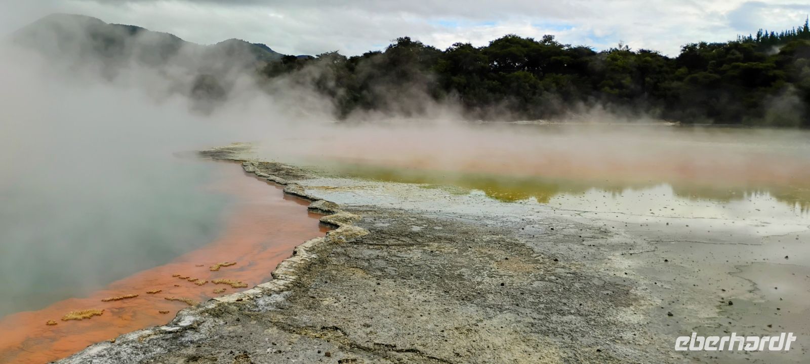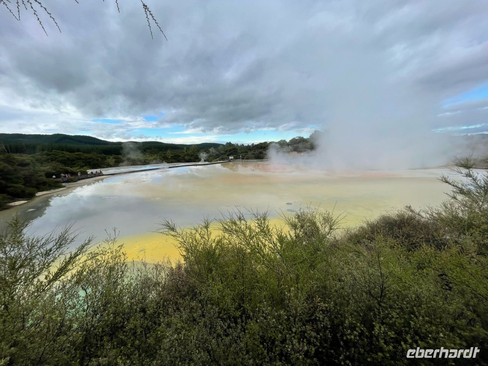Zum Abschluss konnten wir den Geysir Te Puia in Aktion erleben, auch wenn er sich eher bescheiden zeigte. Auch hier hatten wir wieder Glück: Der Regen verschonte uns, sodass alle Erlebnisse bei trockenen Bedingungen stattfinden konnten.