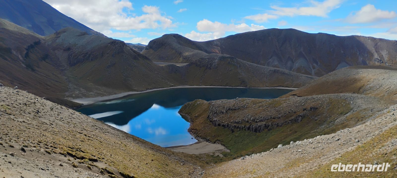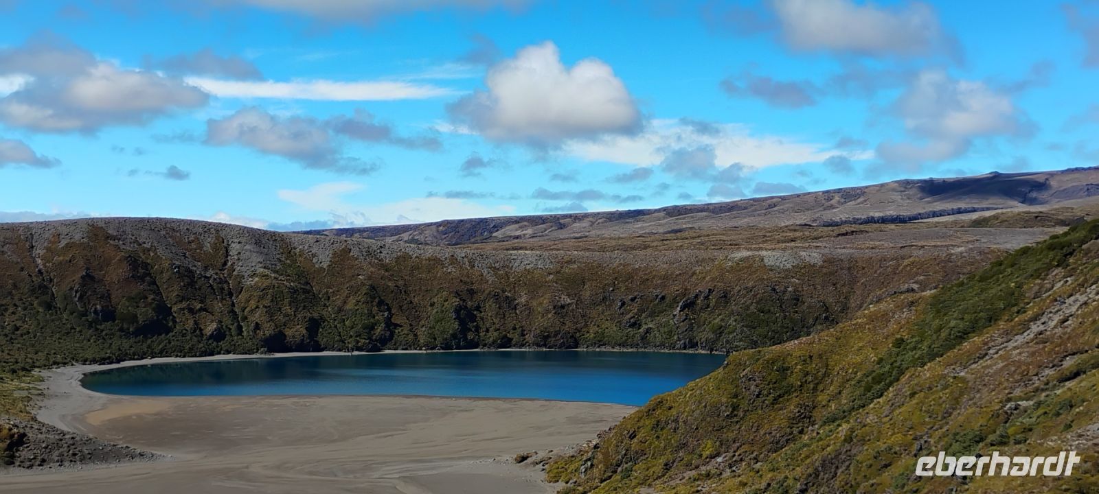 Am Lower Tama Lake legten wir eine wohlverdiente Mittagspause ein und ließen uns den Walnuss-Muffin schmecken, den Alec für uns ausgegeben hatte. Da das letzte Stück der Route, der Aufstieg zum Upper Tama Lake, sehr steil und mit losem Geröll übersät war, entschieden wir uns, den unteren See als unser Ziel zu betrachten. Doch ein Foto vom oberen See durfte natürlich nicht fehlen! Kurzerhand sprintete die Reiseleitung nach oben, schoss das ersehnte Bild und eilte wieder zurück zur Gruppe.
