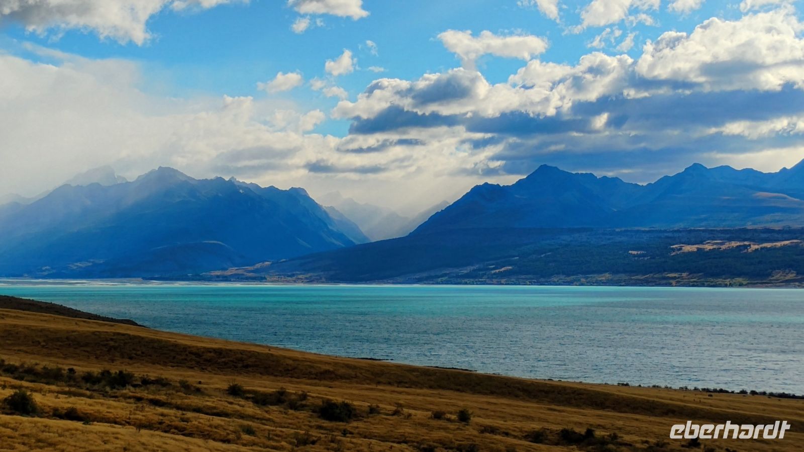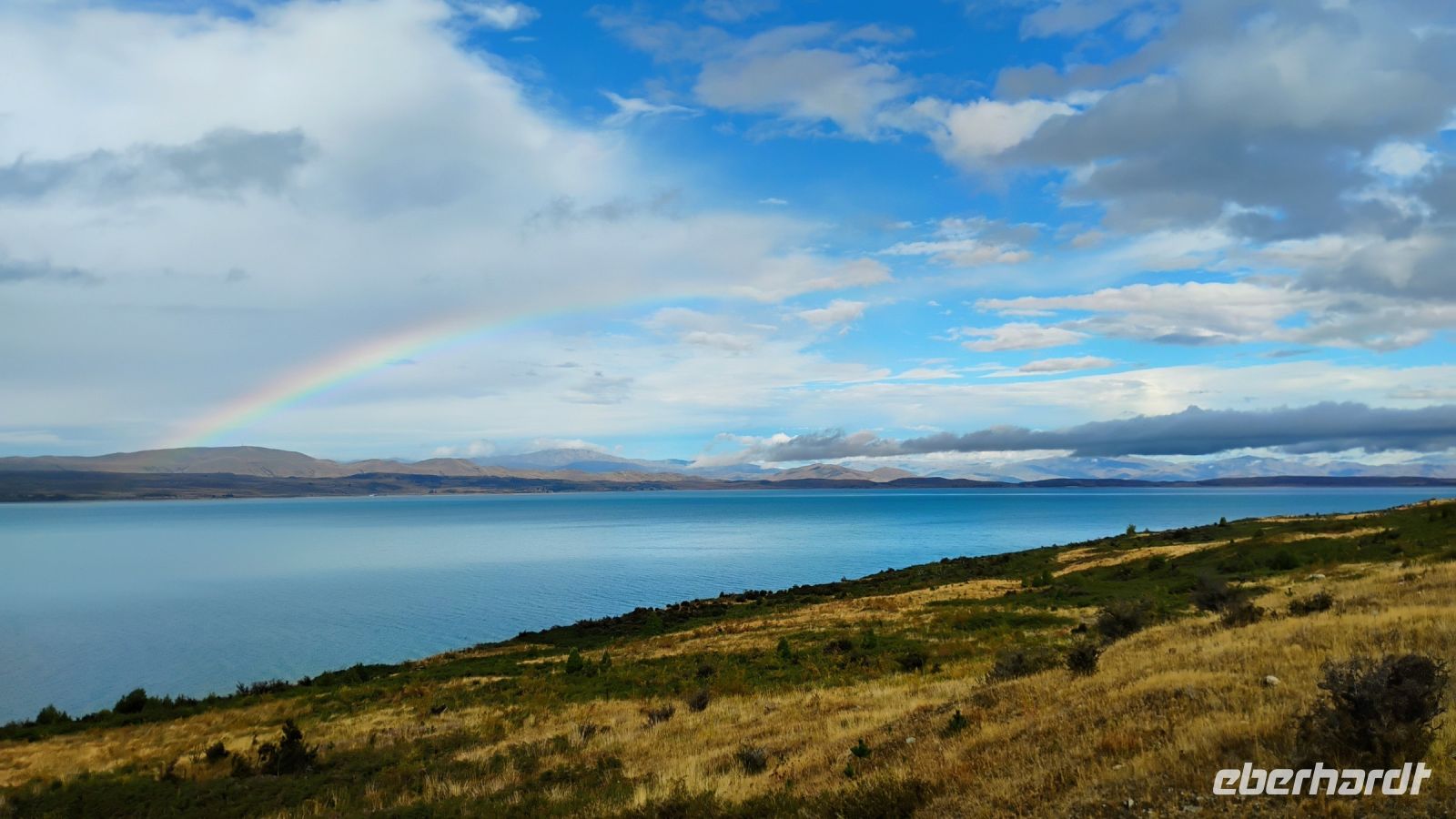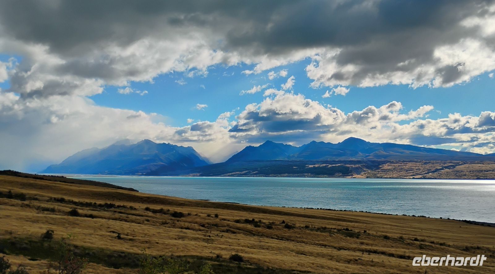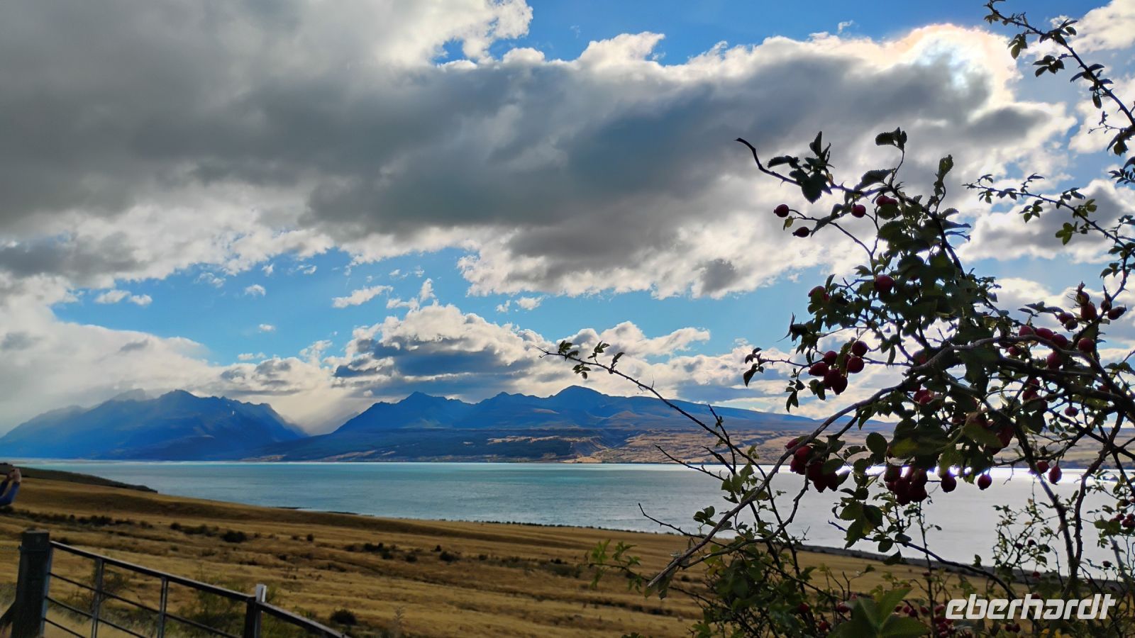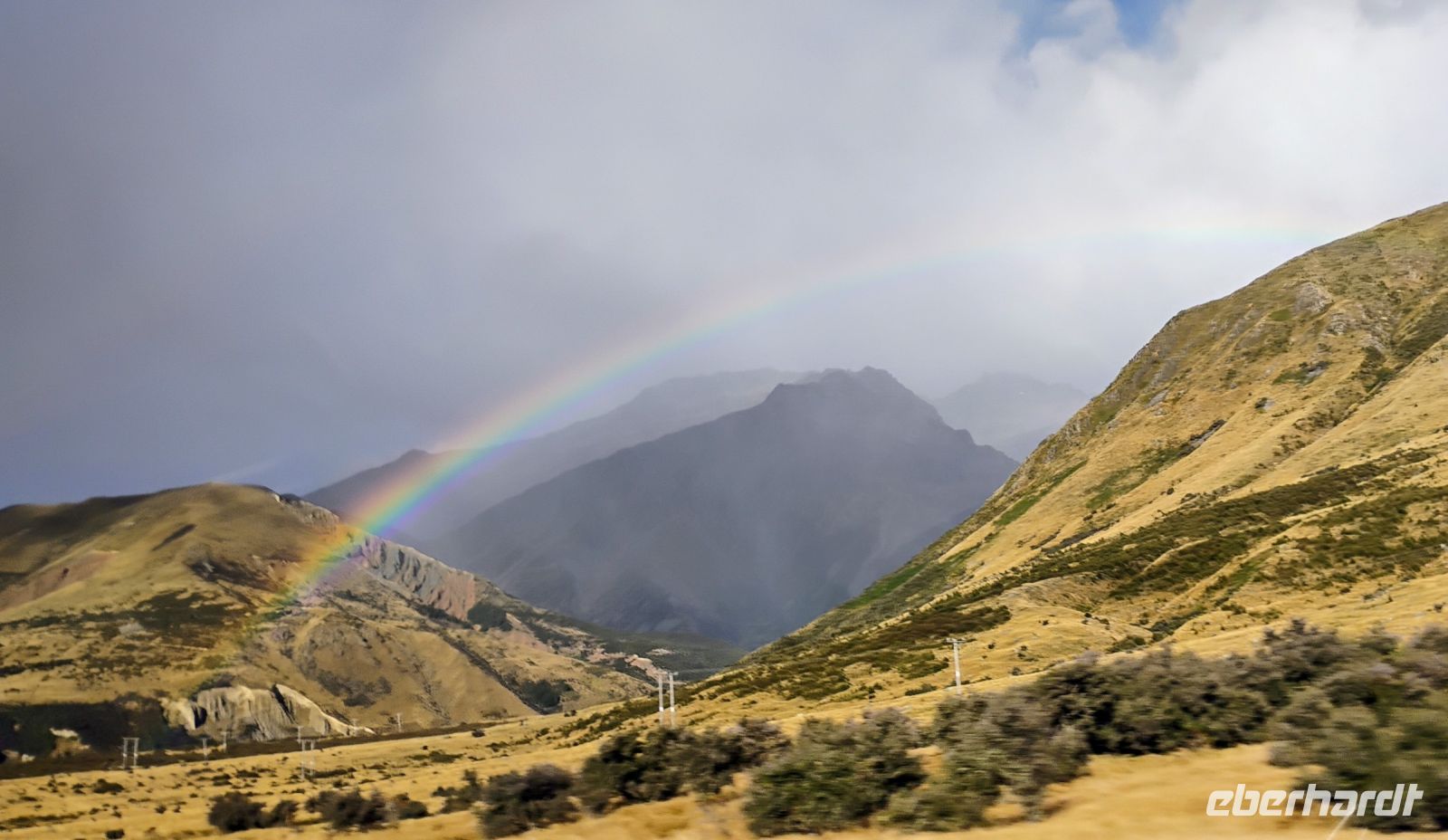 Auf der Weiterfahrt entlang des Pukaki-Sees hielten wir immer wieder an – die Landschaft war einfach zu spektakulär, um sie nur im Vorbeifahren zu betrachten. Ständig wechselten sich Sonne und Wolken ab, und mehr als ein Regenbogen begleitete uns erneut ein Stück unseres Weges.