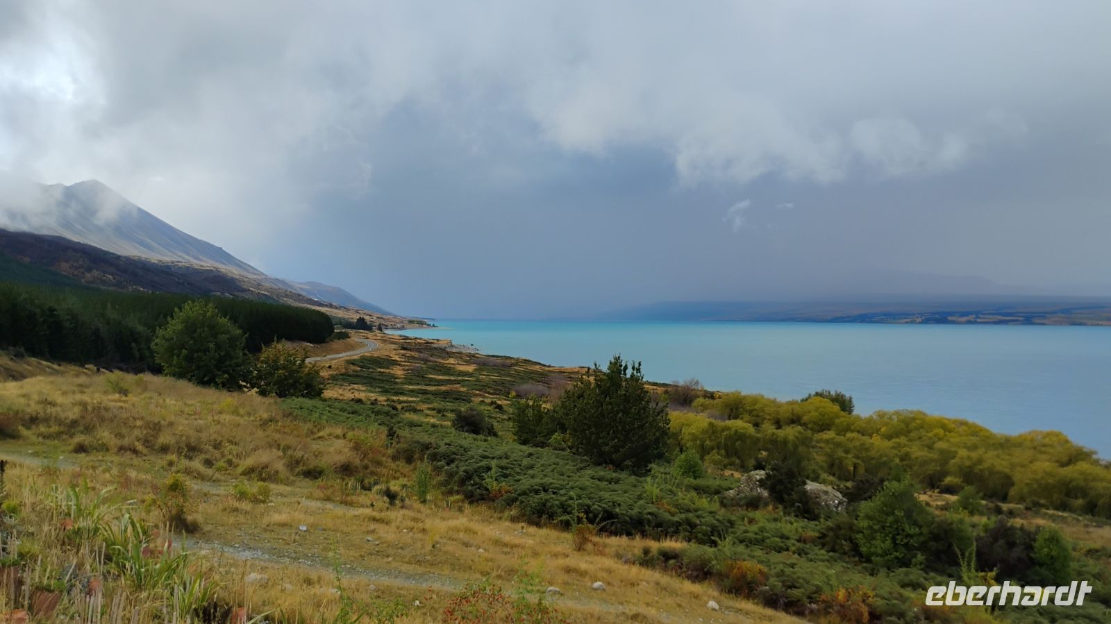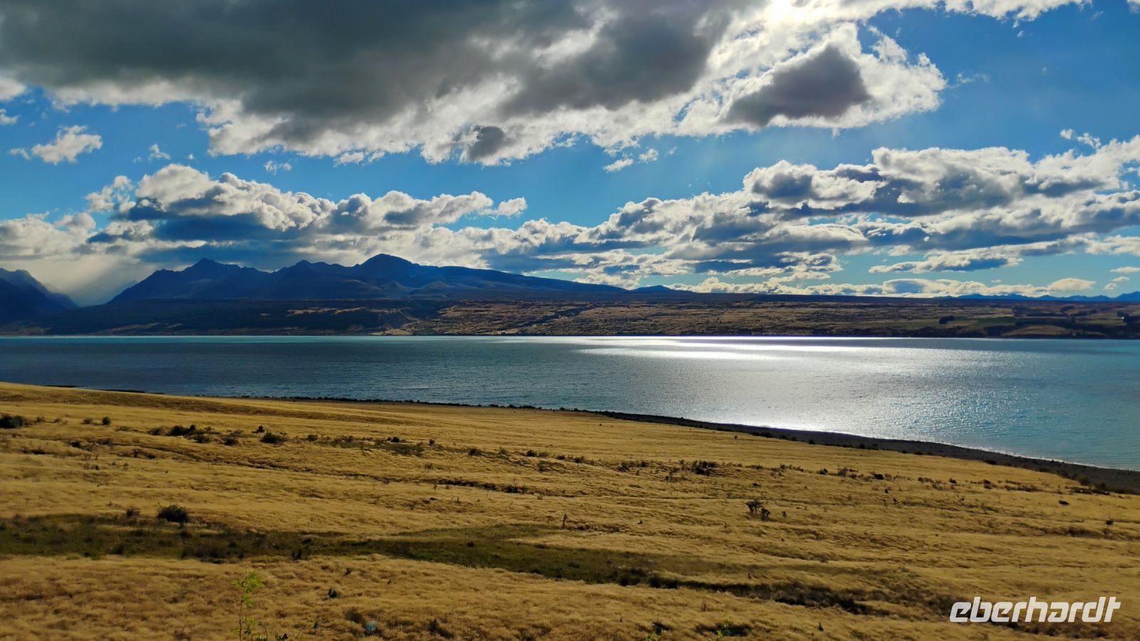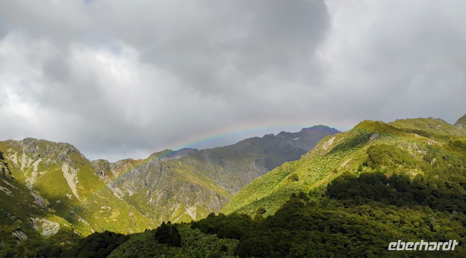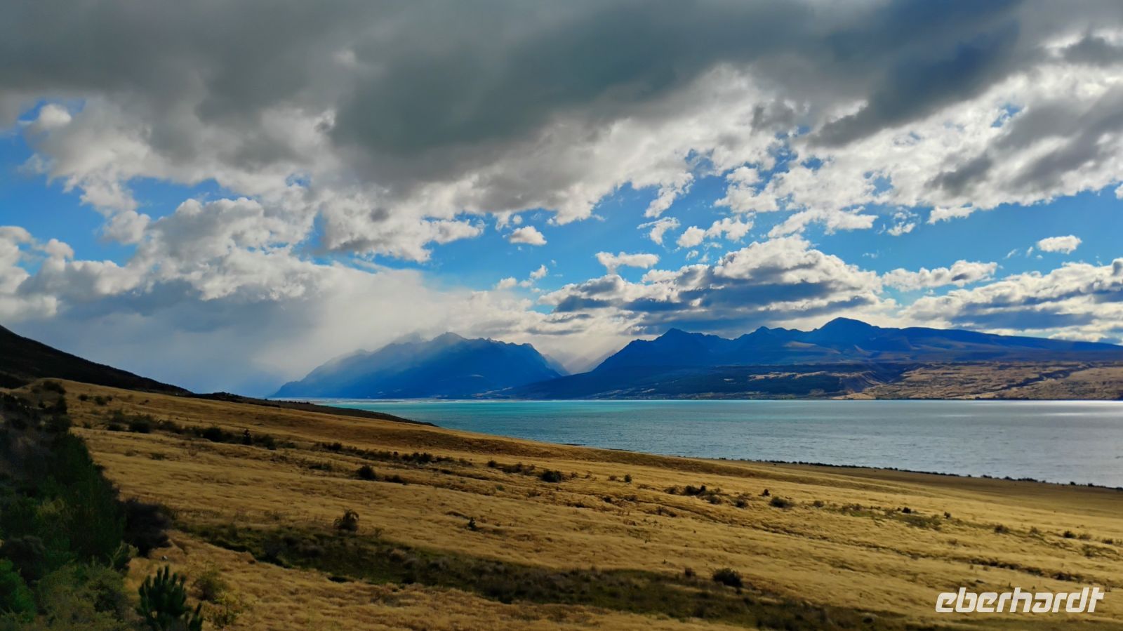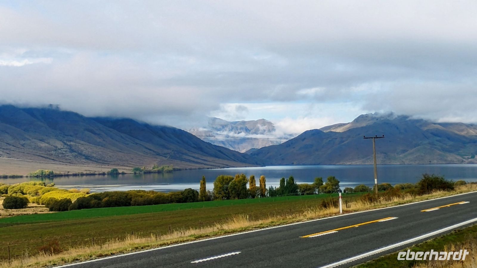 Auf der Weiterfahrt entlang des Pukaki-Sees hielten wir immer wieder an – die Landschaft war einfach zu spektakulär, um sie nur im Vorbeifahren zu betrachten. Ständig wechselten sich Sonne und Wolken ab, und mehr als ein Regenbogen begleitete uns erneut ein Stück unseres Weges.