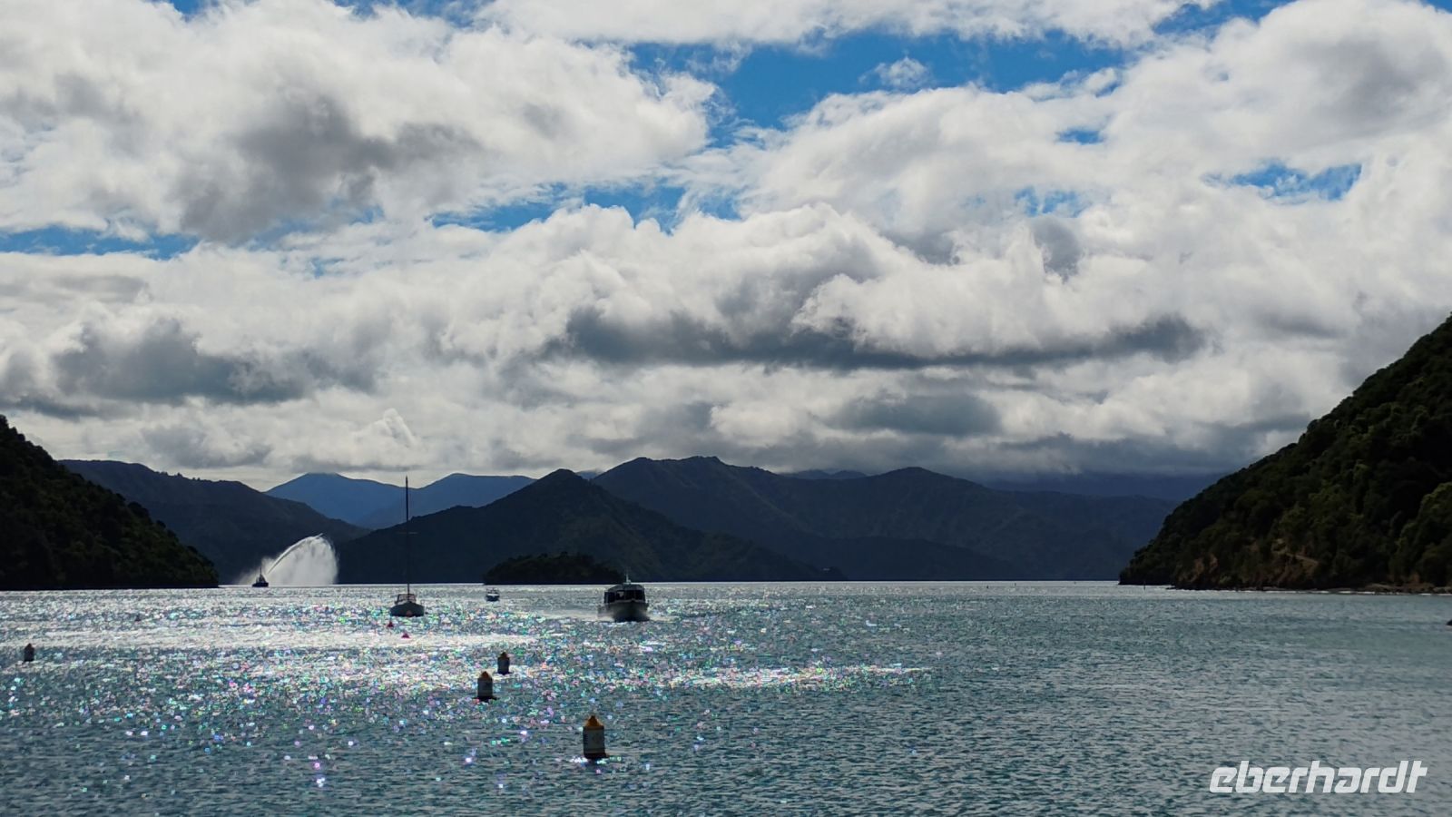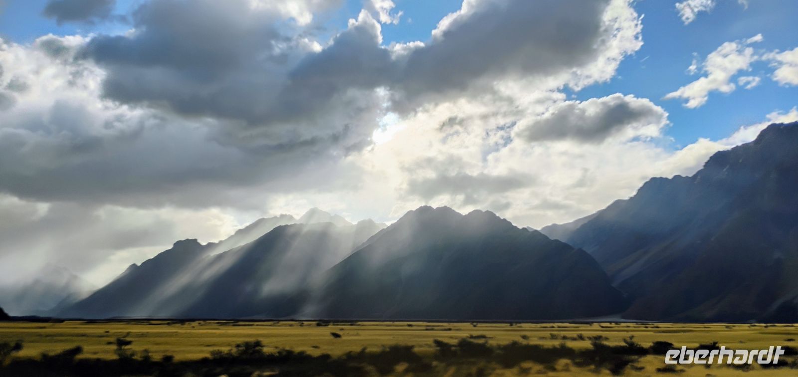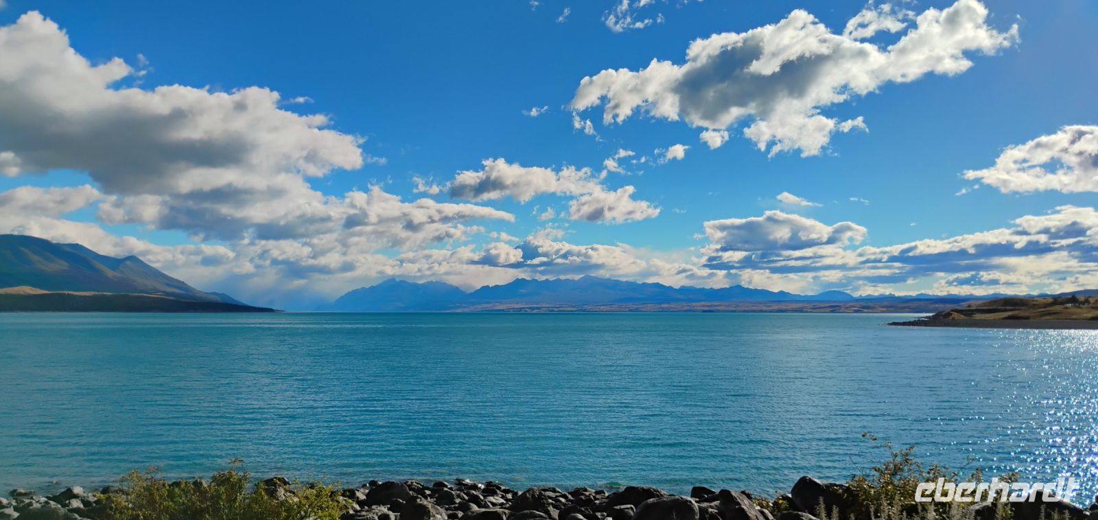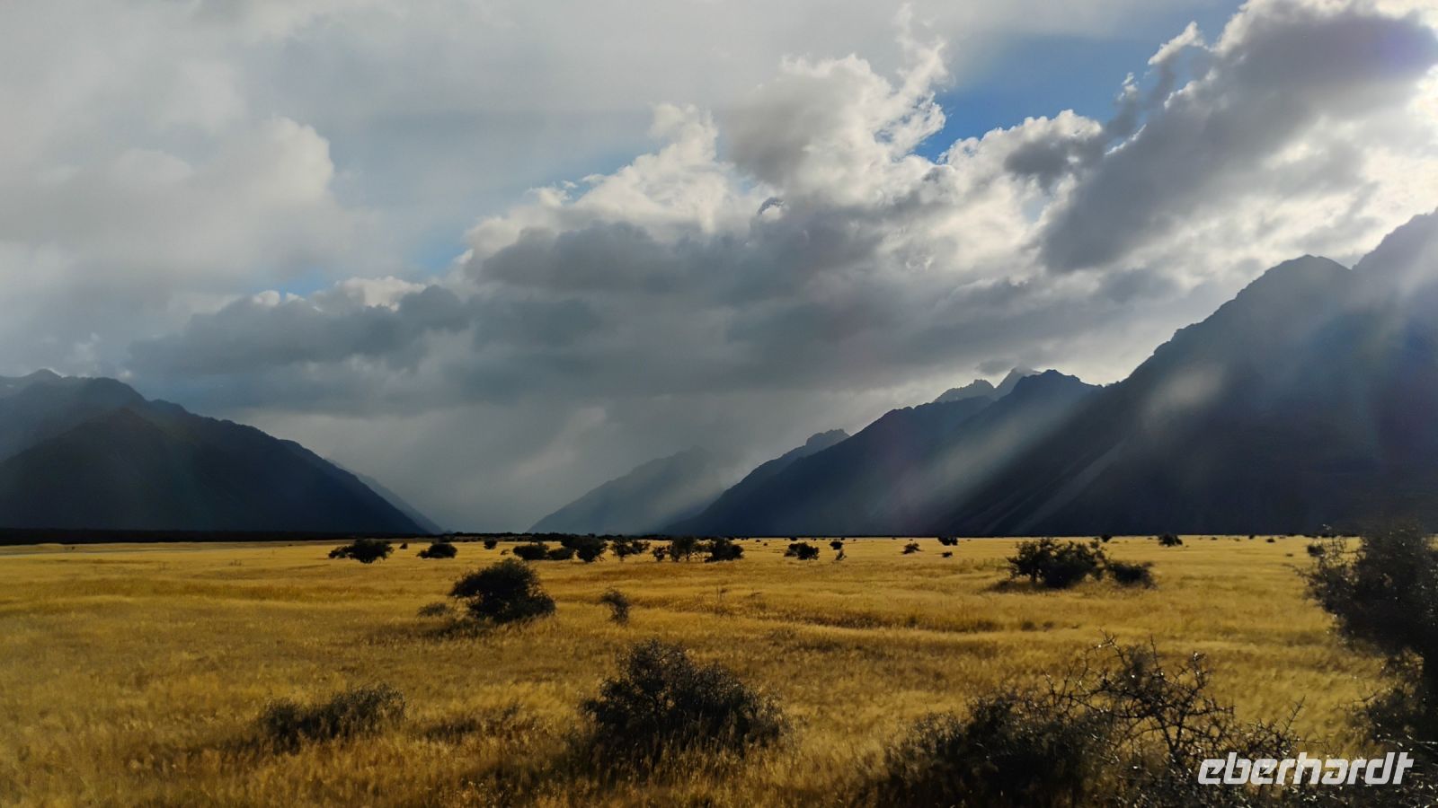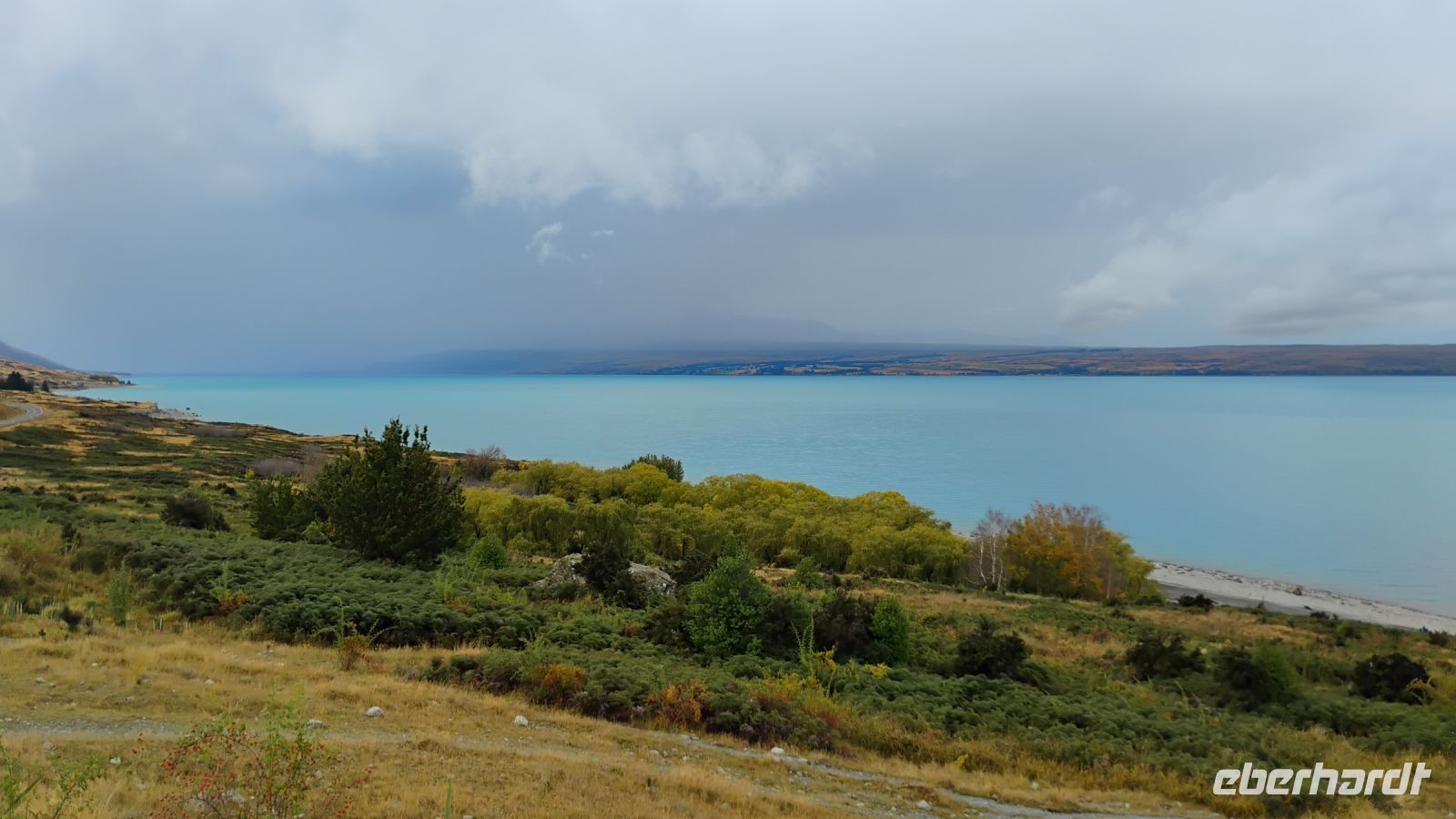 Auf der Weiterfahrt entlang des Pukaki-Sees hielten wir immer wieder an – die Landschaft war einfach zu spektakulär, um sie nur im Vorbeifahren zu betrachten. Ständig wechselten sich Sonne und Wolken ab, und mehr als ein Regenbogen begleitete uns erneut ein Stück unseres Weges.