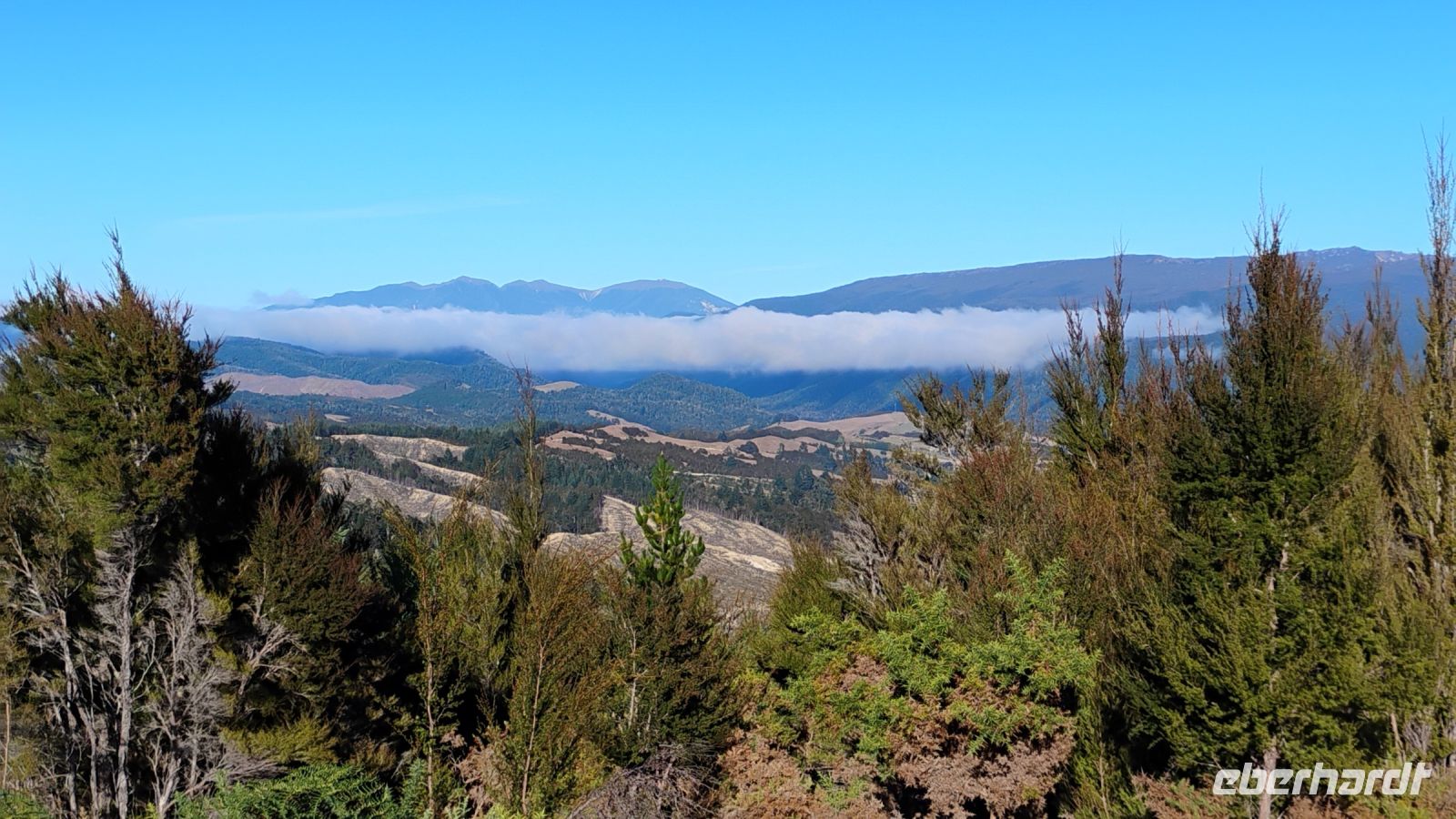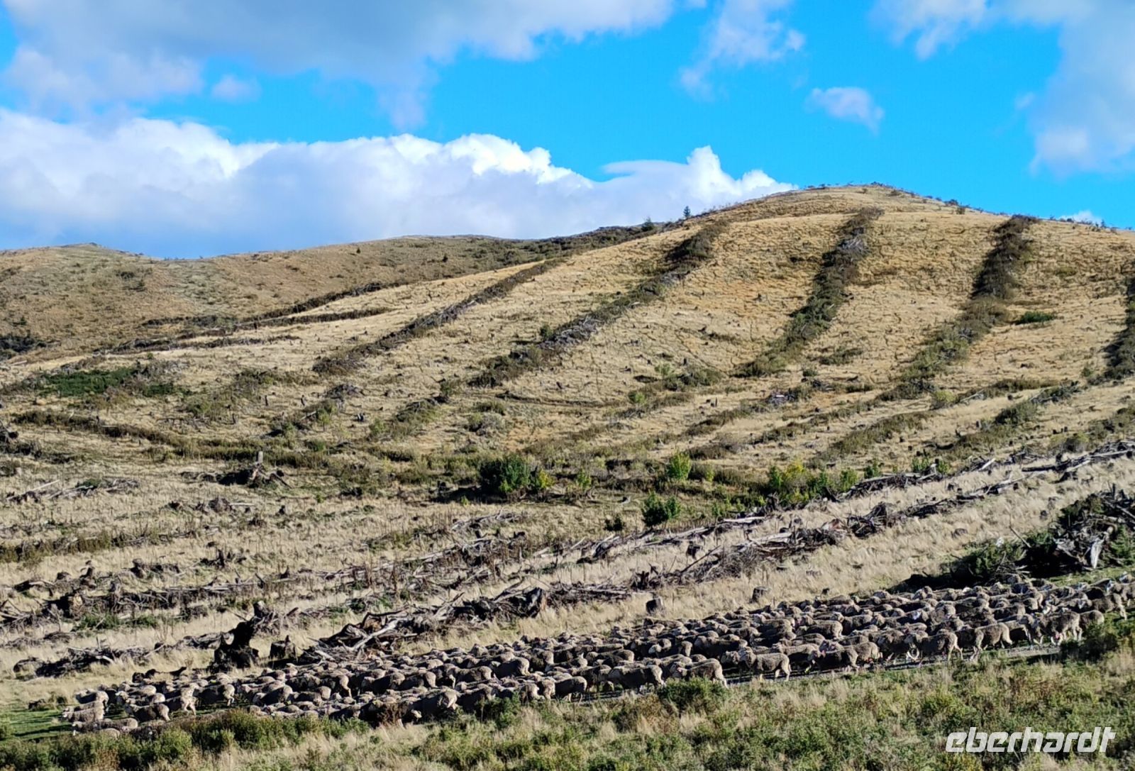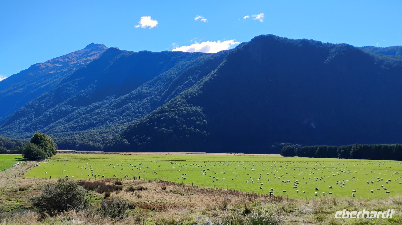 Auf unserer Weiterreise über den Haast-Pass erlebten wir einen markanten Wandel der Vegetation. Die zuvor dichten, moosbewachsenen Regenwälder wichen allmählich einer trockeneren Landschaft mit sanften Hügeln und Grasland, typisch für die Region Central Otago.