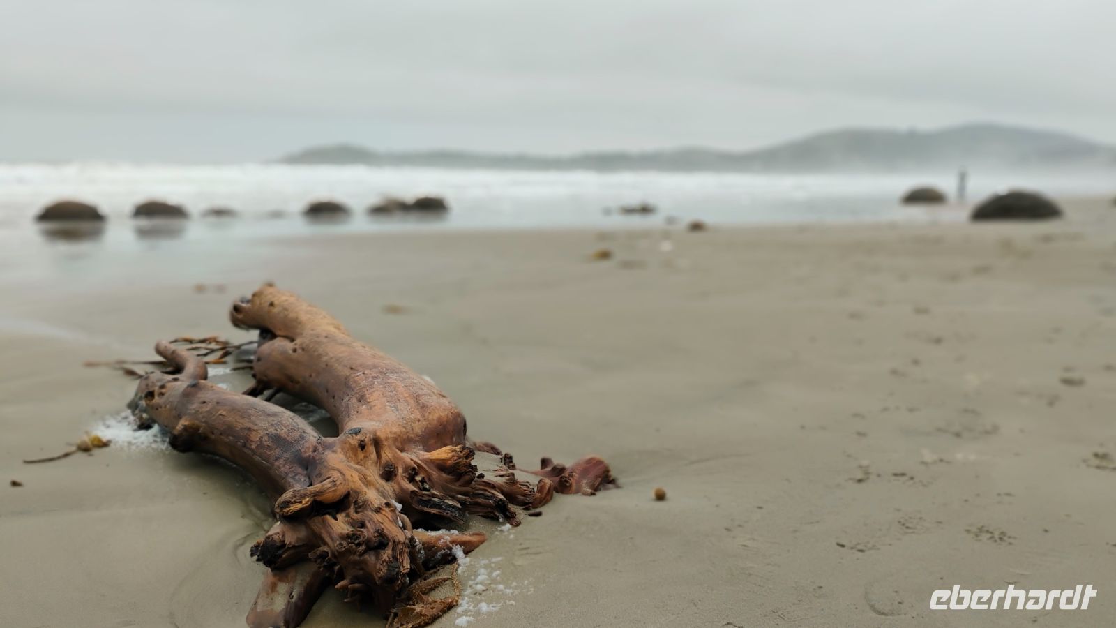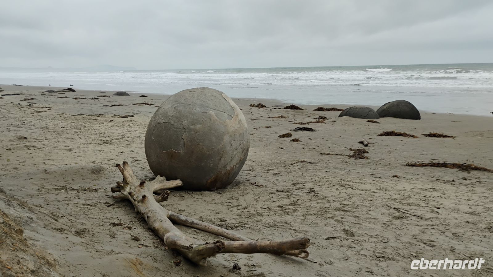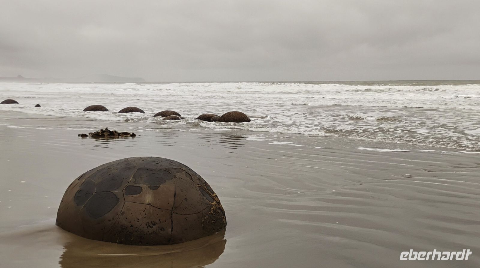 Anschließend besuchten wir die faszinierenden Moeraki Boulders, nahezu kugelförmige Felsbrocken mit einem Durchmesser von bis zu drei Metern. Diese entstanden durch die Zementation von Sedimenten auf dem Meeresboden und wurden durch Küstenerosion freigelegt. Die See zeigte sich heute unruhig und aufgewühlt, der Wind wehte über den Strand – doch gerade diese raue Atmosphäre verlieh dem Strand mit den urzeitlichen Steinen eine besondere Wirkung.