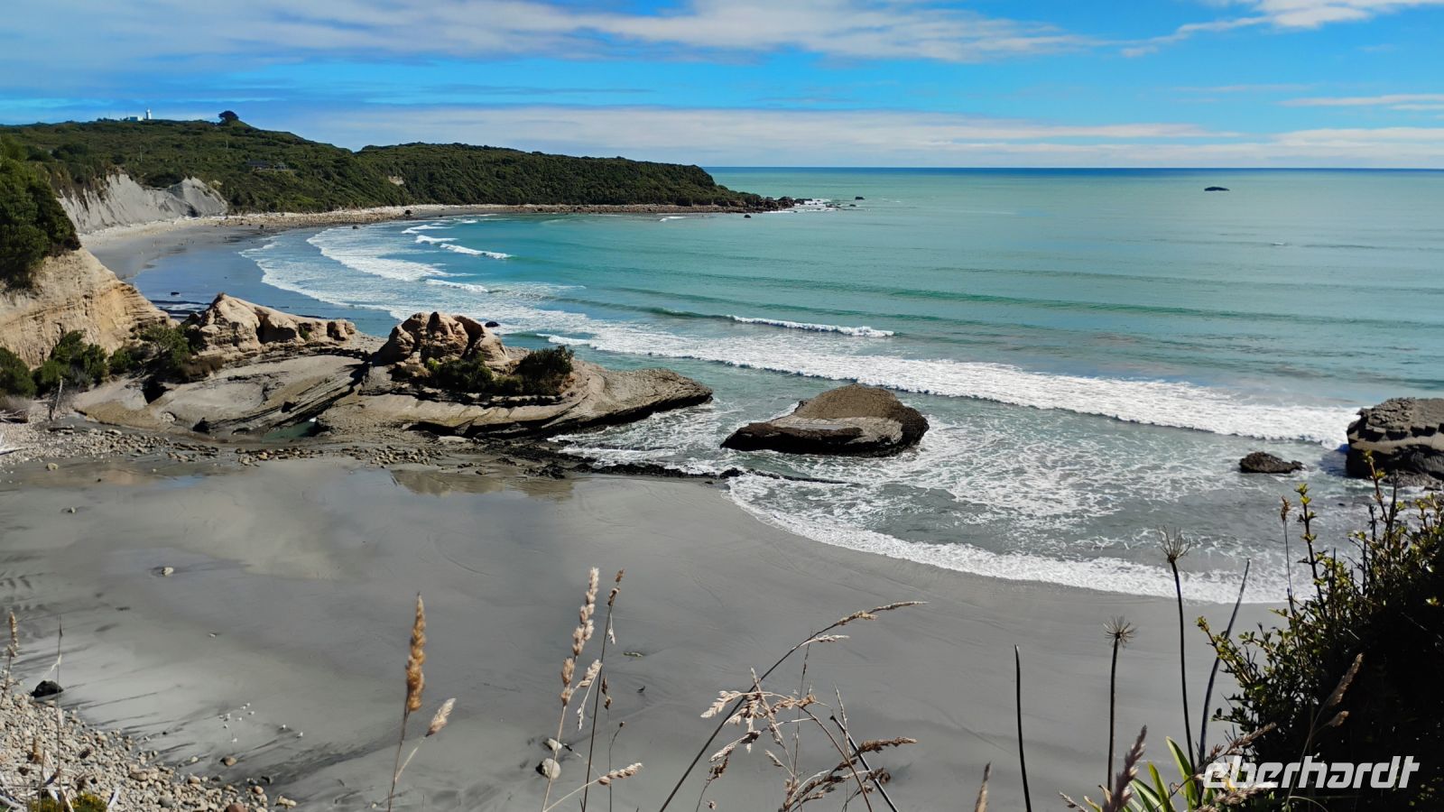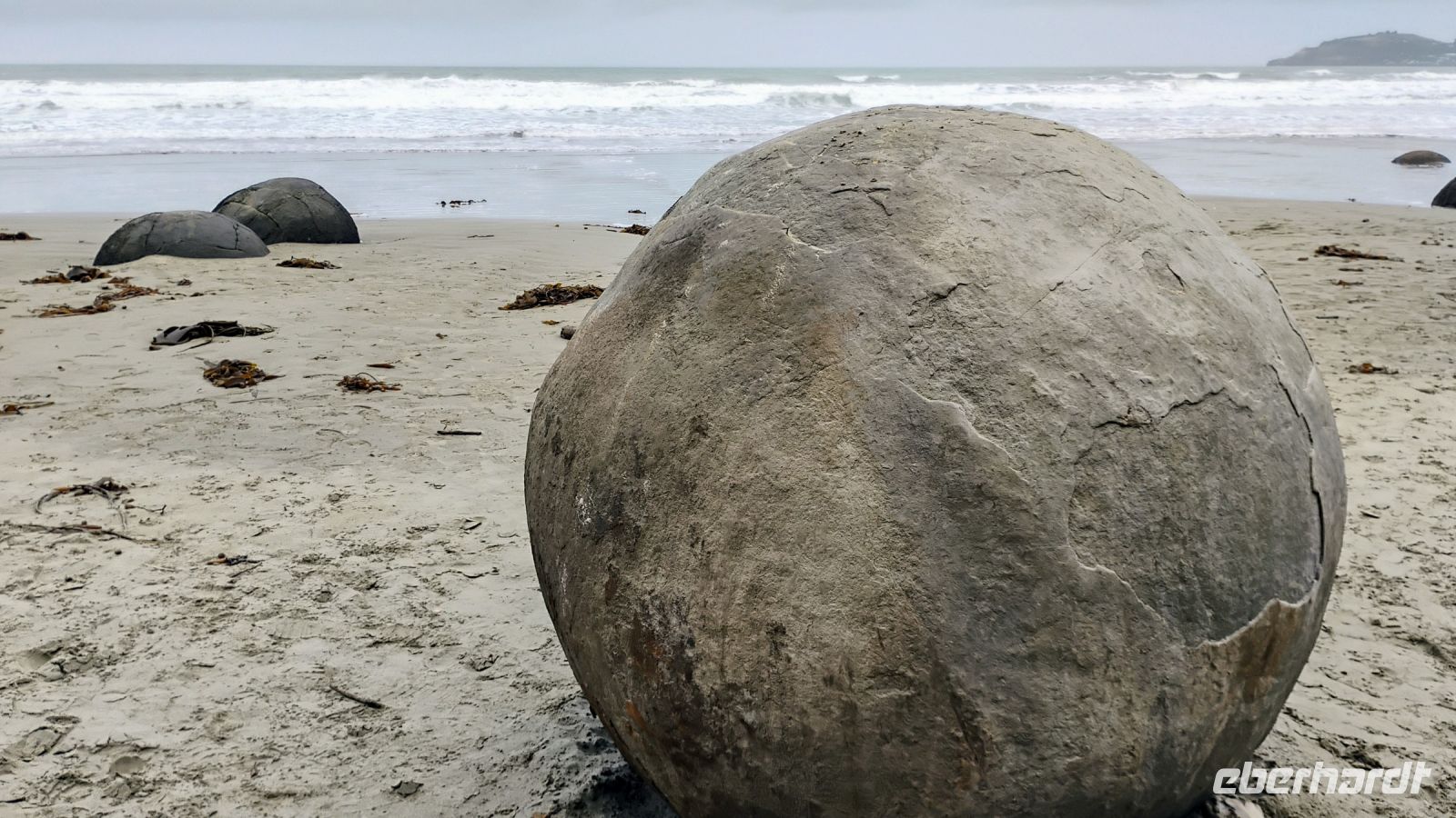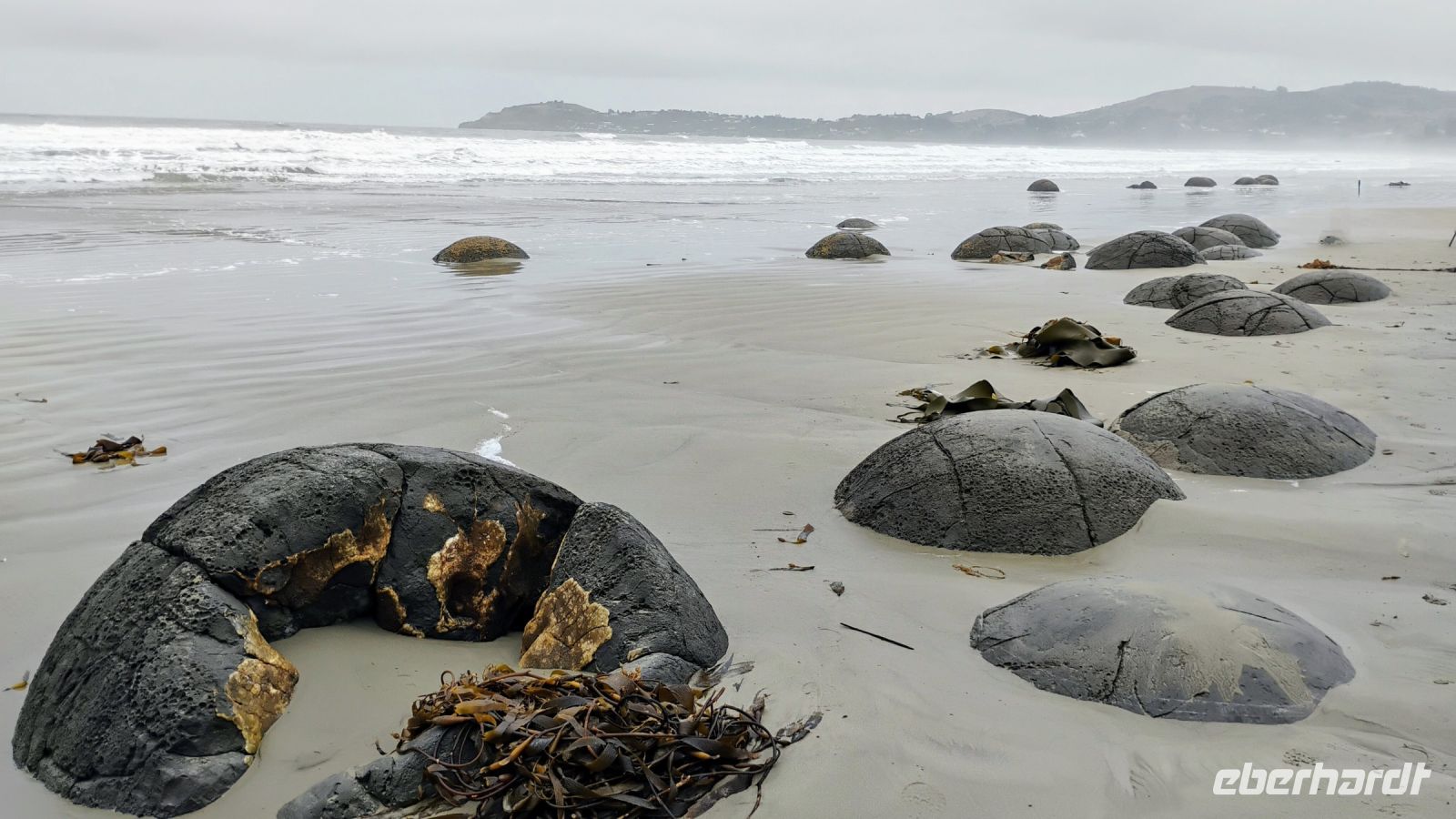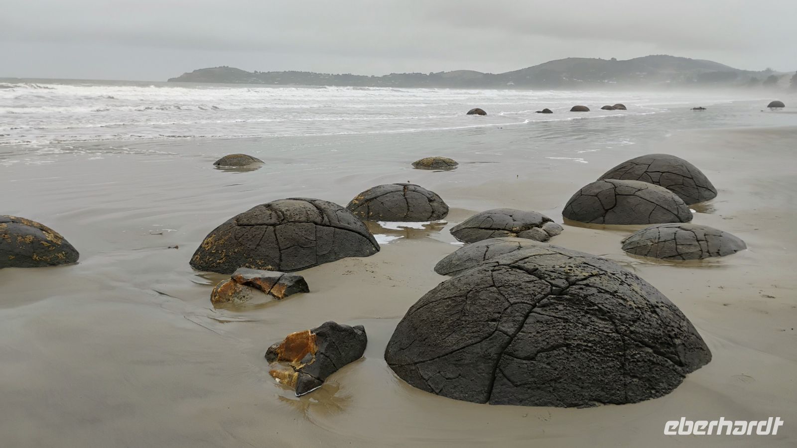 Anschließend besuchten wir die faszinierenden Moeraki Boulders, nahezu kugelförmige Felsbrocken mit einem Durchmesser von bis zu drei Metern. Diese entstanden durch die Zementation von Sedimenten auf dem Meeresboden und wurden durch Küstenerosion freigelegt. Die See zeigte sich heute unruhig und aufgewühlt, der Wind wehte über den Strand – doch gerade diese raue Atmosphäre verlieh dem Strand mit den urzeitlichen Steinen eine besondere Wirkung.