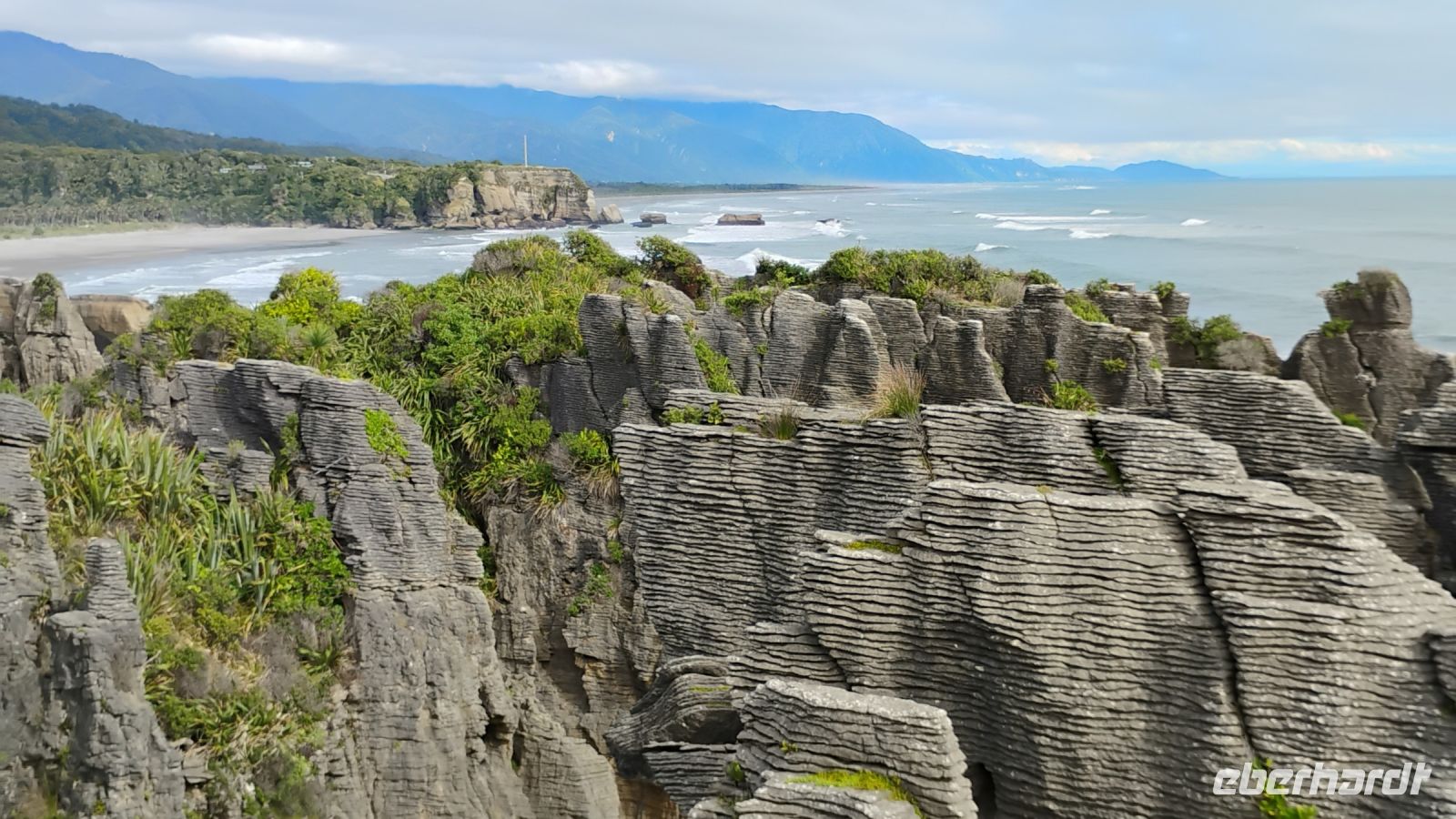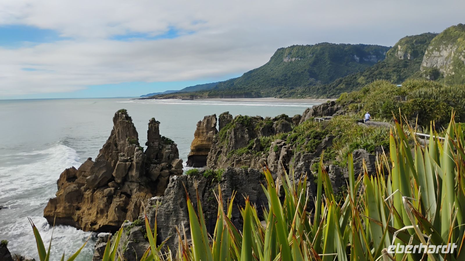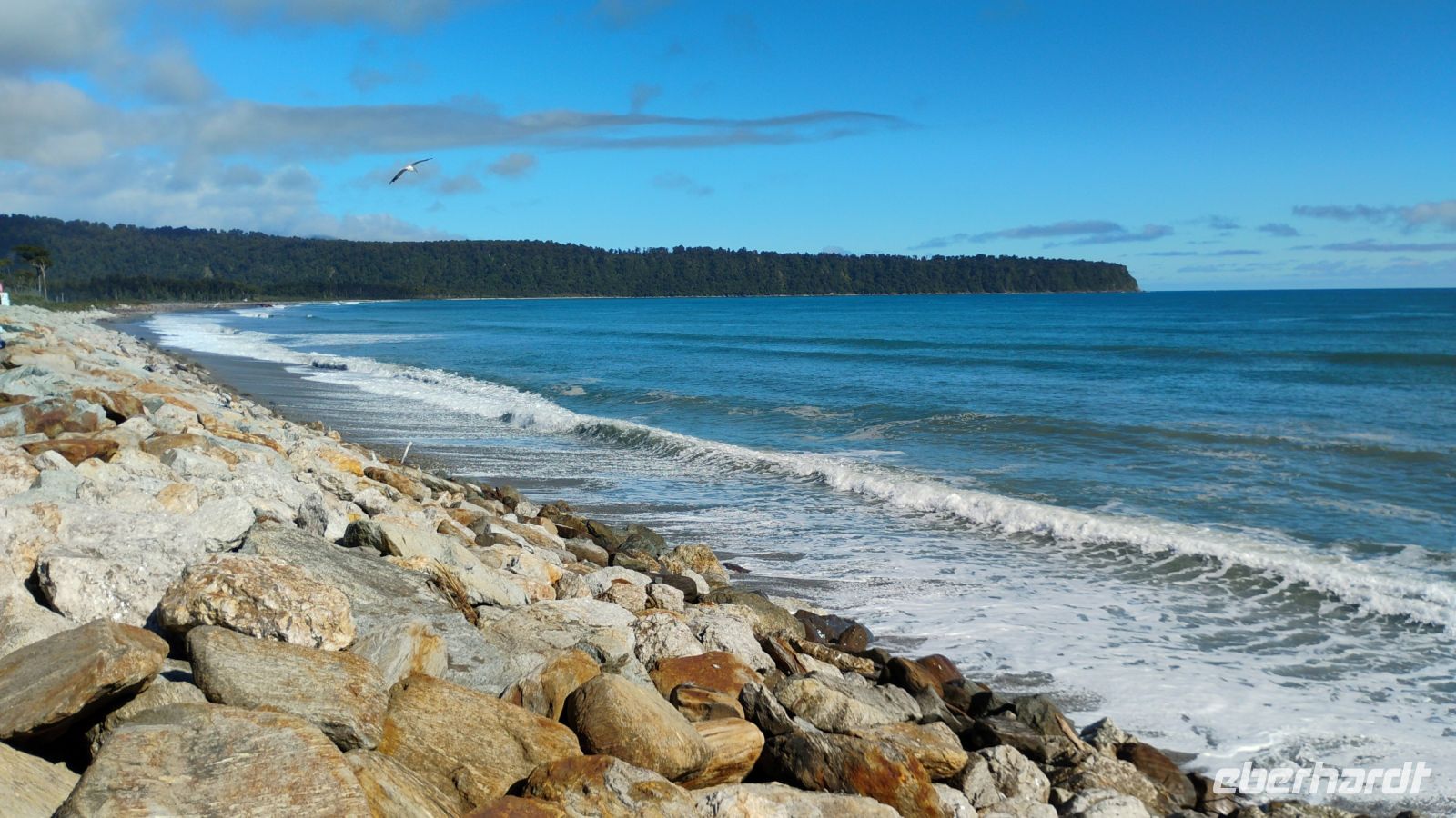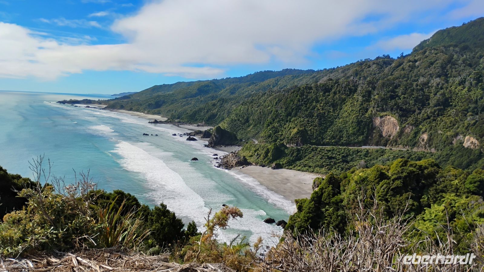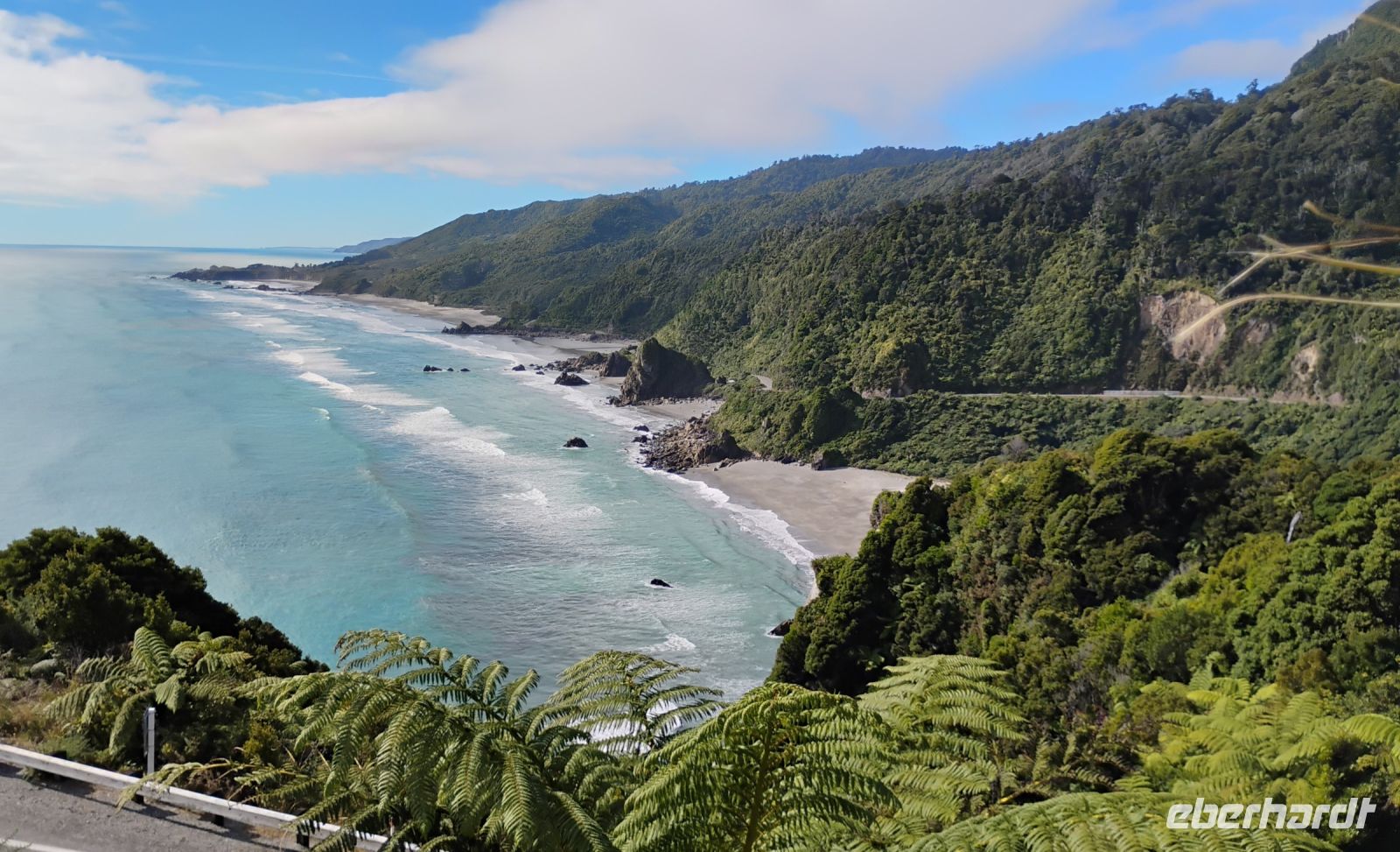 Dann setzten wir unsere Reise fort und legten immer wieder Fotostopps ein, etwa am Knights Point, wo wir die dramatische Küstenlinie bestaunten. Unsere Mittagspause verbrachten wir in dem kleinen Ort Haast.