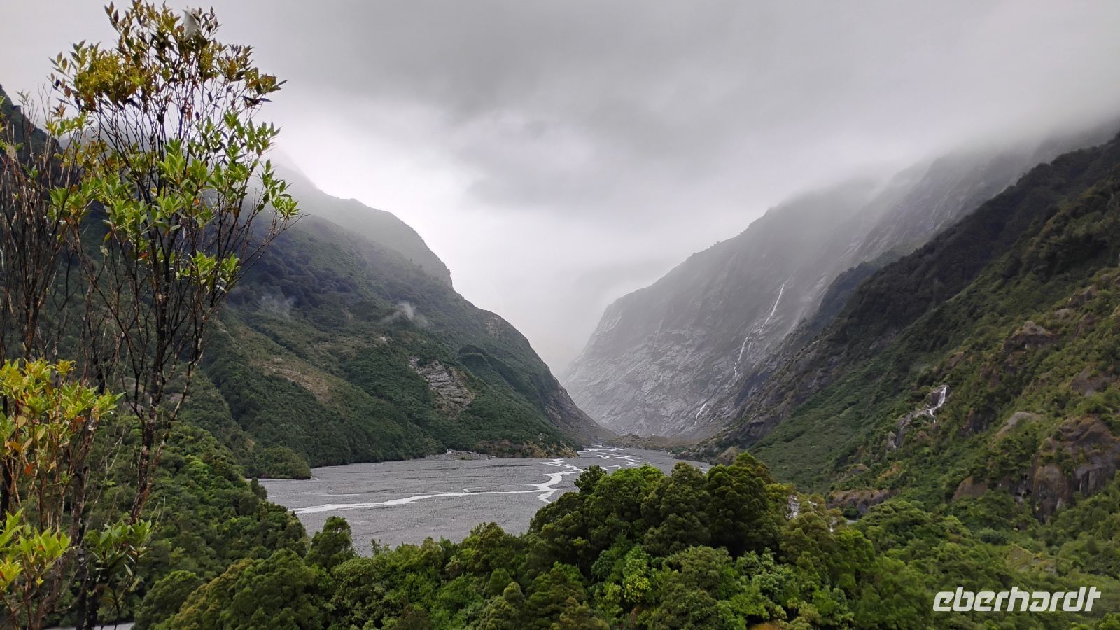 Kaum hatte der Regen nachgelassen, machten wir uns auf einen kurzen Spaziergang zum Aussichtspunkt des Franz-Josef-Gletschers. Auch wenn der Gletscher mittlerweile nicht mehr sichtbar war, da er sich im Laufe der Jahre stark zurückgezogen hatte, konnte man an der kargen Felslandschaft noch erahnen, wie gewaltig er einst war.