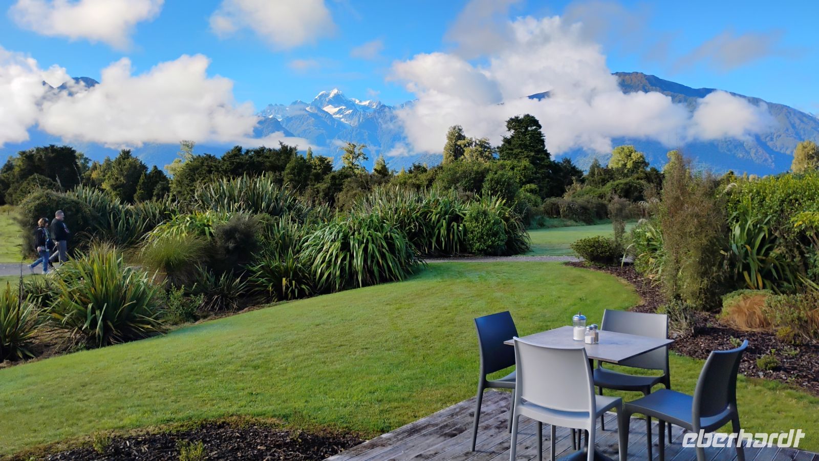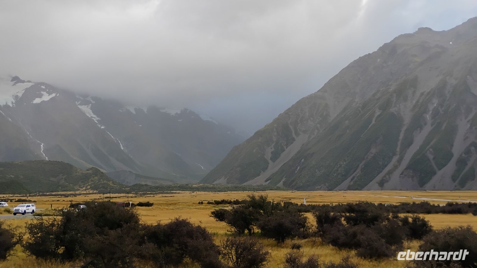 Der Tag begann mit einem Frühstück im luxuriösen Hotel Hermitage – ein wahrer Genuss, begleitet von einer riesigen Glasfront, die eigentlich einen spektakulären Blick auf die umliegende Bergwelt bieten sollte. Doch Mount Cook versteckte sich hartnäckig hinter dichten Wolken, und so blieb uns der erhoffte Anblick verwehrt.