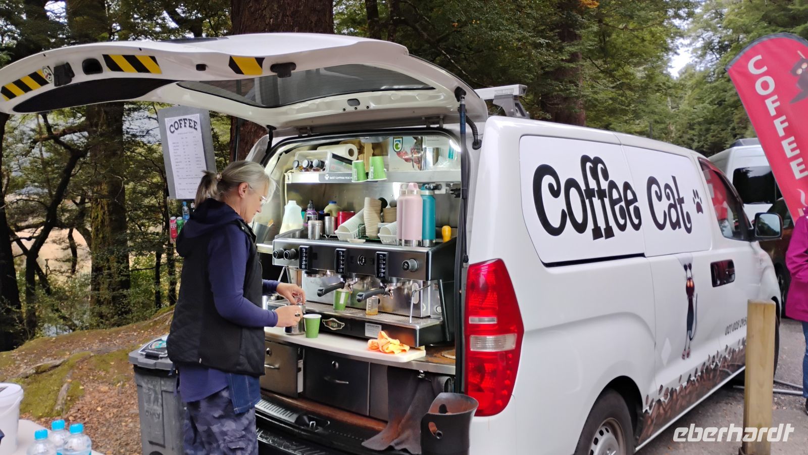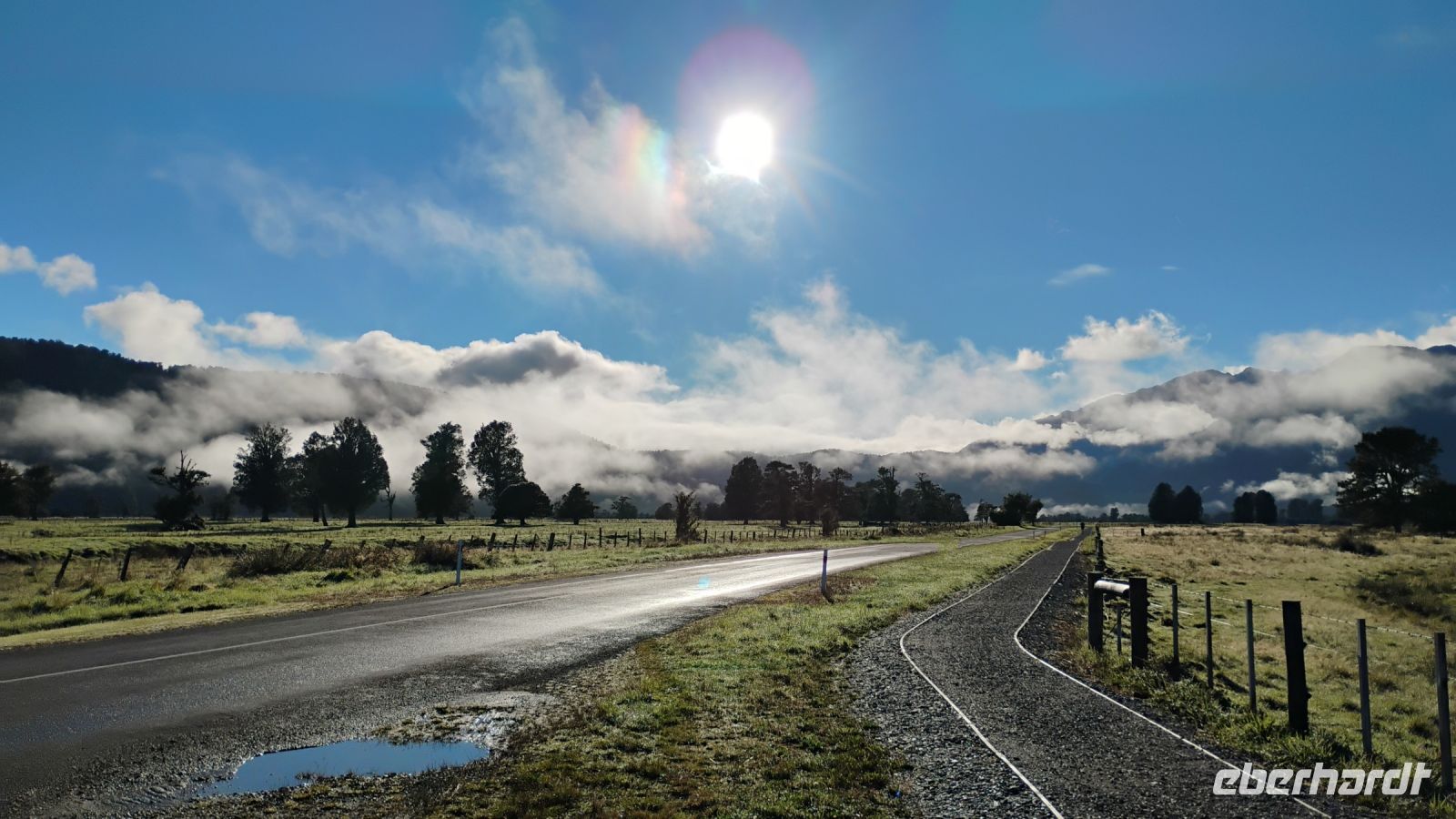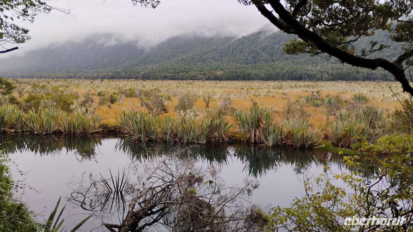 Der Morgen begann mit tiefhängenden Wolken und leichtem Nieselregen, als wir uns auf den Weg zum Milford Sound machten. Unsere ersten Stopps entlang der Strecke führten uns durch das Eglington Valley, unter anderem zu den malerischen Mirror Lakes, deren spiegelnde Wasserflächen sich heute jedoch ohne Berge zeigten. Am Ende des kurzen Spaziergangs nutzten einige die Gelegenheit für einen leckeren Cappuccino am kleinen Coffee-Van.