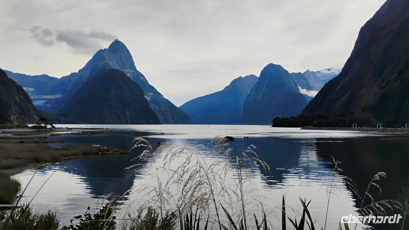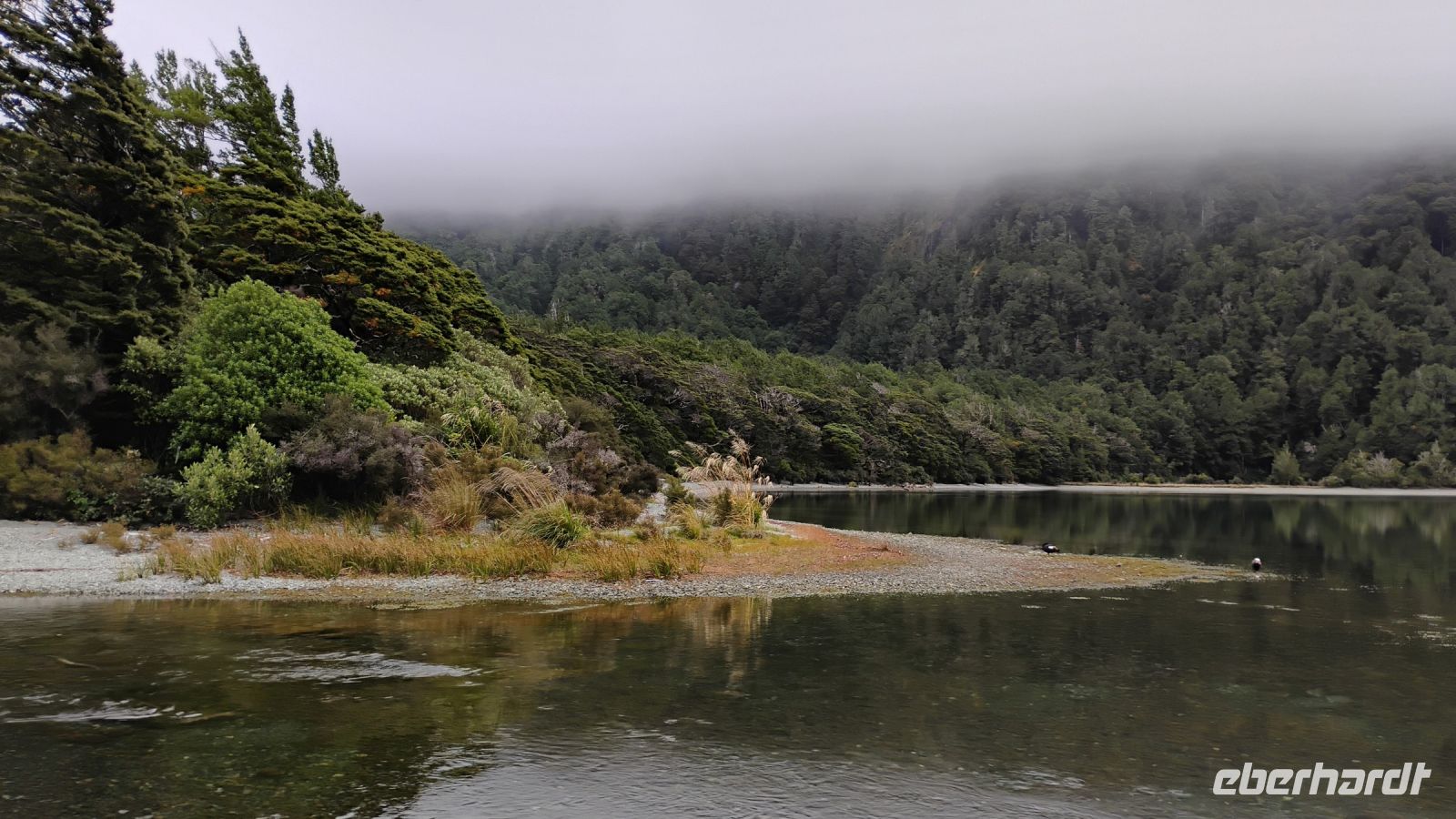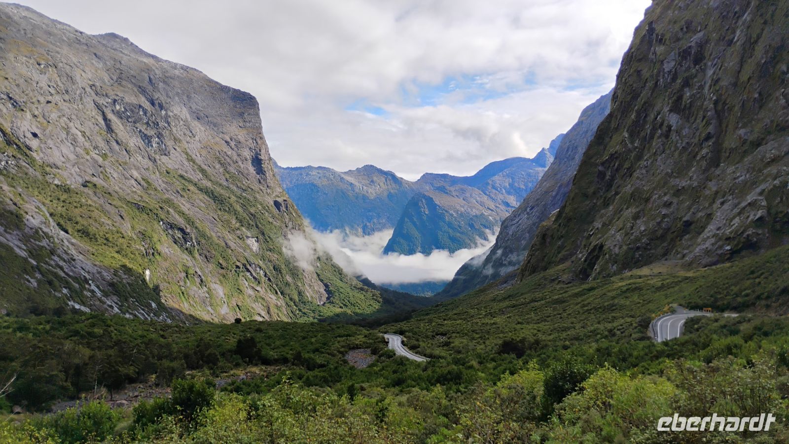 Der Morgen begann mit tiefhängenden Wolken und leichtem Nieselregen, als wir uns auf den Weg zum Milford Sound machten. Unsere ersten Stopps entlang der Strecke führten uns durch das Eglington Valley, unter anderem zu den malerischen Mirror Lakes, deren spiegelnde Wasserflächen sich heute jedoch ohne Berge zeigten. Am Ende des kurzen Spaziergangs nutzten einige die Gelegenheit für einen leckeren Cappuccino am kleinen Coffee-Van.
