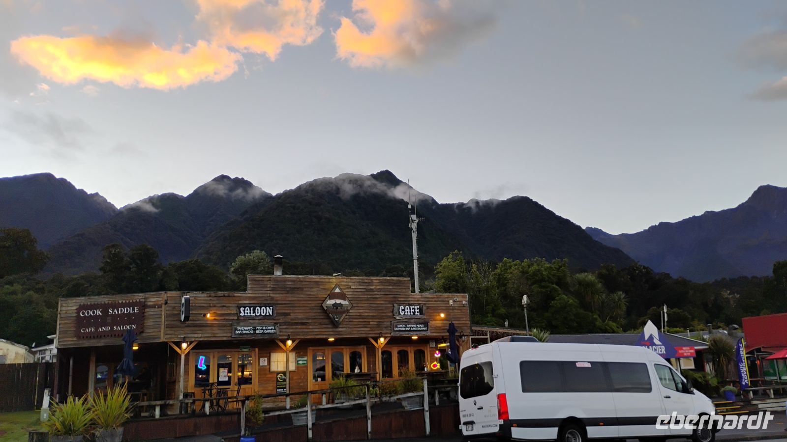 Weiter ging es durch dichte Regenwälder, vorbei am stillen Lake Mahinapua und den historischen Ross Goldfields – dort wurde einst das größte Goldnugget Neuseelands mit einem Gewicht von 2,8 Kilogramm gefunden. Schließlich erreichten wir Franz Josef, wo wir uns bei einer Mittagspause stärkten.