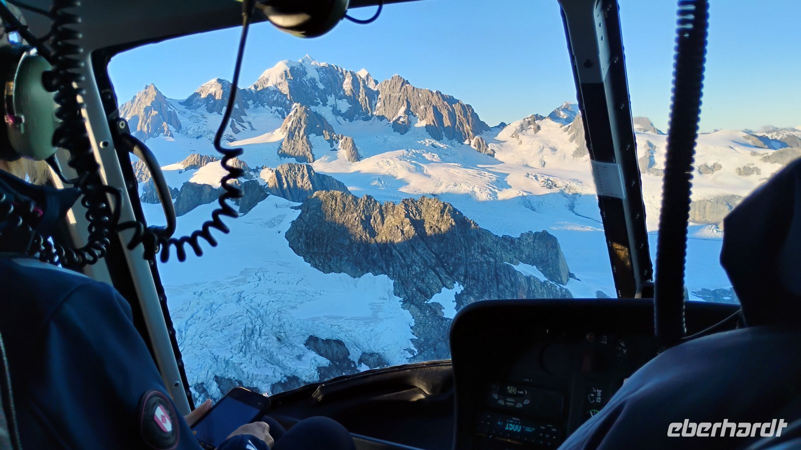 Unser Tag begann früh – zumindest für vier Frauen unserer Gruppe, die sich für ein ganz besonderes Abenteuer entschieden hatten: einen Helikopterflug über die Bergwelt mit Landung auf dem Gletscher. Die Aufregung war spürbar, als wir um 8:00 Uhr am Helikopterzentrum eintrafen und eine ausführliche Einweisung erhielten. Doch sobald wir um 8:30 Uhr abhoben, wich die Nervosität purem Staunen. Der Flug bot uns spektakuläre Ausblicke auf die gewaltige Gletscherlandschaft und die majestätischen Südalpen. Unser erfahrener Pilot Gable – jung, charmant und souverän – schien sich über unsere überschwängliche Begeisterung ein wenig zu amüsieren. Für uns jedoch war es ein unvergessliches Erlebnis!