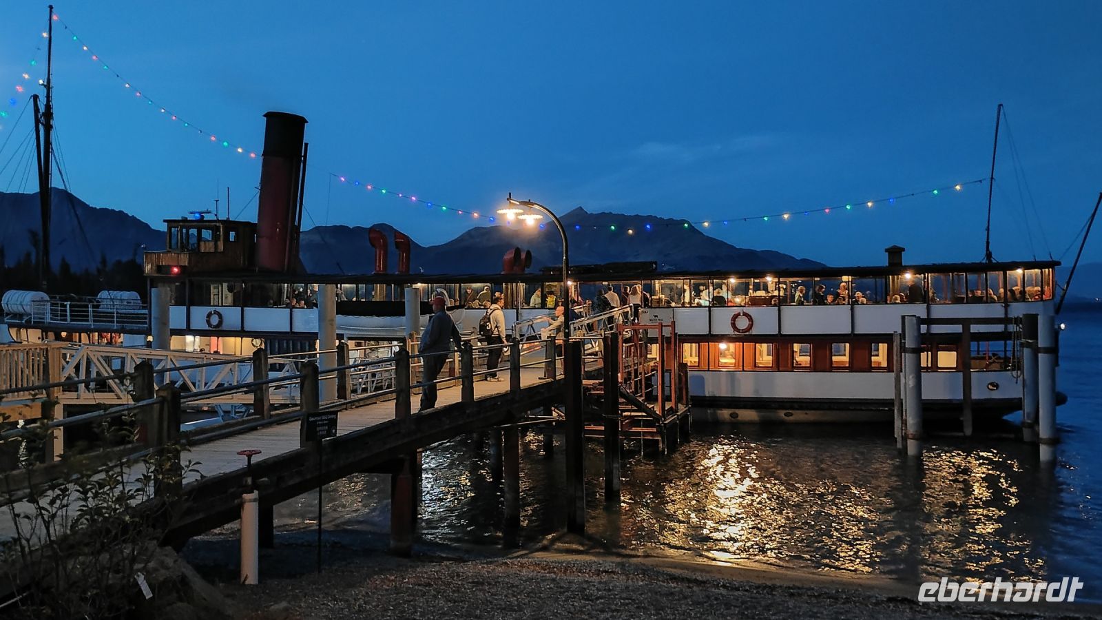 Bei Dunkelheit traten wir die Rückfahrt mit dem Dampfschiff an. An Bord spielte ein Pianist, und es lagen Liedtexte aus – eine Einladung zum Mitsingen, die von Passagieren aus aller Welt und auch von uns sofort angenommen wurde. Die abendliche Überfahrt bot eine ganz besondere Atmosphäre – die funkelnden Lichter von Queenstown spiegelten sich im Wasser, während der Dampfer seinen Weg zurück zum Pier bahnte. Nach einem kurzen Spaziergang erreichten wir schließlich unser Hotel.