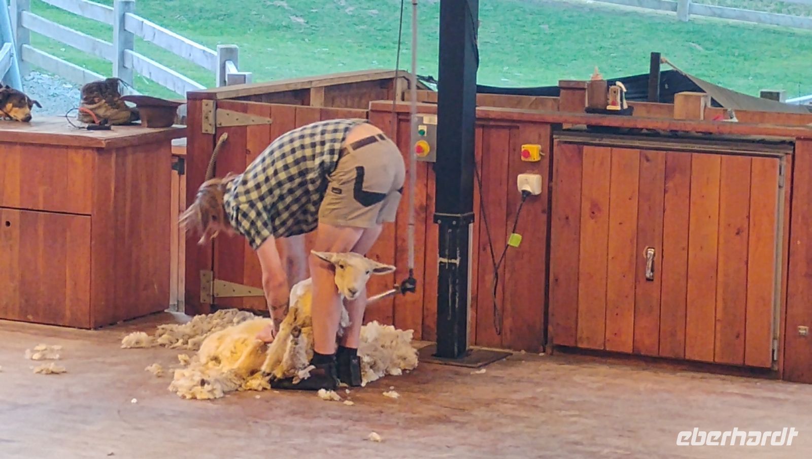 Um 17:00 Uhr legte die majestätische TSS Earnslaw ab, ein über 100 Jahre alter Dampfer, und brachte uns in gemächlichem Tempo über den Wakatipu-See zur Walter Peak High Country Farm. Dort erwartete uns ein köstliches Buffet. Anschließend erlebten wir eine Farmshow, bei der uns vorgeführt wurde, wie Hütehunde die Schafe mit erstaunlicher Präzision lenken und ein geübter Schäfer ein Schaf in weniger als eine Minute schert.