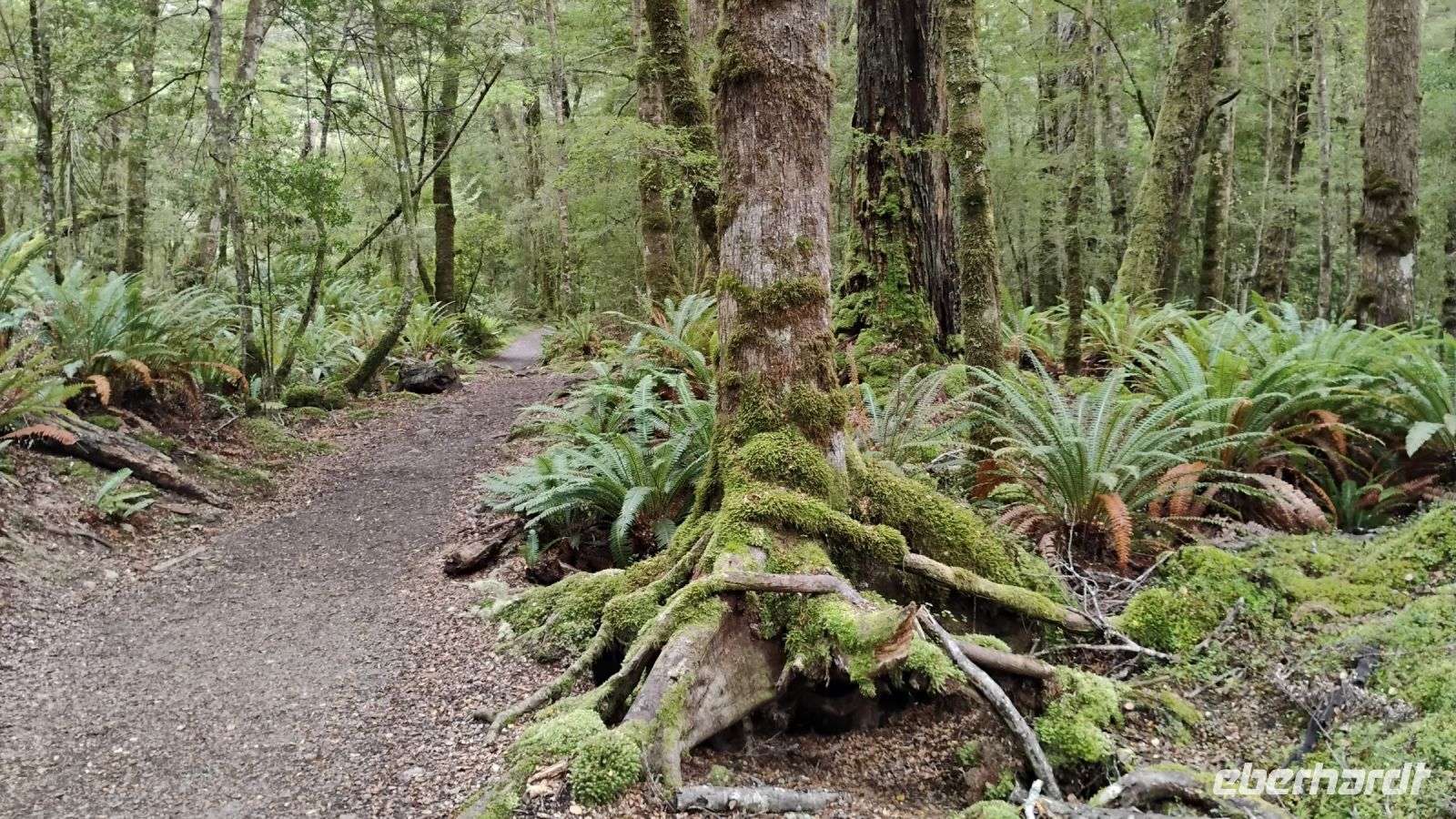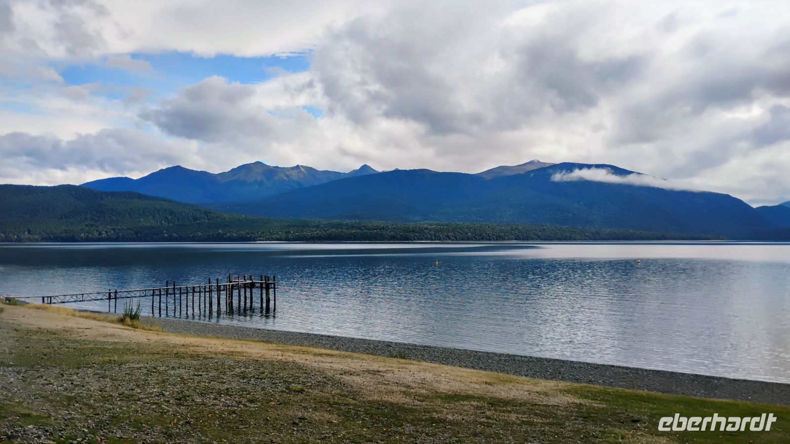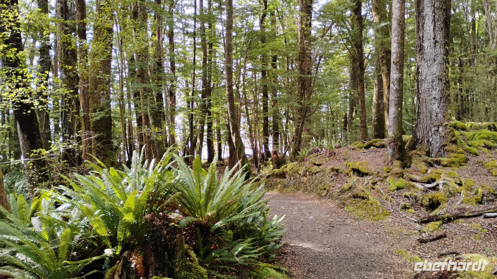 Nach einer frühen Mittagspause begaben wir uns auf eine Wanderung entlang eines Teilstücks des berühmten Kepler Tracks. Der gut ausgebaute Wanderweg führte uns durch typisch neuseeländischen Buchenwald, vorbei an unterschiedlichen Pilzen, Farnen und moosbewachsenen Bäumen. Immer wieder boten sich herrliche Ausblicke auf den Lake Te Anau, der sich malerisch in die Landschaft einfügt. Das Wetter war einmal wieder besser als die Vorhersage und das Spiel aus Licht und Schatten schuf eine ganz besondere Atmosphäre.