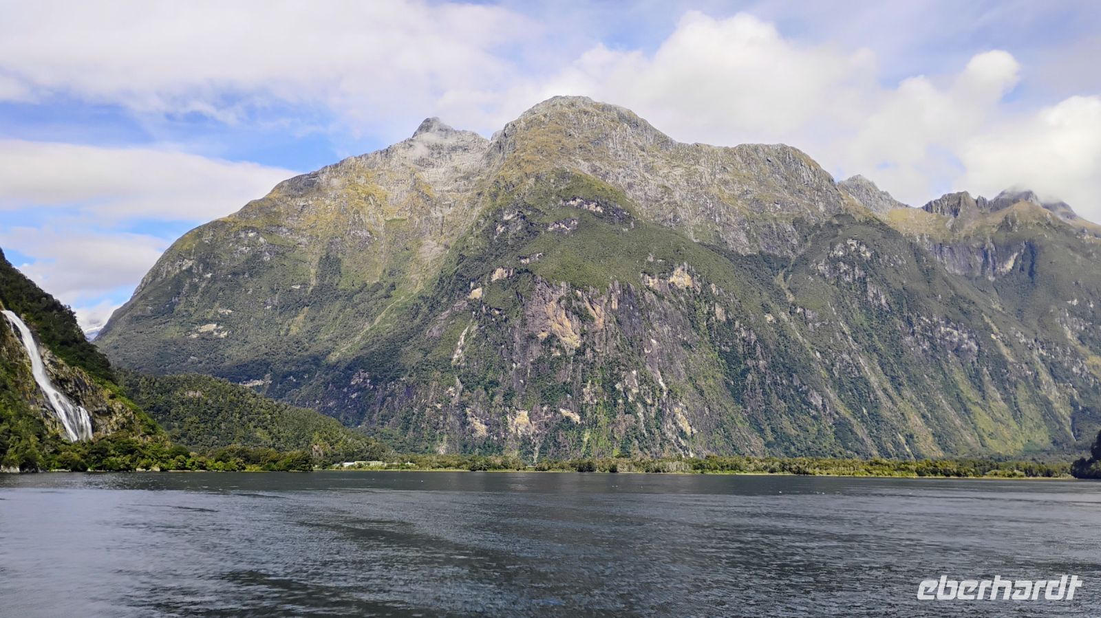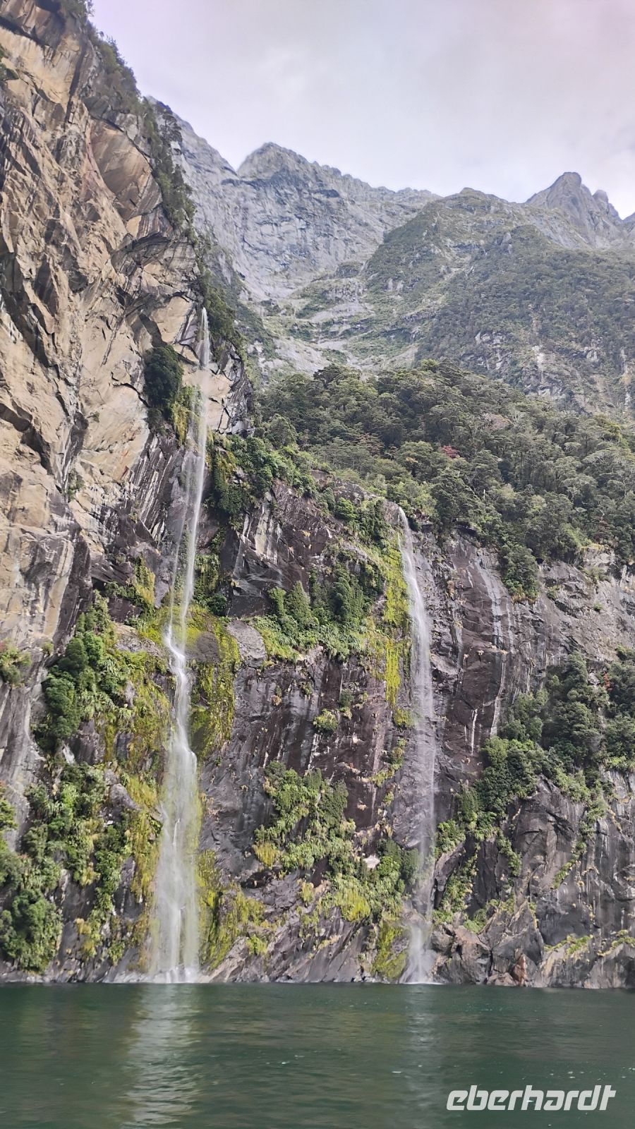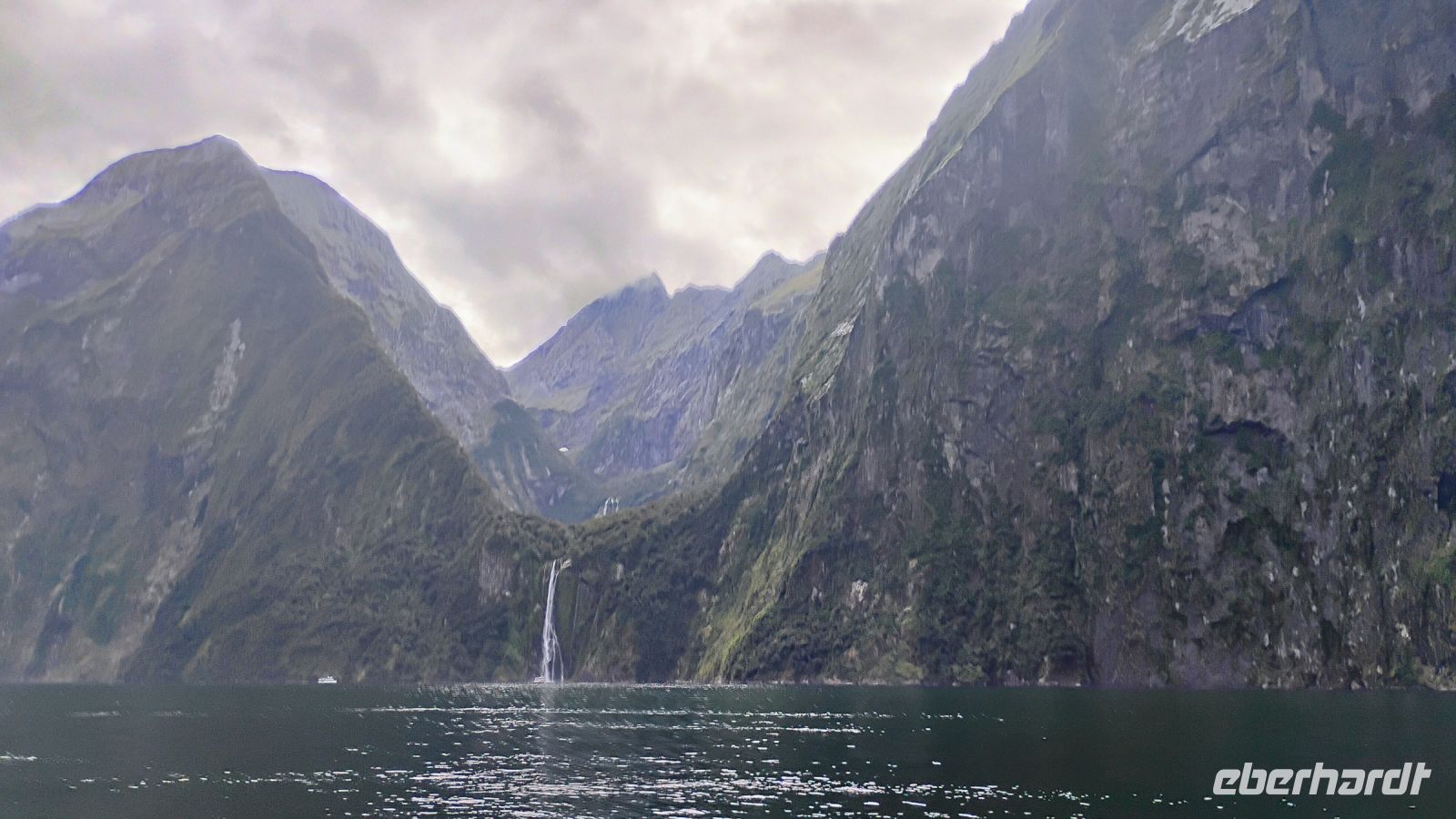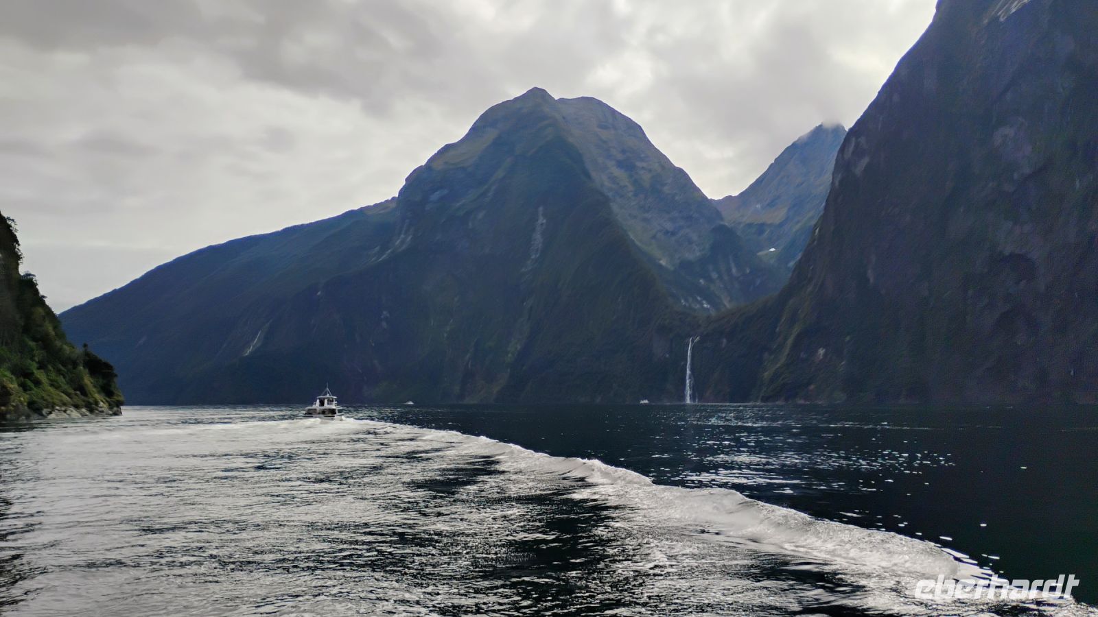 Schließlich waren wir am Milford Sound angekommen, dem eigentlichen Ziel unseres Tagesausflugs. Der Milford Sound ist ein beeindruckender Fjord im Fiordland-Nationalpark und zählt zu den bekanntesten Naturwundern Neuseelands. Mit seinen steilen Felswänden und den zahlreichen Wasserfällen, bietet er eine atemberaubende Kulisse. Die Region ist für ihre hohen Niederschlagsmengen bekannt – umso mehr waren wir glücklich, einen der regenfreien Tage hier erwischt zu haben! Wir unternahmen zunächst einen kurzen Spaziergang entlang des Foreshore Walks mit wunderbaren Blick auf den imposanten Mitre Peak bevor wir an Bord unseres Schiffes gingen. Die Fahrt durch den fjordartigen Sound war schlicht atemberaubend. Wasserfälle stürzten aus schwindelerregender Höhe in die Tiefe, und das Spiel aus Licht und Schatten ließ die Szenerie noch dramatischer wirken. Sogar Delphine hatten uns kurz begleitet! Auf dem Rückweg fuhr unser Schiff nahe an den donnernden Stirling Falls heran, wo wir aus nächster Nähe unsere Fotos machten konnten.
