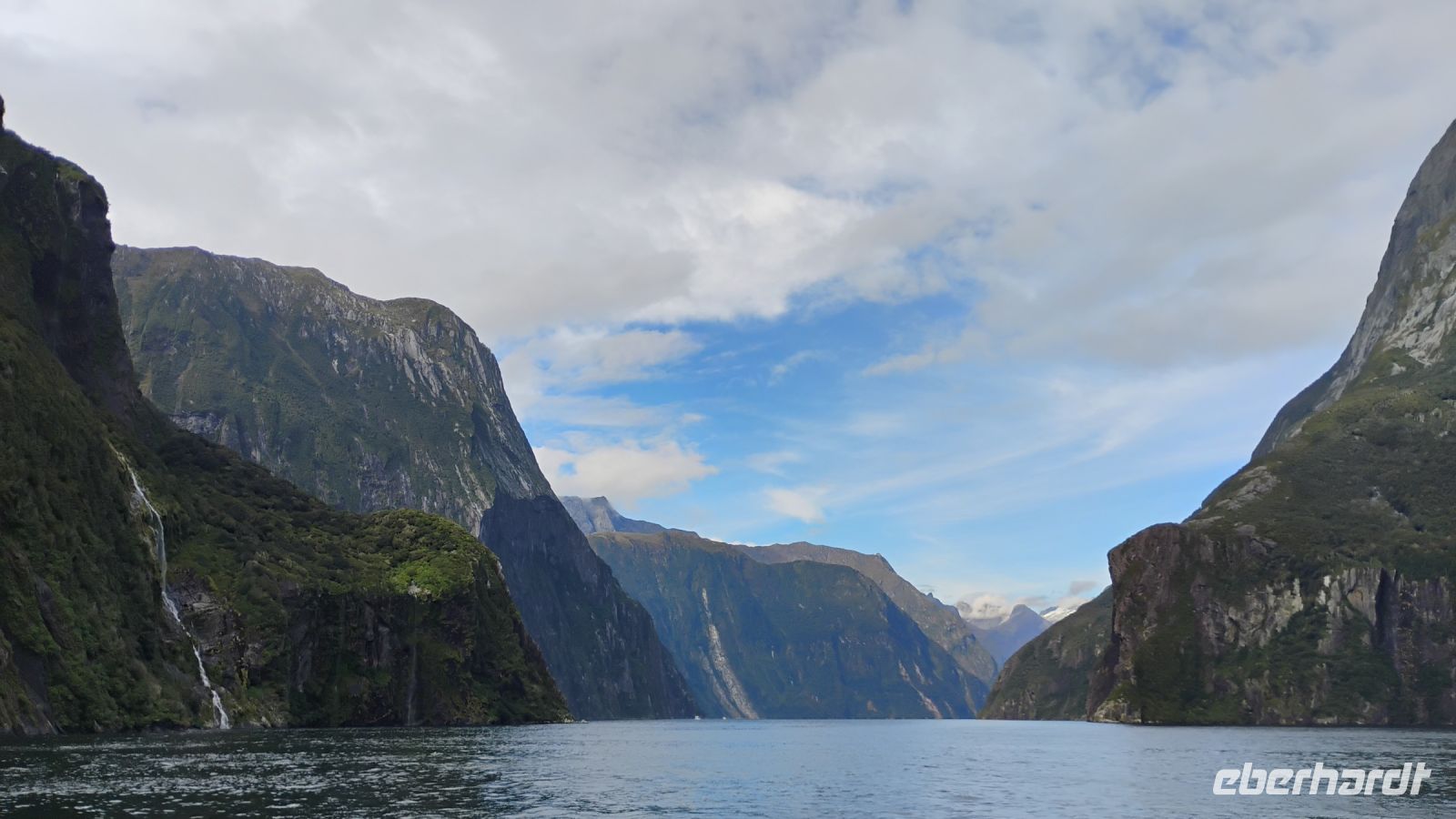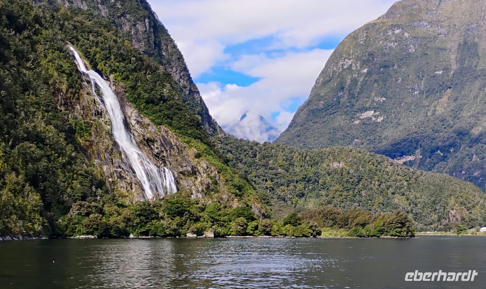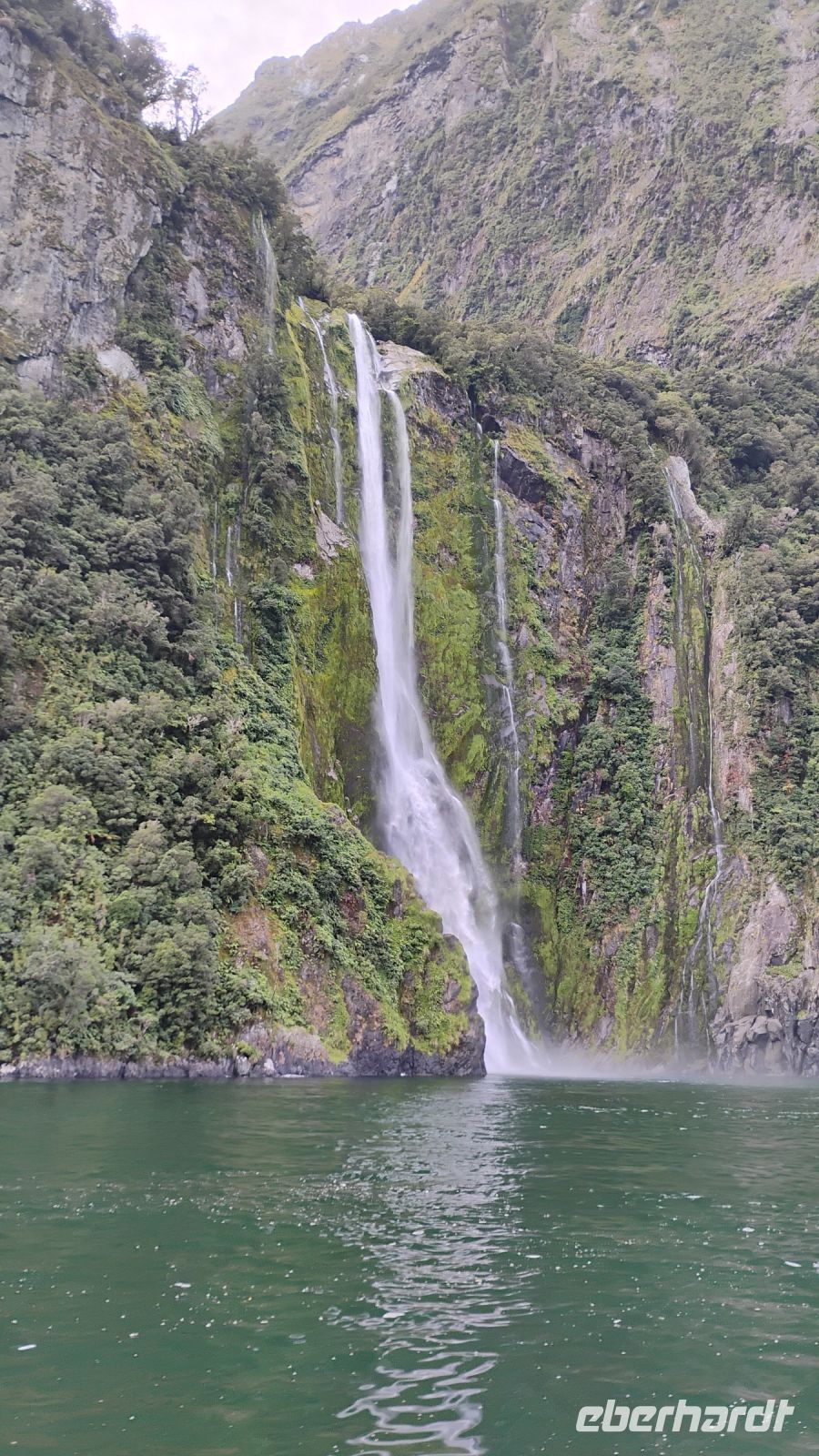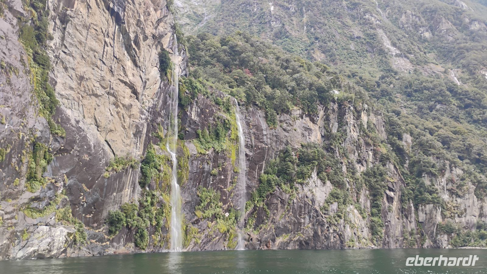 Schließlich waren wir am Milford Sound angekommen, dem eigentlichen Ziel unseres Tagesausflugs. Der Milford Sound ist ein beeindruckender Fjord im Fiordland-Nationalpark und zählt zu den bekanntesten Naturwundern Neuseelands. Mit seinen steilen Felswänden und den zahlreichen Wasserfällen, bietet er eine atemberaubende Kulisse. Die Region ist für ihre hohen Niederschlagsmengen bekannt – umso mehr waren wir glücklich, einen der regenfreien Tage hier erwischt zu haben! Wir unternahmen zunächst einen kurzen Spaziergang entlang des Foreshore Walks mit wunderbaren Blick auf den imposanten Mitre Peak bevor wir an Bord unseres Schiffes gingen. Die Fahrt durch den fjordartigen Sound war schlicht atemberaubend. Wasserfälle stürzten aus schwindelerregender Höhe in die Tiefe, und das Spiel aus Licht und Schatten ließ die Szenerie noch dramatischer wirken. Sogar Delphine hatten uns kurz begleitet! Auf dem Rückweg fuhr unser Schiff nahe an den donnernden Stirling Falls heran, wo wir aus nächster Nähe unsere Fotos machten konnten.