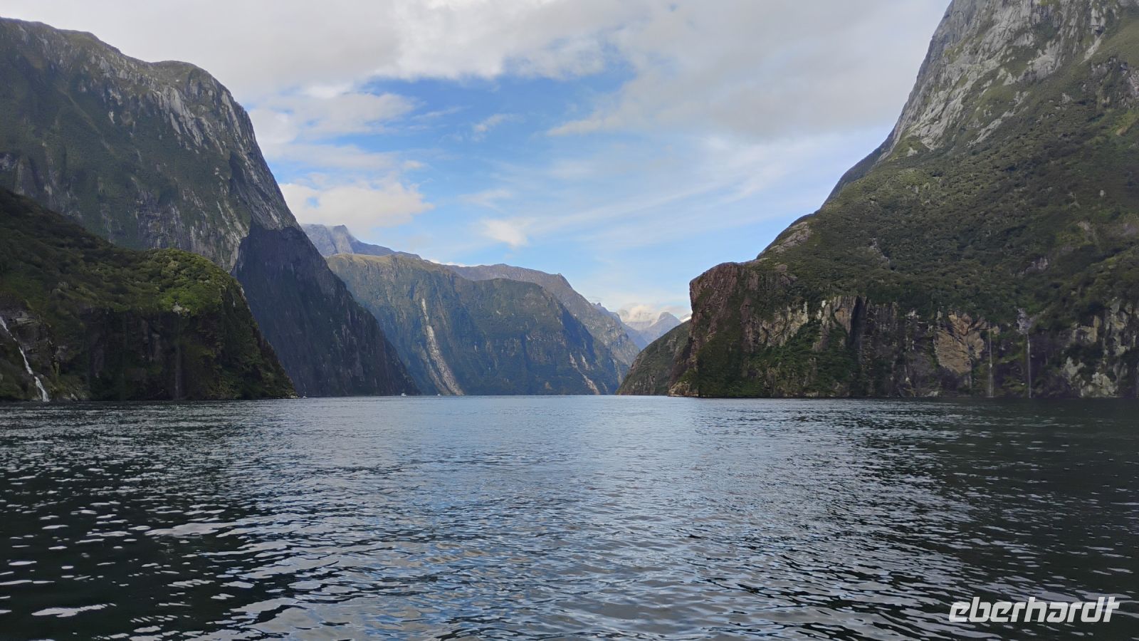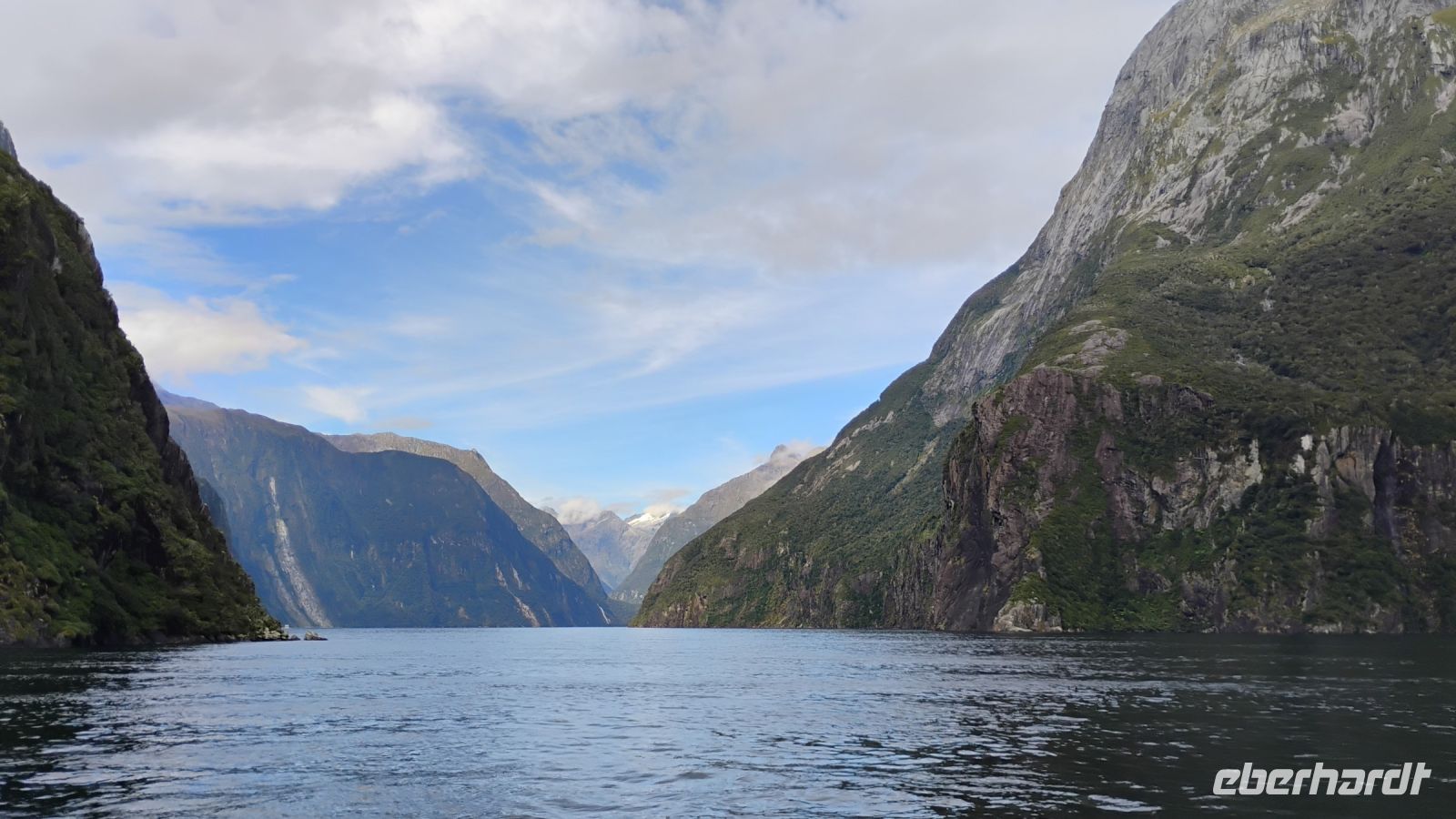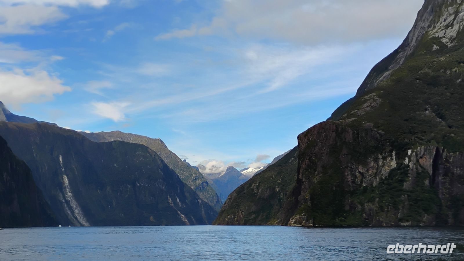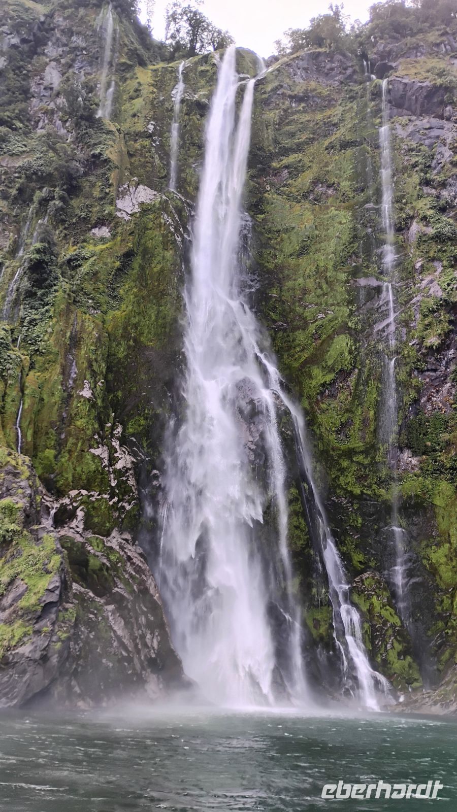 Schließlich waren wir am Milford Sound angekommen, dem eigentlichen Ziel unseres Tagesausflugs. Der Milford Sound ist ein beeindruckender Fjord im Fiordland-Nationalpark und zählt zu den bekanntesten Naturwundern Neuseelands. Mit seinen steilen Felswänden und den zahlreichen Wasserfällen, bietet er eine atemberaubende Kulisse. Die Region ist für ihre hohen Niederschlagsmengen bekannt – umso mehr waren wir glücklich, einen der regenfreien Tage hier erwischt zu haben! Wir unternahmen zunächst einen kurzen Spaziergang entlang des Foreshore Walks mit wunderbaren Blick auf den imposanten Mitre Peak bevor wir an Bord unseres Schiffes gingen. Die Fahrt durch den fjordartigen Sound war schlicht atemberaubend. Wasserfälle stürzten aus schwindelerregender Höhe in die Tiefe, und das Spiel aus Licht und Schatten ließ die Szenerie noch dramatischer wirken. Sogar Delphine hatten uns kurz begleitet! Auf dem Rückweg fuhr unser Schiff nahe an den donnernden Stirling Falls heran, wo wir aus nächster Nähe unsere Fotos machten konnten.