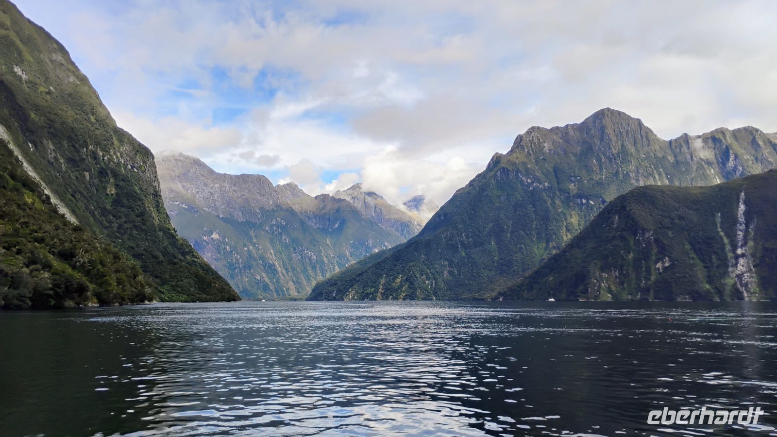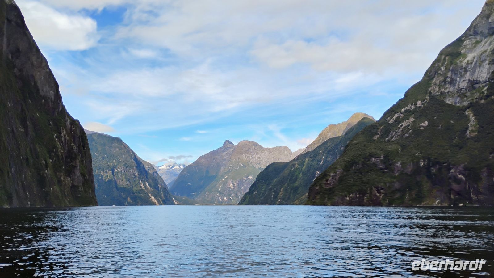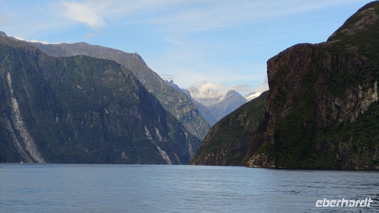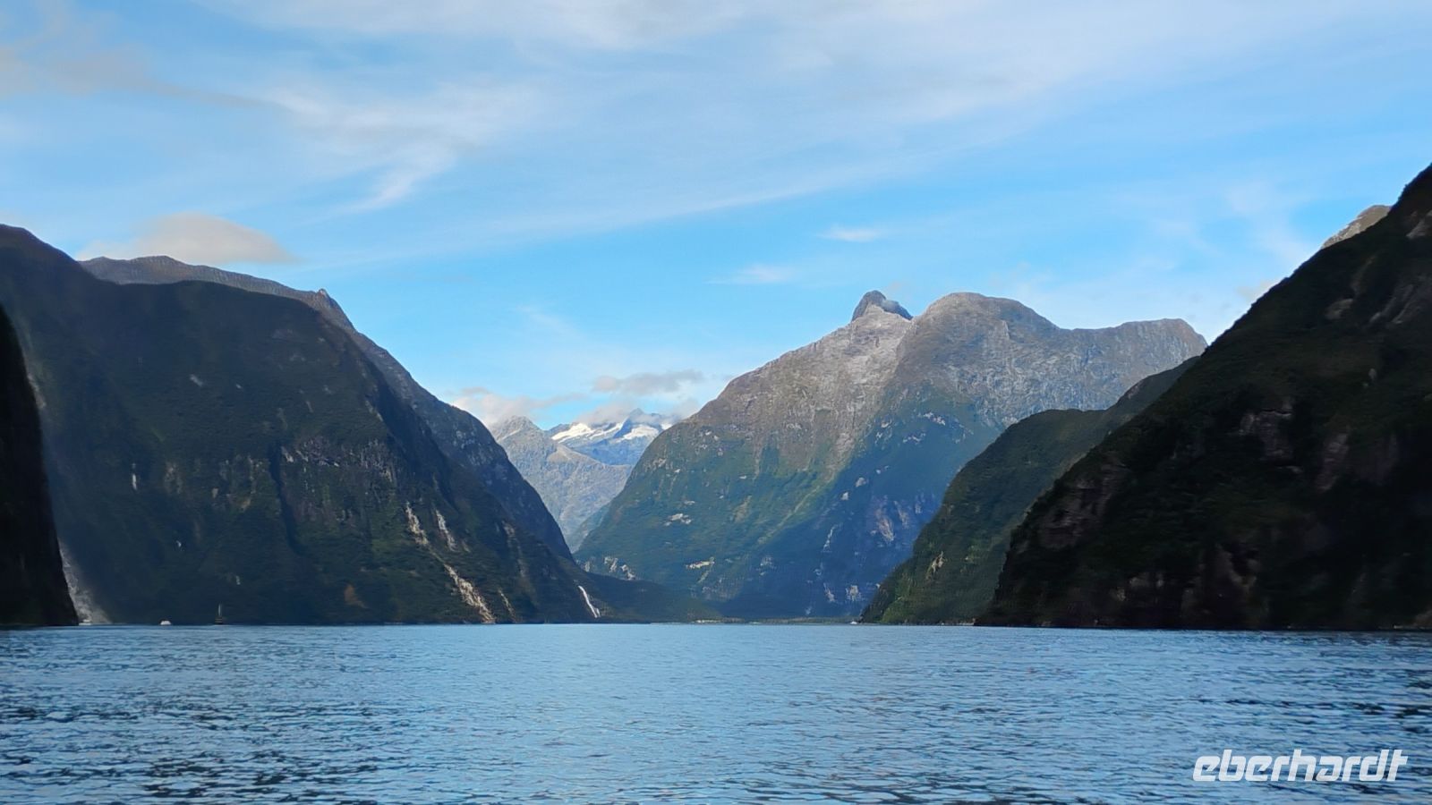 Schließlich waren wir am Milford Sound angekommen, dem eigentlichen Ziel unseres Tagesausflugs. Der Milford Sound ist ein beeindruckender Fjord im Fiordland-Nationalpark und zählt zu den bekanntesten Naturwundern Neuseelands. Mit seinen steilen Felswänden und den zahlreichen Wasserfällen, bietet er eine atemberaubende Kulisse. Die Region ist für ihre hohen Niederschlagsmengen bekannt – umso mehr waren wir glücklich, einen der regenfreien Tage hier erwischt zu haben! Wir unternahmen zunächst einen kurzen Spaziergang entlang des Foreshore Walks mit wunderbaren Blick auf den imposanten Mitre Peak bevor wir an Bord unseres Schiffes gingen. Die Fahrt durch den fjordartigen Sound war schlicht atemberaubend. Wasserfälle stürzten aus schwindelerregender Höhe in die Tiefe, und das Spiel aus Licht und Schatten ließ die Szenerie noch dramatischer wirken. Sogar Delphine hatten uns kurz begleitet! Auf dem Rückweg fuhr unser Schiff nahe an den donnernden Stirling Falls heran, wo wir aus nächster Nähe unsere Fotos machten konnten.