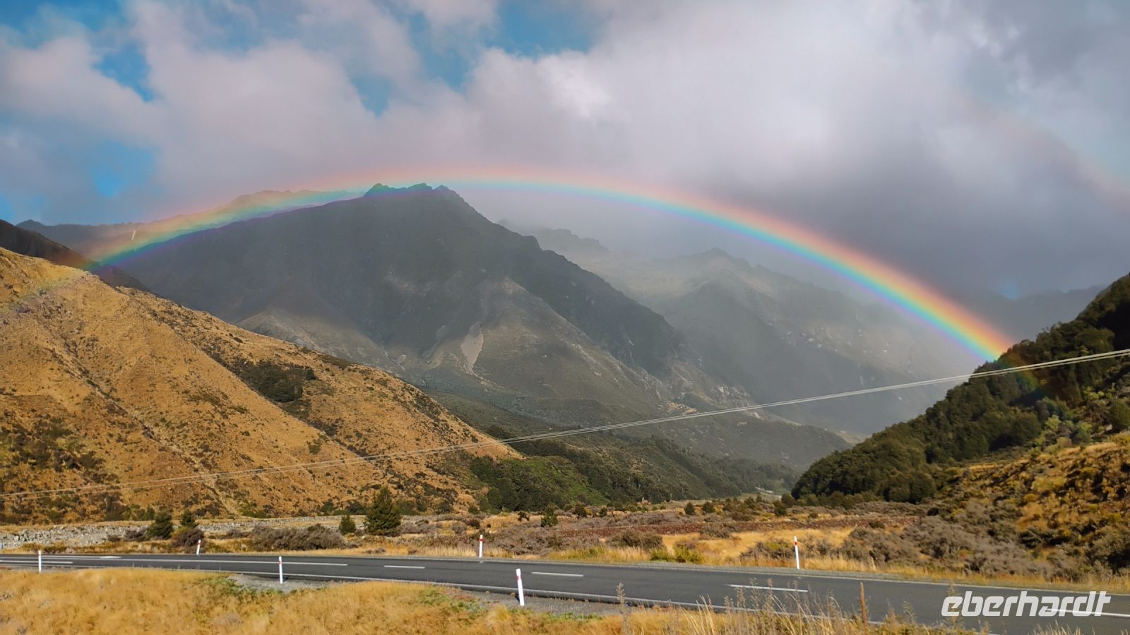 Auf der Weiterfahrt entlang des Lake Pukaki wurden wir von einem Regenbogen begleitet, der die ohnehin schon malerische Landschaft noch verschönerte. Solche Naturschauspiele sind in dieser Region keine Seltenheit und entstehen oft durch wechselhafte Wetterbedingungen.