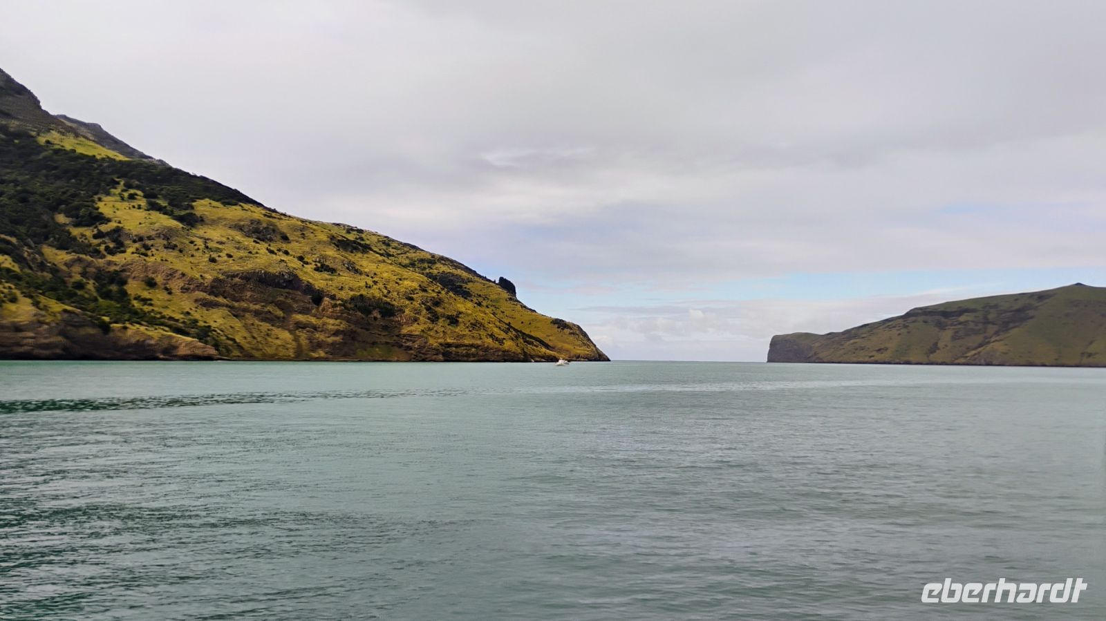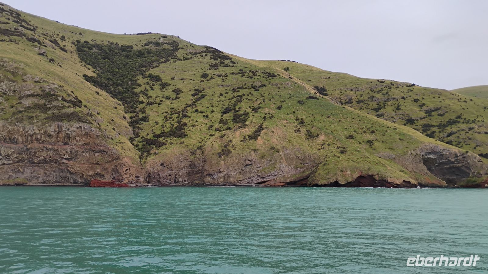 Anschließend fuhren wir zum Schiffsanleger der Wildlife Monarch Cruisers. Trotz des starken Windes gab es keine Seewarnung, sodass die Fahrt im kleinen Boot entlang der Otago-Halbinsel stattfinden konnte. Das offene Meer war jedoch rau, und der kräftige Wellengang machte die Überfahrt zu einem schaukeligen Erlebnis. Wir beobachteten Pelzrobben, Albatrosse und andere Meeresvögel, während der Himmel weiterhin von dunklen Wolken verhangen blieb.