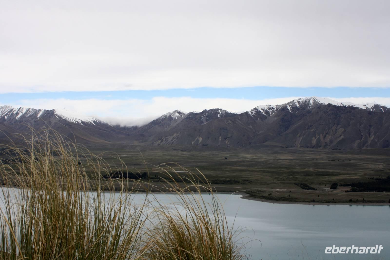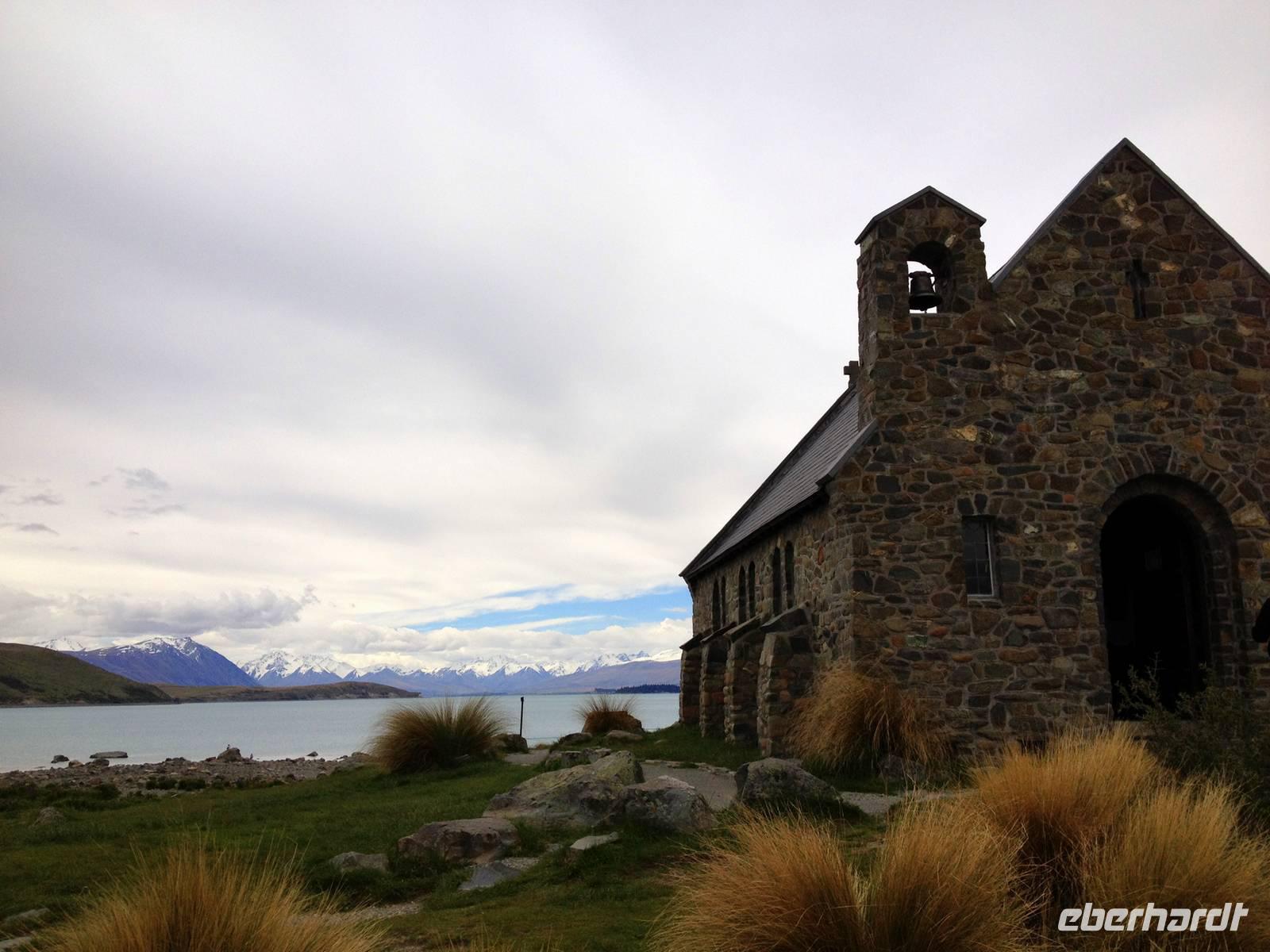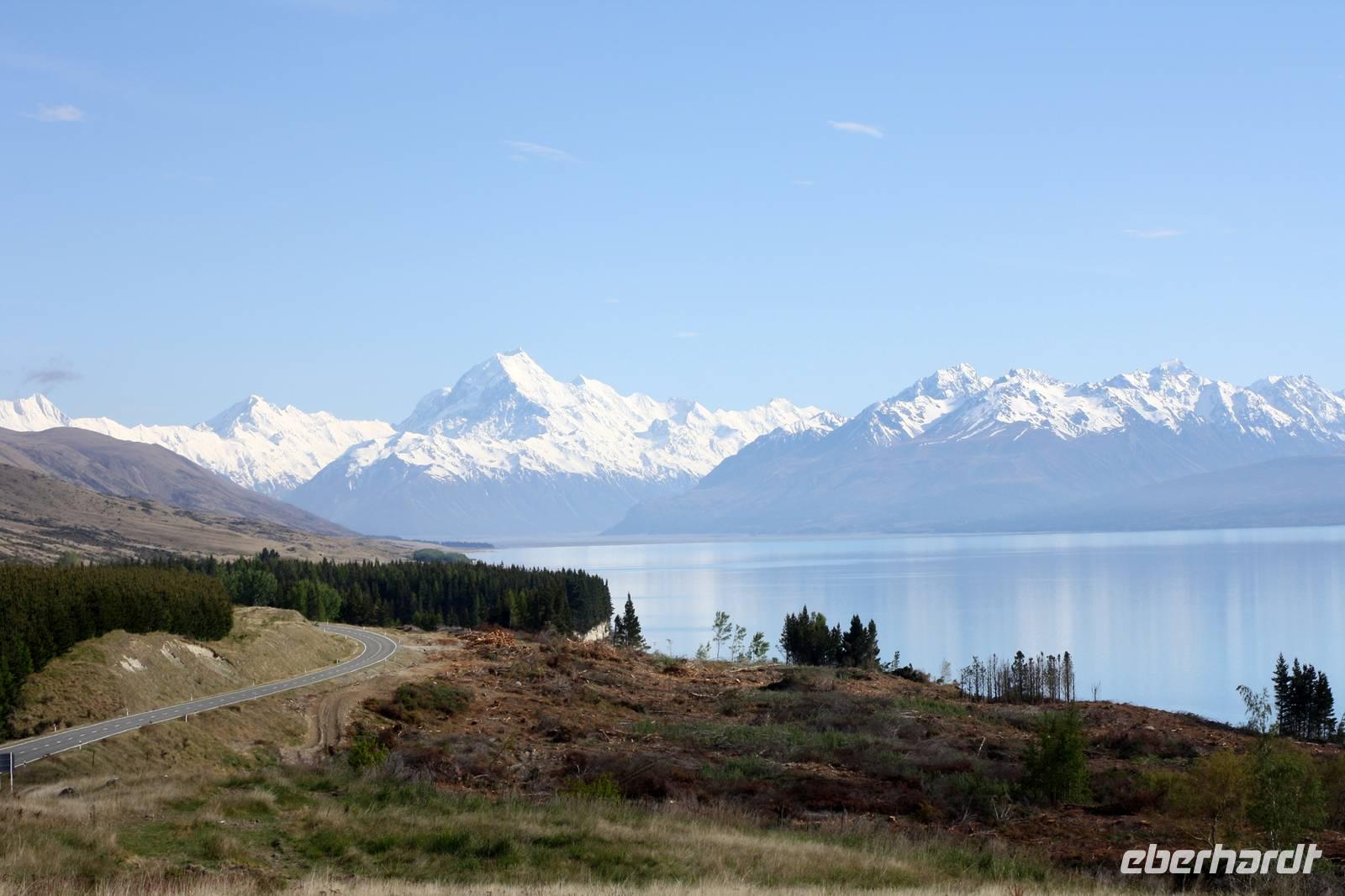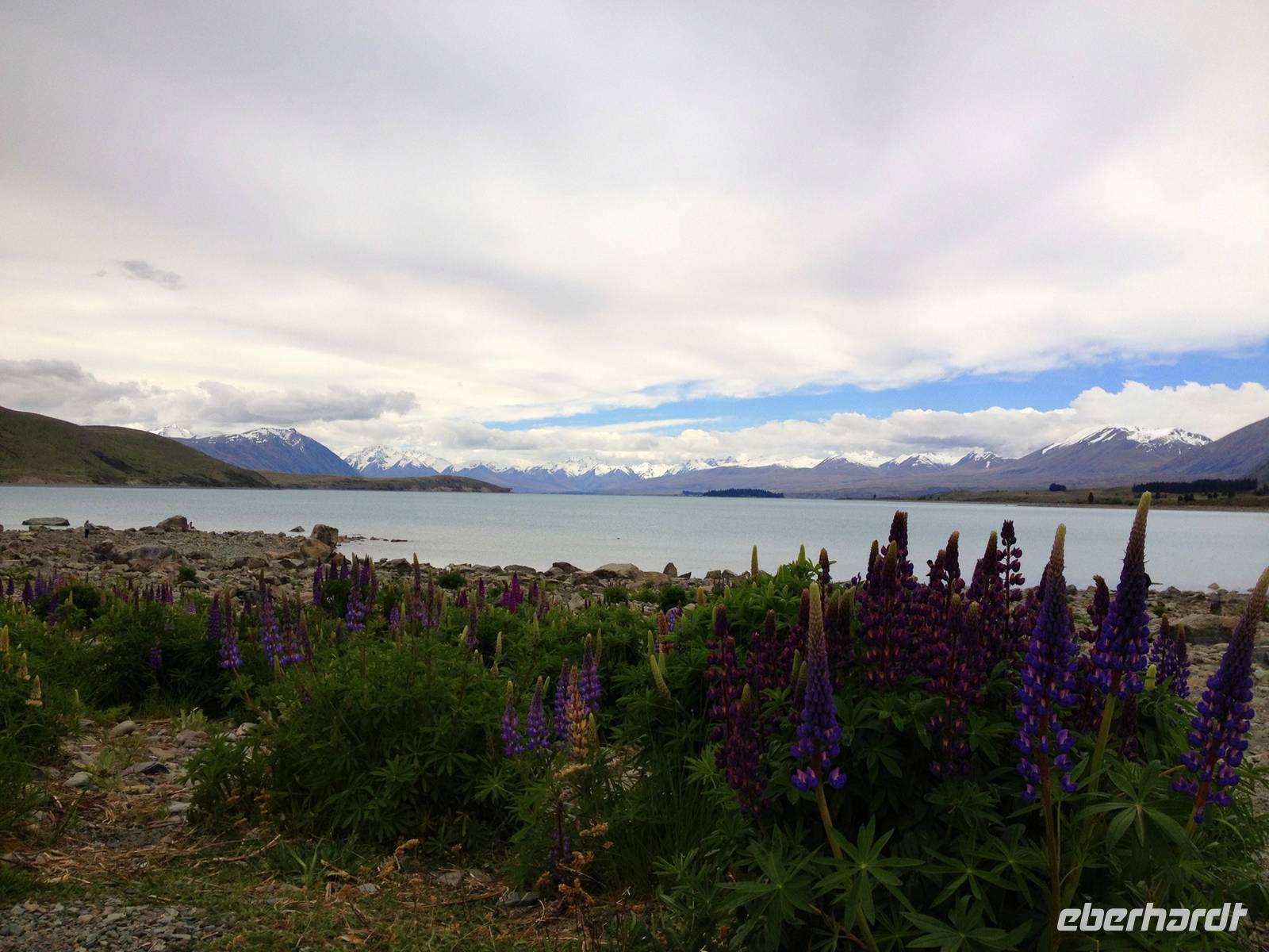 Bevor wir einen ersten Eindruck von der Vielfalt Neuseelands bekommen, lernen wir Christchurch etwas näher kennen. Mit dem Bus fahren wir zum Aussichtspunkt auf die Port Hills und haben einen herrlichen Blick über die gesamte Stadt. Christchurch wird zu Recht als die Gartenstadt Neuseelands bezeichnet, denn zwischen den Häusern leuchtet überall das Grün. Im Zentrum von Christchurch sind deutlich die Spuren der verheerenden Erdbeben von 2010 zu sehen. Der Cathedral Square ist weiträumig abgesperrt, denn hier sind alle Gebäude, inklusive der schönen Kathedrale, zerstört oder mindestens beschädigt. Über 8.000 Häuser sind nicht mehr bewohnbar und müssen abgerissen werden. Die Stadt befindet sich immer noch in der Abrissphase und bald geht es an den Wiederaufbau. Dennoch machen die Kiwis, wie sich die Neuseeländer selbst bezeichnen, das Beste aus der Situation. In der Nähe des Zentrums haben sie einen Bezirk aus Containern aufgebaut, wo Geschäfte, Banken und Cafés untergebracht sind. Nun lassen wir Christchurch hinter uns und fahren in südlicher Richtung durch die fruchtbare Ebene der Canterbury Plains auf die McKenzie Hochebene nach Twizel. Das Landschaftsbild verändert sich mit jeder Stunde: zunächst sehen wir saftig grüne Wiesen und Weiden mit glücklichen Milchkühen und Schafen, hinter Geraldine wird es hügelig mit aufgeforsteten Nadelwäldern und nach dem Burkes Pass liegt die trockene Hochebene mit dem gelben Tussockgras. In der Ferne können wir schon die ersten schneebedeckten Gipfel der Südalpen erkennen. Am Lake Tekapo legen wir eine Pause an der Church of the Good Sheperd ein. Lupinen zaubern Farbtupfer in diese traumhafte Kulisse aus hohen Bergen und dem blauen Gletschersee. Bevor wir Twizel zur Übernachtung erreichen, machen wir einen Fotostopp am Lake Pukaiki mit Blick zum majestätischen Mount Cook. Ein Glück, dass wir ihn trotz der Wolken sehen können!