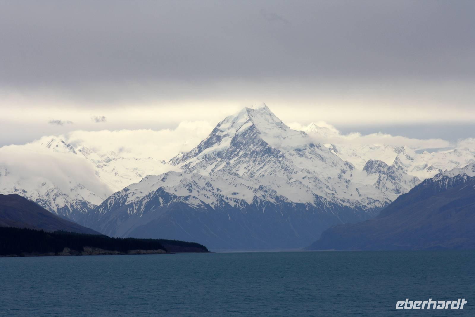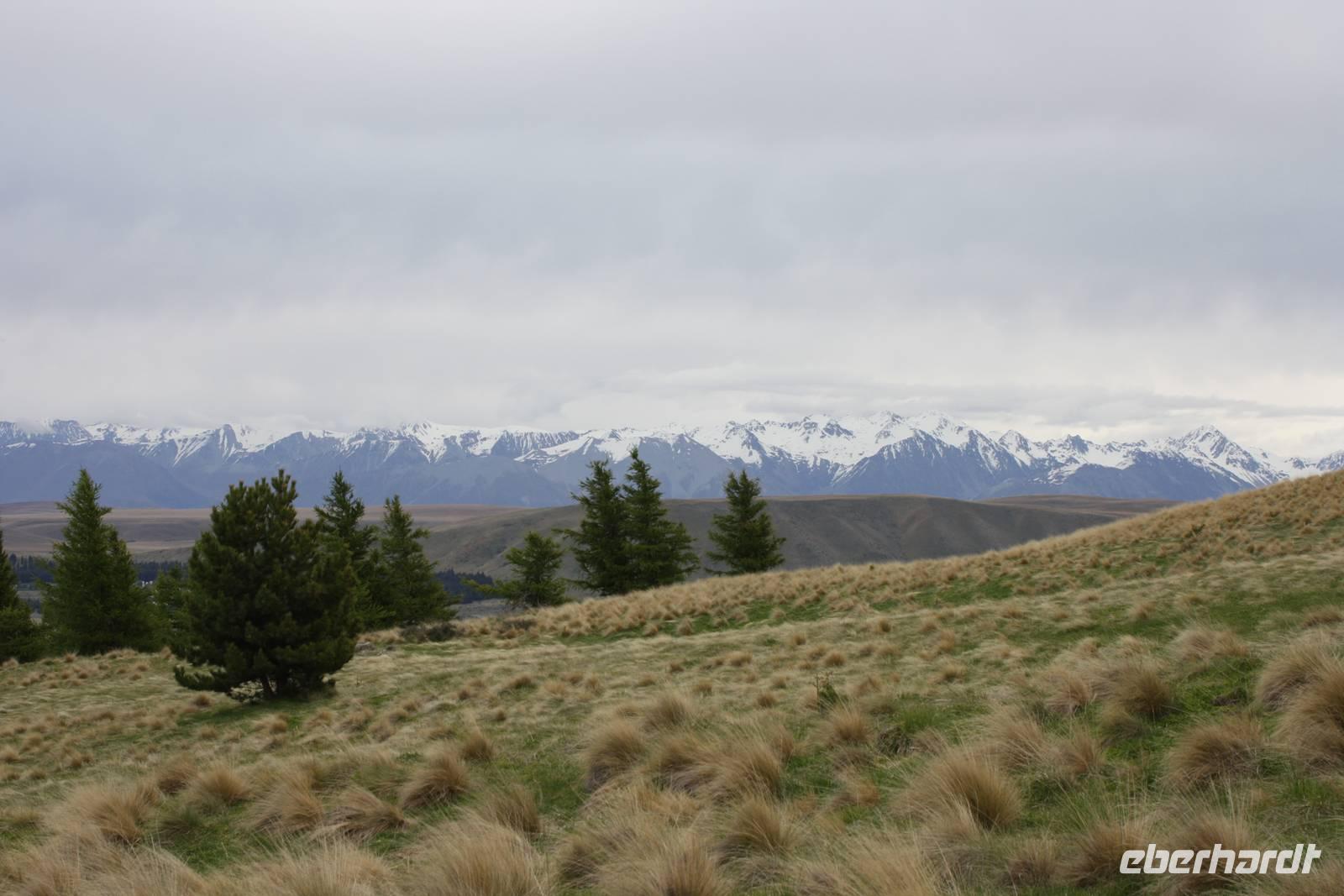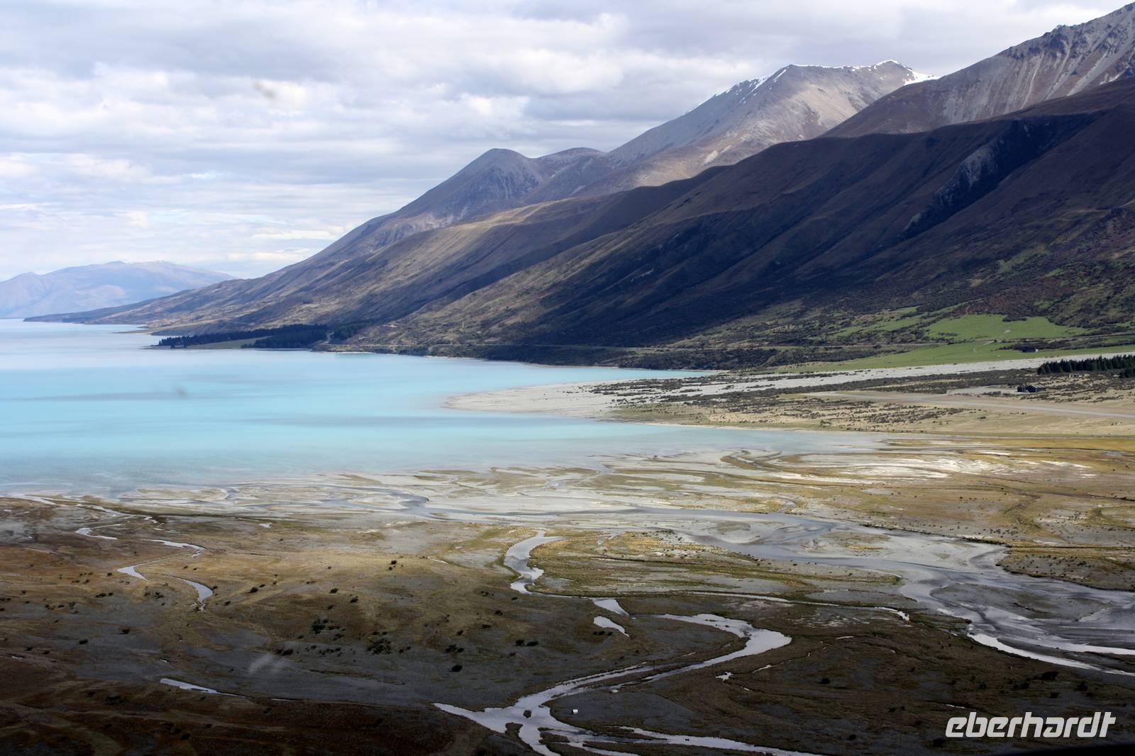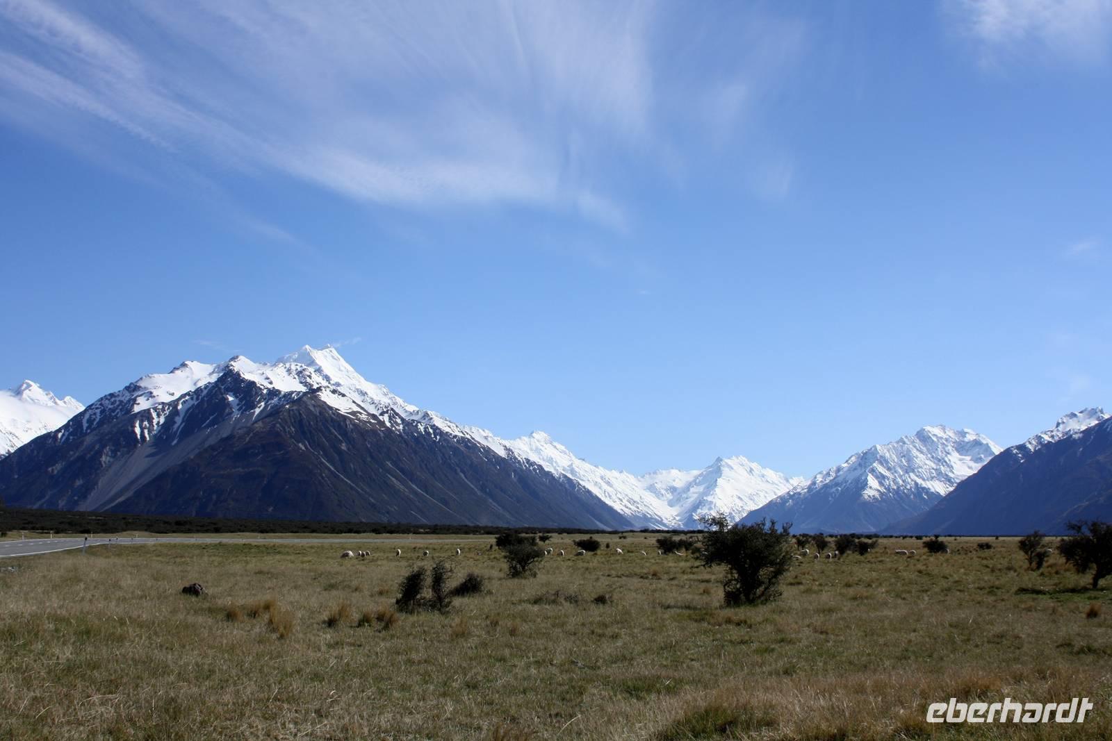 Bevor wir einen ersten Eindruck von der Vielfalt Neuseelands bekommen, lernen wir Christchurch etwas näher kennen. Mit dem Bus fahren wir zum Aussichtspunkt auf die Port Hills und haben einen herrlichen Blick über die gesamte Stadt. Christchurch wird zu Recht als die Gartenstadt Neuseelands bezeichnet, denn zwischen den Häusern leuchtet überall das Grün. Im Zentrum von Christchurch sind deutlich die Spuren der verheerenden Erdbeben von 2010 zu sehen. Der Cathedral Square ist weiträumig abgesperrt, denn hier sind alle Gebäude, inklusive der schönen Kathedrale, zerstört oder mindestens beschädigt. Über 8.000 Häuser sind nicht mehr bewohnbar und müssen abgerissen werden. Die Stadt befindet sich immer noch in der Abrissphase und bald geht es an den Wiederaufbau. Dennoch machen die Kiwis, wie sich die Neuseeländer selbst bezeichnen, das Beste aus der Situation. In der Nähe des Zentrums haben sie einen Bezirk aus Containern aufgebaut, wo Geschäfte, Banken und Cafés untergebracht sind. Nun lassen wir Christchurch hinter uns und fahren in südlicher Richtung durch die fruchtbare Ebene der Canterbury Plains auf die McKenzie Hochebene nach Twizel. Das Landschaftsbild verändert sich mit jeder Stunde: zunächst sehen wir saftig grüne Wiesen und Weiden mit glücklichen Milchkühen und Schafen, hinter Geraldine wird es hügelig mit aufgeforsteten Nadelwäldern und nach dem Burkes Pass liegt die trockene Hochebene mit dem gelben Tussockgras. In der Ferne können wir schon die ersten schneebedeckten Gipfel der Südalpen erkennen. Am Lake Tekapo legen wir eine Pause an der Church of the Good Sheperd ein. Lupinen zaubern Farbtupfer in diese traumhafte Kulisse aus hohen Bergen und dem blauen Gletschersee. Bevor wir Twizel zur Übernachtung erreichen, machen wir einen Fotostopp am Lake Pukaiki mit Blick zum majestätischen Mount Cook. Ein Glück, dass wir ihn trotz der Wolken sehen können!