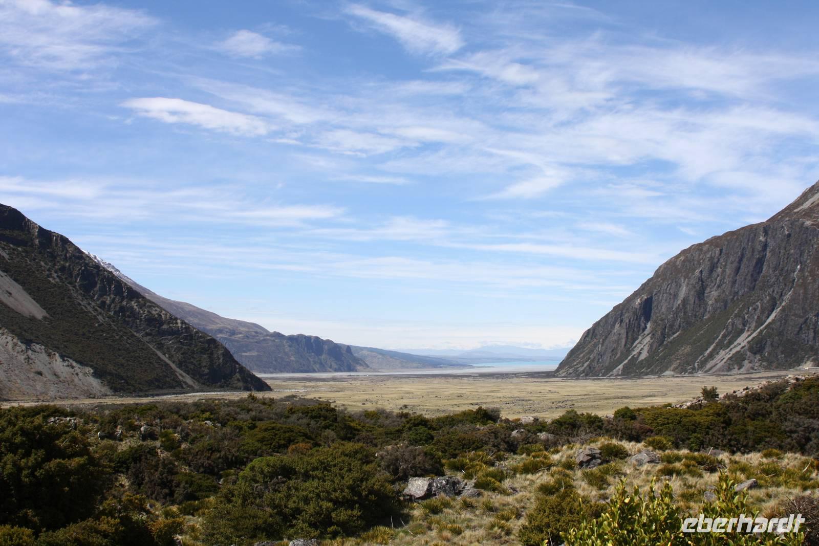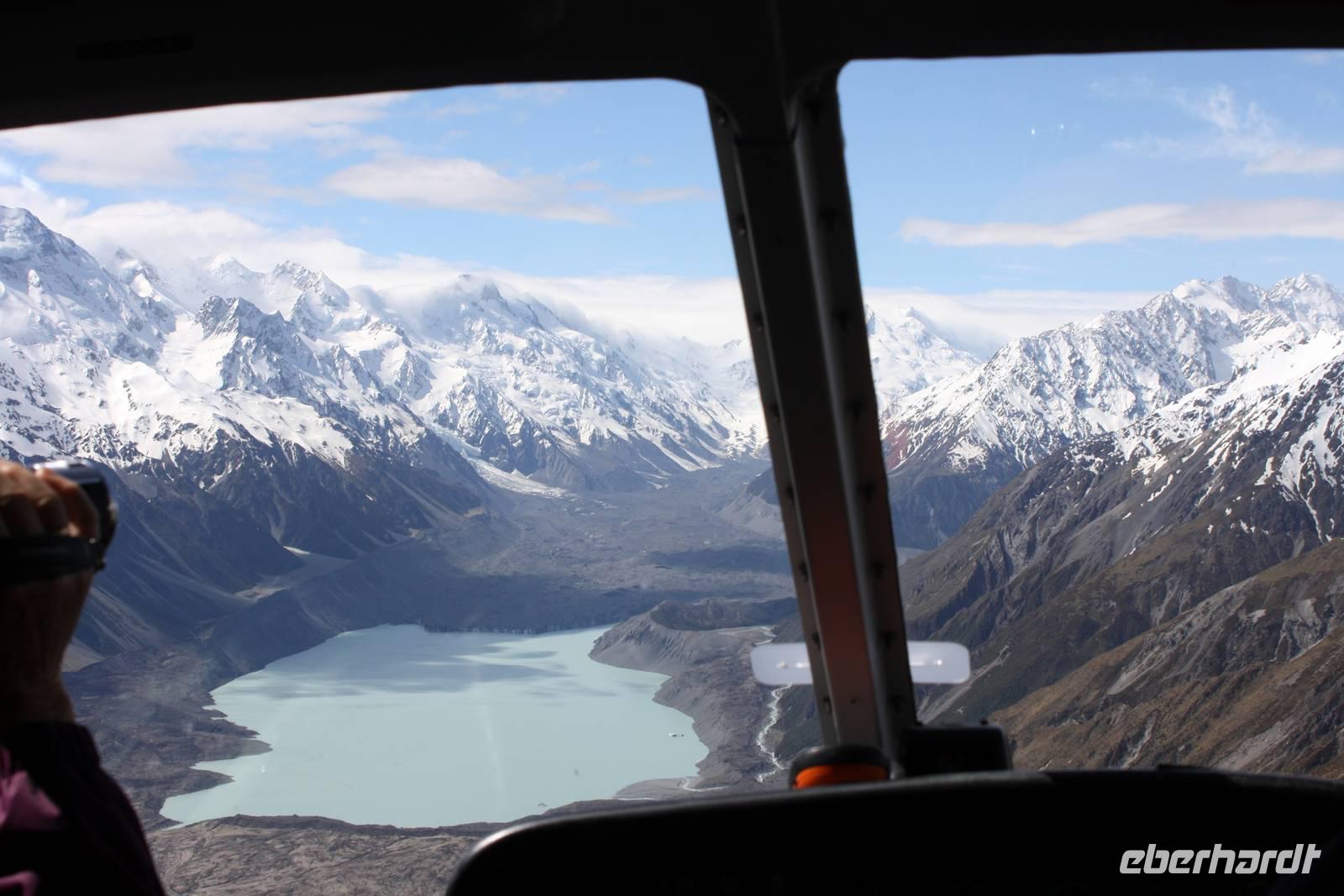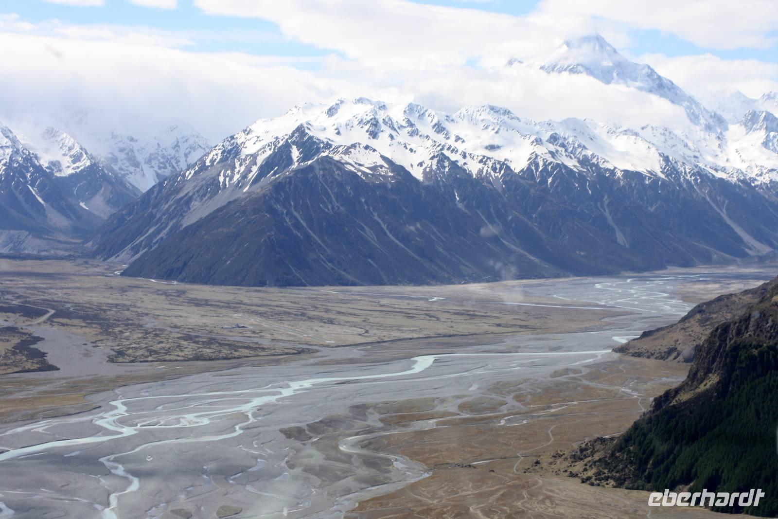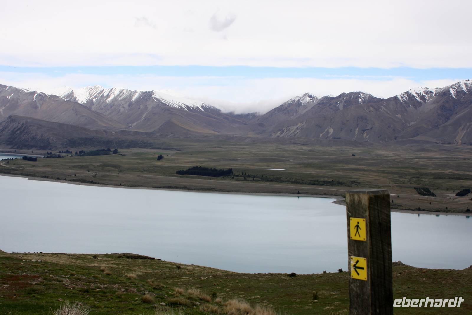 Bevor wir einen ersten Eindruck von der Vielfalt Neuseelands bekommen, lernen wir Christchurch etwas näher kennen. Mit dem Bus fahren wir zum Aussichtspunkt auf die Port Hills und haben einen herrlichen Blick über die gesamte Stadt. Christchurch wird zu Recht als die Gartenstadt Neuseelands bezeichnet, denn zwischen den Häusern leuchtet überall das Grün. Im Zentrum von Christchurch sind deutlich die Spuren der verheerenden Erdbeben von 2010 zu sehen. Der Cathedral Square ist weiträumig abgesperrt, denn hier sind alle Gebäude, inklusive der schönen Kathedrale, zerstört oder mindestens beschädigt. Über 8.000 Häuser sind nicht mehr bewohnbar und müssen abgerissen werden. Die Stadt befindet sich immer noch in der Abrissphase und bald geht es an den Wiederaufbau. Dennoch machen die Kiwis, wie sich die Neuseeländer selbst bezeichnen, das Beste aus der Situation. In der Nähe des Zentrums haben sie einen Bezirk aus Containern aufgebaut, wo Geschäfte, Banken und Cafés untergebracht sind. Nun lassen wir Christchurch hinter uns und fahren in südlicher Richtung durch die fruchtbare Ebene der Canterbury Plains auf die McKenzie Hochebene nach Twizel. Das Landschaftsbild verändert sich mit jeder Stunde: zunächst sehen wir saftig grüne Wiesen und Weiden mit glücklichen Milchkühen und Schafen, hinter Geraldine wird es hügelig mit aufgeforsteten Nadelwäldern und nach dem Burkes Pass liegt die trockene Hochebene mit dem gelben Tussockgras. In der Ferne können wir schon die ersten schneebedeckten Gipfel der Südalpen erkennen. Am Lake Tekapo legen wir eine Pause an der Church of the Good Sheperd ein. Lupinen zaubern Farbtupfer in diese traumhafte Kulisse aus hohen Bergen und dem blauen Gletschersee. Bevor wir Twizel zur Übernachtung erreichen, machen wir einen Fotostopp am Lake Pukaiki mit Blick zum majestätischen Mount Cook. Ein Glück, dass wir ihn trotz der Wolken sehen können!