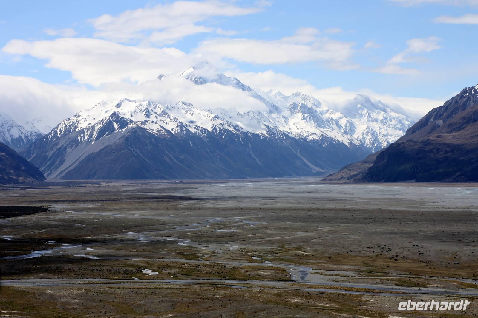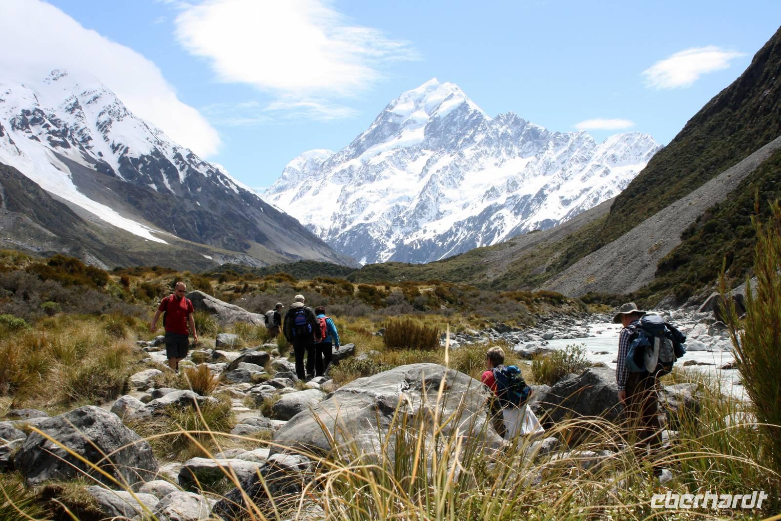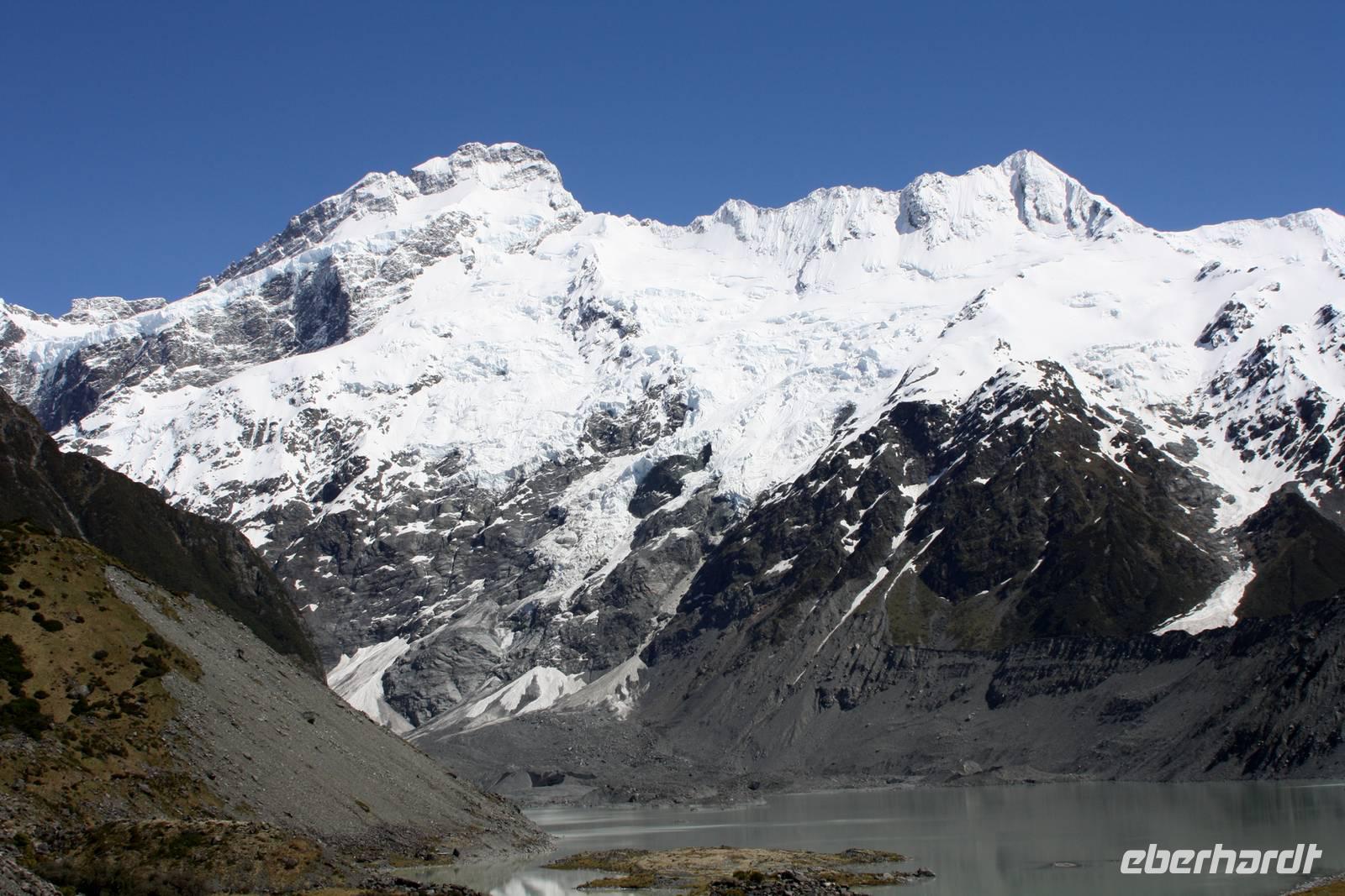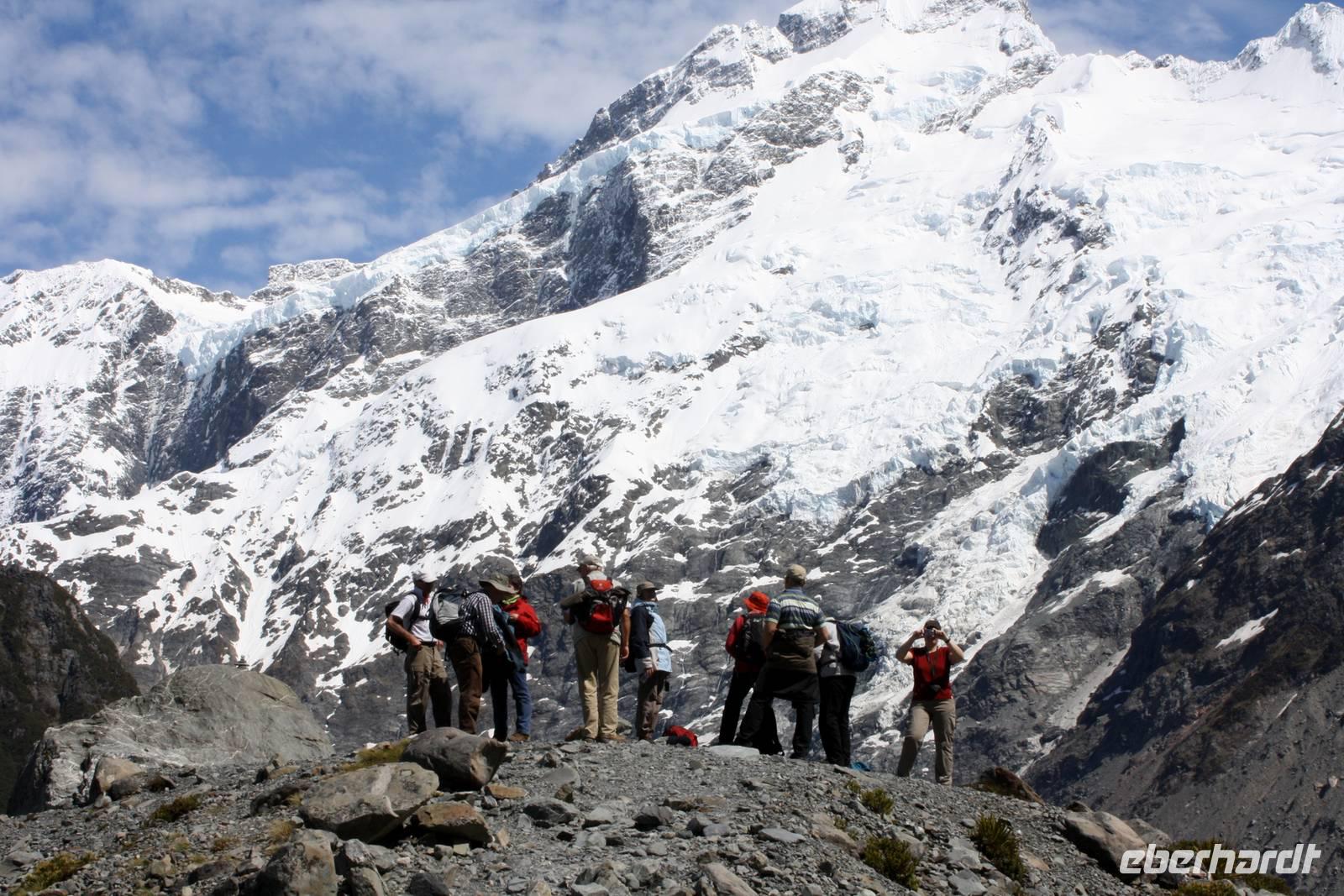 Der Blick aus dem Fenster ist verheißungsvoll - blauer Himmel und Sonnenschein. Ein perfekter Tag für unsere Wanderung im Mount Cook Nationalpark! Mit dem Bus fahren wir am Ufer des Lake Pukaiki nach Mount Cook Village. Der See wird gespeist durch den Tasman-Gletscher und schillert wunderschön blau im Sonnenlicht. Wir sind umgeben von insgesamt 19 Gipfeln mit über 3.000 Meter Höhe, doch der Mount Cook dominiert das Panorama. Der Aoraki, wie ihn die Maori nennen, zeigt sich heute in vollster Pracht. Ein Glück, denn oft versteckt er sich in Wolken. Und noch ein Höhepunkt überrascht uns heute: um 10.30 Uhr ist am Südhimmel eine Sonnenfinsternis zu beobachten! Nach unserem Besuch im Visitor Centre brechen wir auf zur Wanderung im Hooker Valley. Zu beiden Seiten erheben sich die mächtigen, schneebedeckten Berge der Südalpen und am Wegesrand erfreuen wir uns an der Mount Cook Lilie und dem neuseeländischen Edelweiß. Unser Ziel ist der See des Hooker-Gletschers, wo sogar einige Eisschollen treiben. Zeit für eine Picknick-Pause. Obwohl langsam Wolken aufziehen, ist hervorragendes Flugwetter. Die Hälfte der Reisegruppe entschließt sich zu einem Helikopterflug mit Landung auf dem Schneefeld. Aus der Vogelperspektive ist das ganze Ausmaß der Bergwelt zu sehen - ein beeindruckendes Erlebnis!