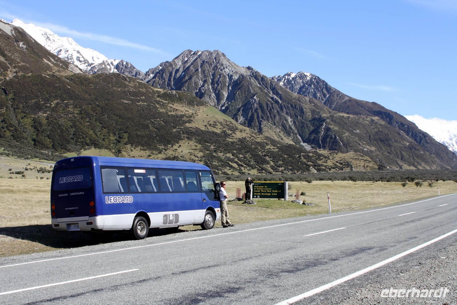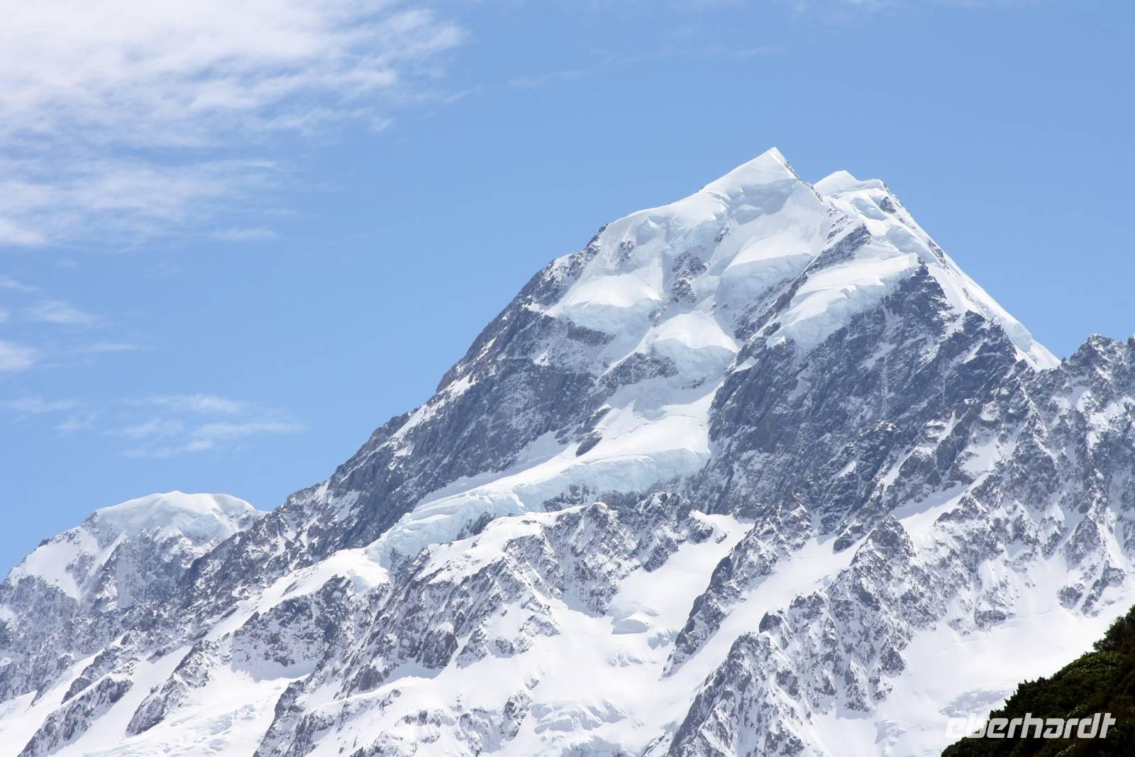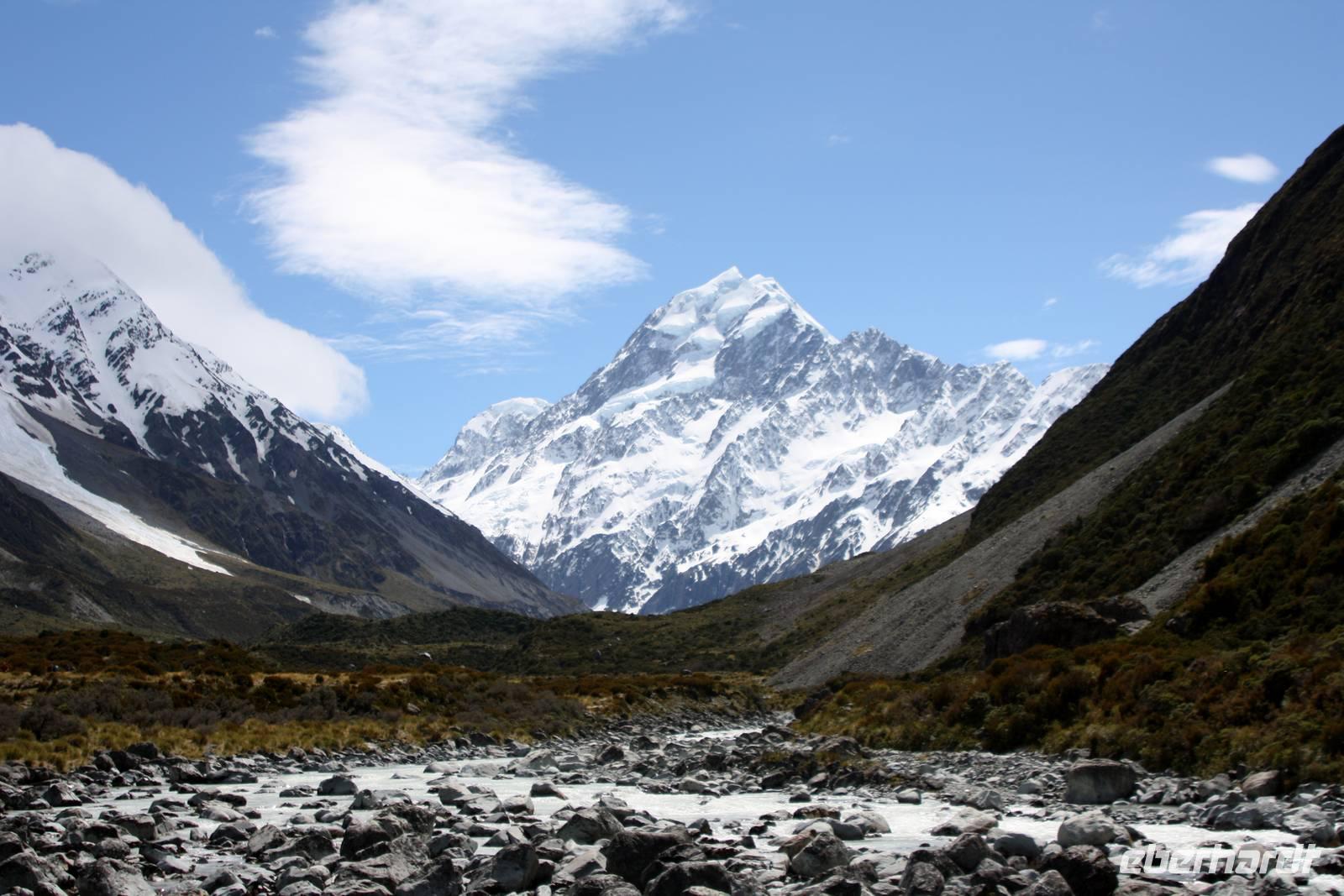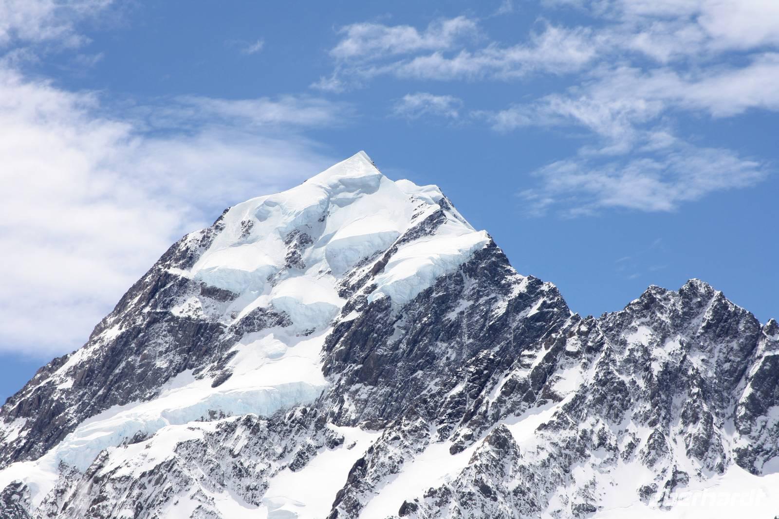 Der Blick aus dem Fenster ist verheißungsvoll - blauer Himmel und Sonnenschein. Ein perfekter Tag für unsere Wanderung im Mount Cook Nationalpark! Mit dem Bus fahren wir am Ufer des Lake Pukaiki nach Mount Cook Village. Der See wird gespeist durch den Tasman-Gletscher und schillert wunderschön blau im Sonnenlicht. Wir sind umgeben von insgesamt 19 Gipfeln mit über 3.000 Meter Höhe, doch der Mount Cook dominiert das Panorama. Der Aoraki, wie ihn die Maori nennen, zeigt sich heute in vollster Pracht. Ein Glück, denn oft versteckt er sich in Wolken. Und noch ein Höhepunkt überrascht uns heute: um 10.30 Uhr ist am Südhimmel eine Sonnenfinsternis zu beobachten! Nach unserem Besuch im Visitor Centre brechen wir auf zur Wanderung im Hooker Valley. Zu beiden Seiten erheben sich die mächtigen, schneebedeckten Berge der Südalpen und am Wegesrand erfreuen wir uns an der Mount Cook Lilie und dem neuseeländischen Edelweiß. Unser Ziel ist der See des Hooker-Gletschers, wo sogar einige Eisschollen treiben. Zeit für eine Picknick-Pause. Obwohl langsam Wolken aufziehen, ist hervorragendes Flugwetter. Die Hälfte der Reisegruppe entschließt sich zu einem Helikopterflug mit Landung auf dem Schneefeld. Aus der Vogelperspektive ist das ganze Ausmaß der Bergwelt zu sehen - ein beeindruckendes Erlebnis!