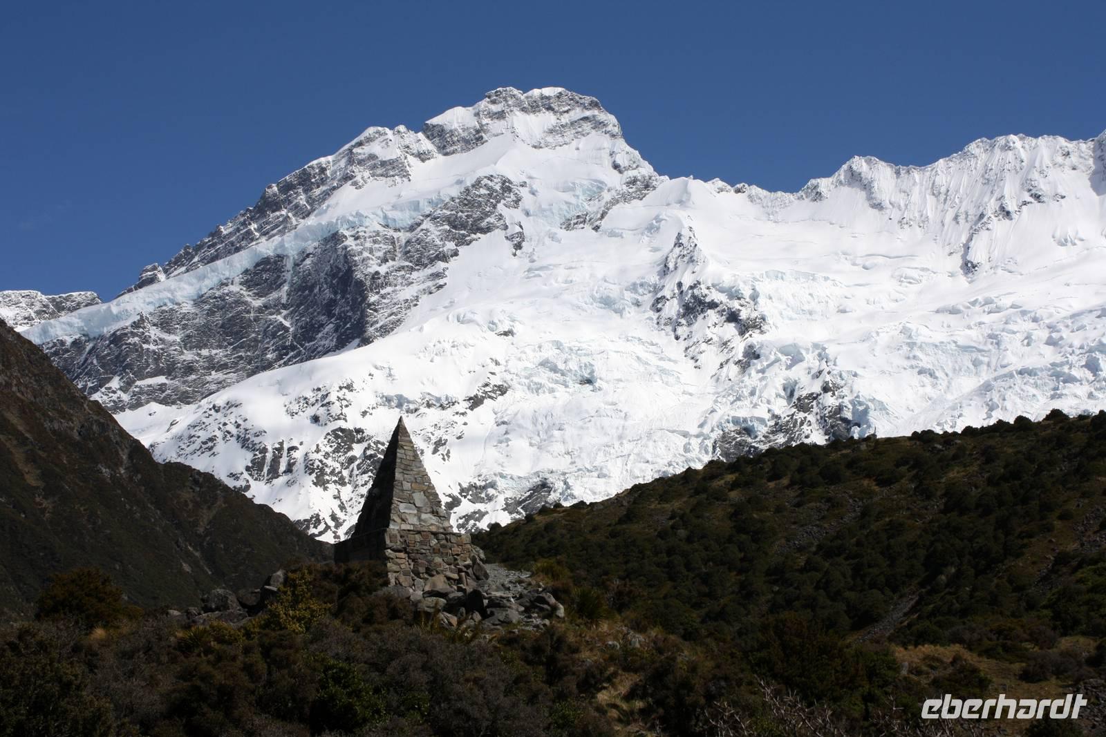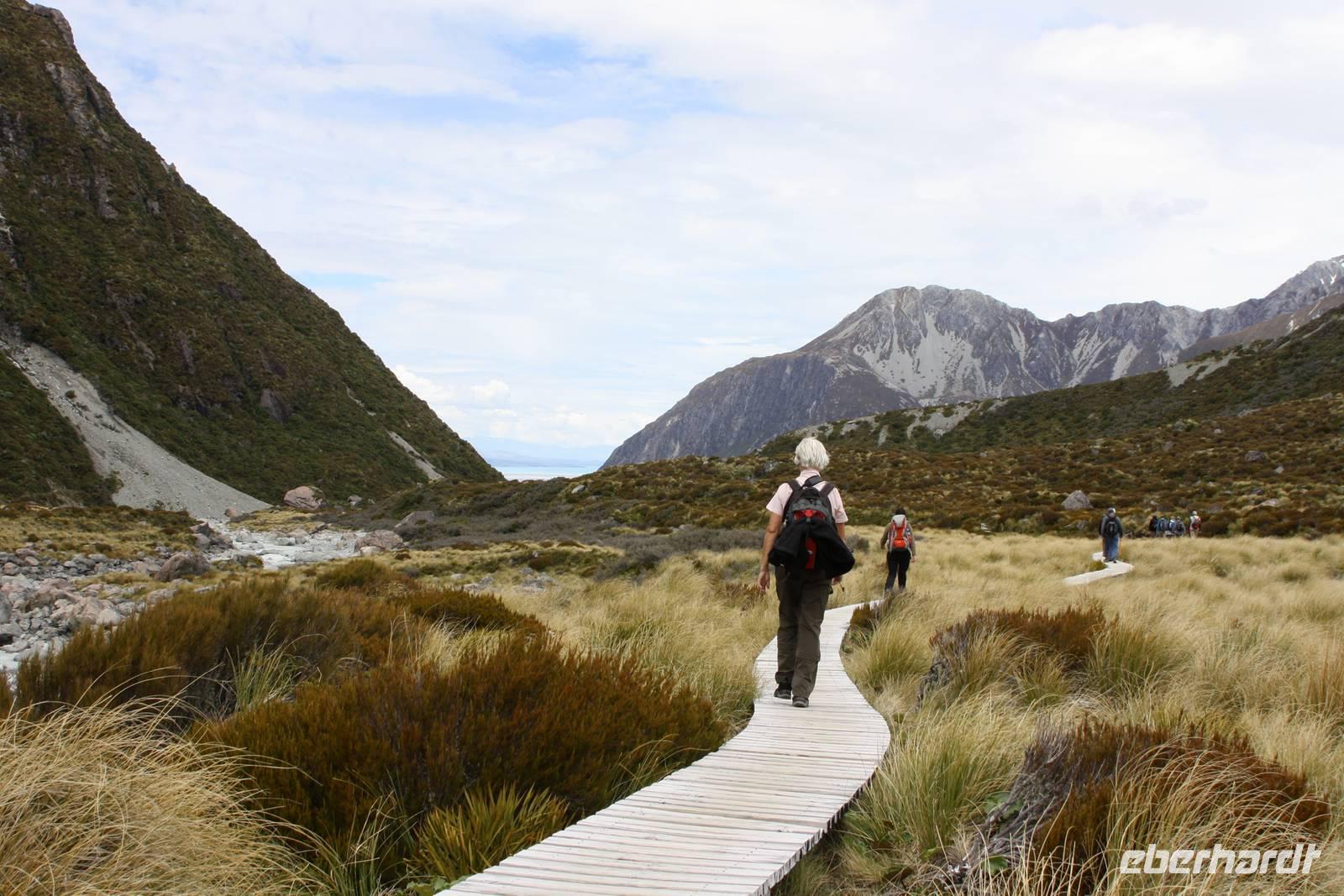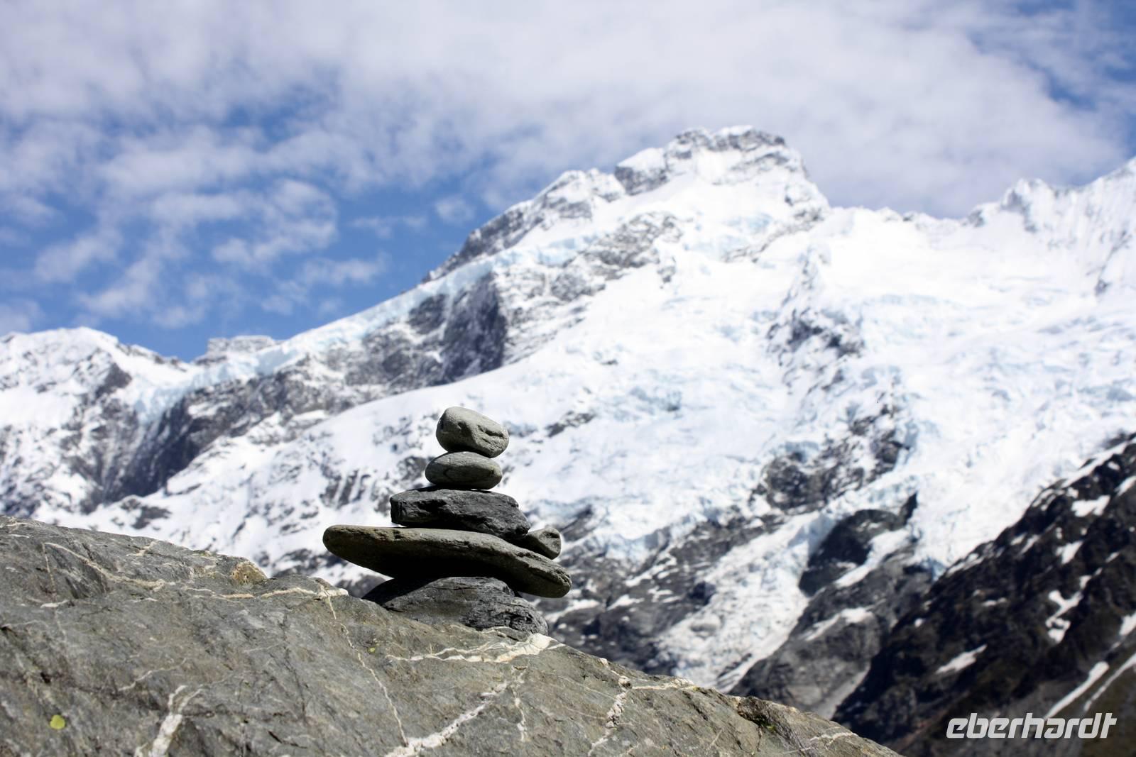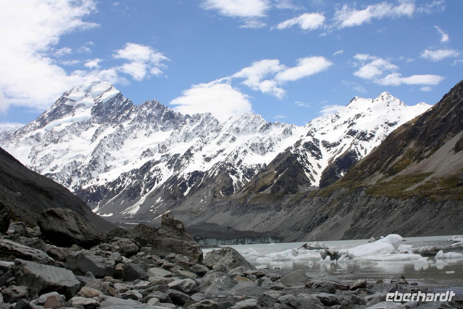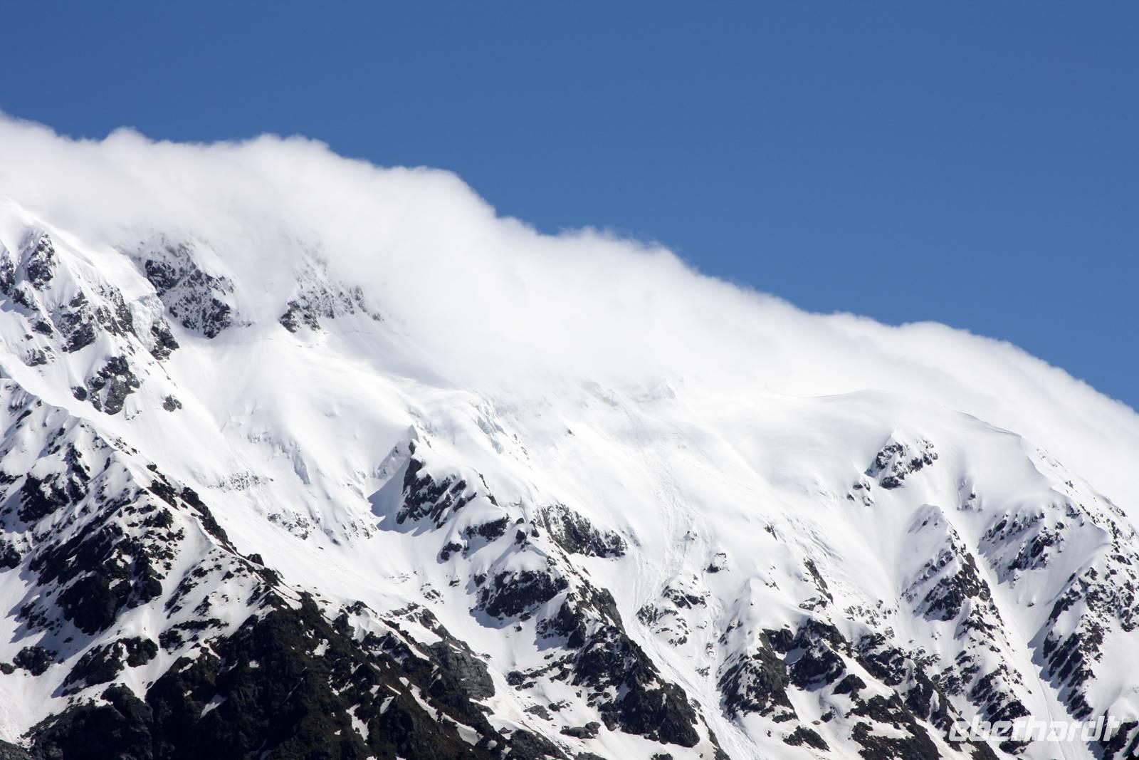 Der Blick aus dem Fenster ist verheißungsvoll - blauer Himmel und Sonnenschein. Ein perfekter Tag für unsere Wanderung im Mount Cook Nationalpark! Mit dem Bus fahren wir am Ufer des Lake Pukaiki nach Mount Cook Village. Der See wird gespeist durch den Tasman-Gletscher und schillert wunderschön blau im Sonnenlicht. Wir sind umgeben von insgesamt 19 Gipfeln mit über 3.000 Meter Höhe, doch der Mount Cook dominiert das Panorama. Der Aoraki, wie ihn die Maori nennen, zeigt sich heute in vollster Pracht. Ein Glück, denn oft versteckt er sich in Wolken. Und noch ein Höhepunkt überrascht uns heute: um 10.30 Uhr ist am Südhimmel eine Sonnenfinsternis zu beobachten! Nach unserem Besuch im Visitor Centre brechen wir auf zur Wanderung im Hooker Valley. Zu beiden Seiten erheben sich die mächtigen, schneebedeckten Berge der Südalpen und am Wegesrand erfreuen wir uns an der Mount Cook Lilie und dem neuseeländischen Edelweiß. Unser Ziel ist der See des Hooker-Gletschers, wo sogar einige Eisschollen treiben. Zeit für eine Picknick-Pause. Obwohl langsam Wolken aufziehen, ist hervorragendes Flugwetter. Die Hälfte der Reisegruppe entschließt sich zu einem Helikopterflug mit Landung auf dem Schneefeld. Aus der Vogelperspektive ist das ganze Ausmaß der Bergwelt zu sehen - ein beeindruckendes Erlebnis!