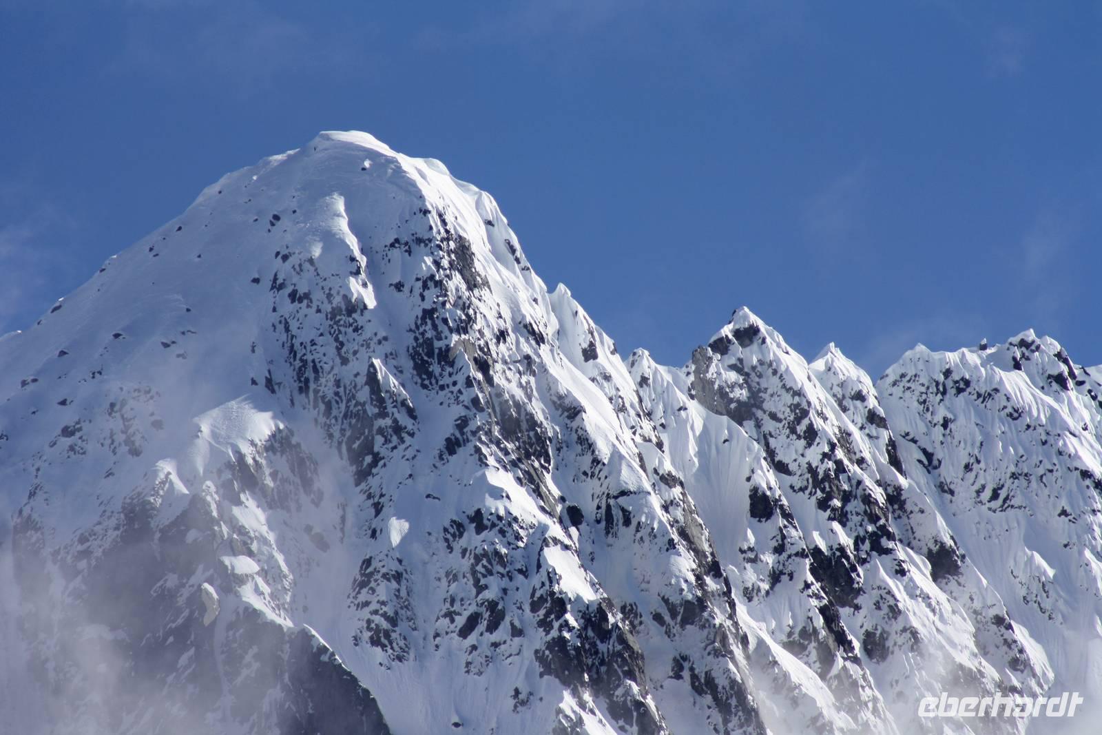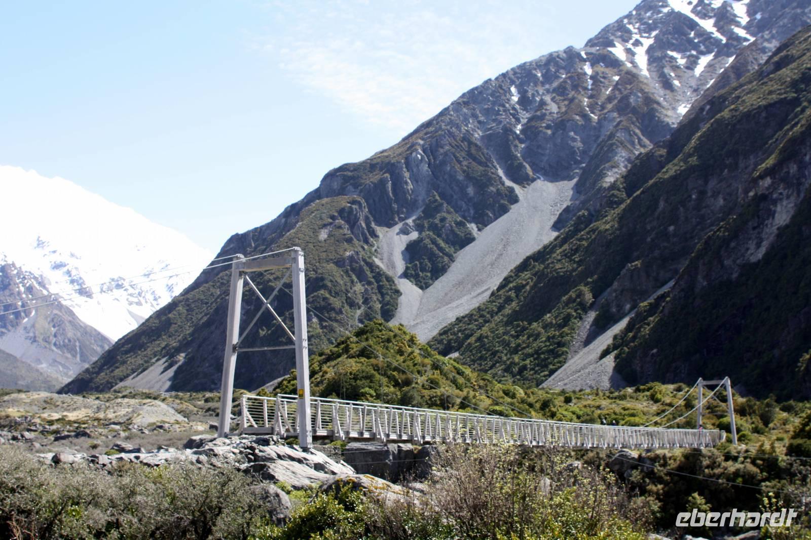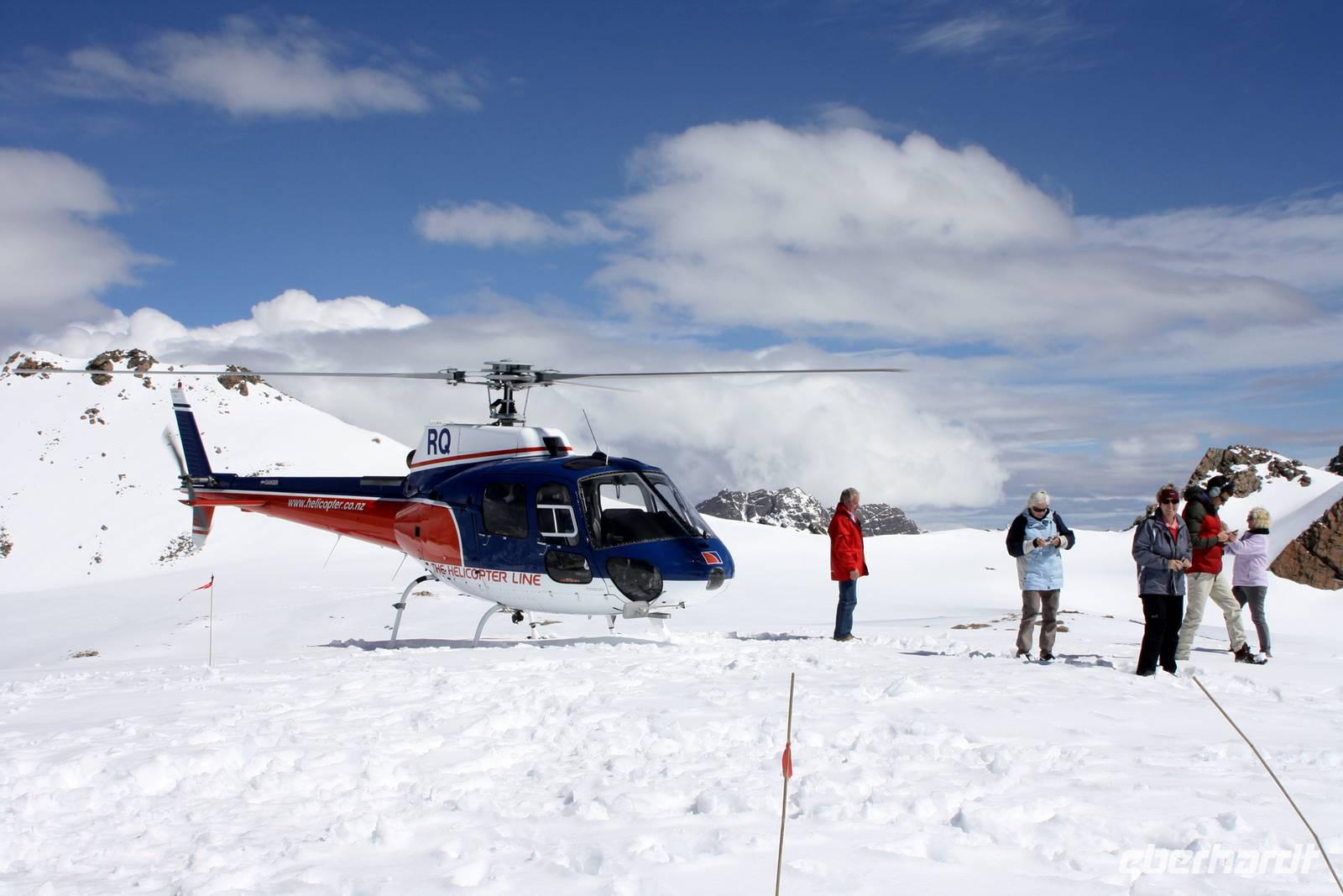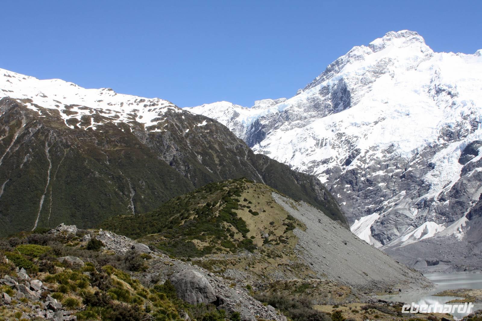 Der Blick aus dem Fenster ist verheißungsvoll - blauer Himmel und Sonnenschein. Ein perfekter Tag für unsere Wanderung im Mount Cook Nationalpark! Mit dem Bus fahren wir am Ufer des Lake Pukaiki nach Mount Cook Village. Der See wird gespeist durch den Tasman-Gletscher und schillert wunderschön blau im Sonnenlicht. Wir sind umgeben von insgesamt 19 Gipfeln mit über 3.000 Meter Höhe, doch der Mount Cook dominiert das Panorama. Der Aoraki, wie ihn die Maori nennen, zeigt sich heute in vollster Pracht. Ein Glück, denn oft versteckt er sich in Wolken. Und noch ein Höhepunkt überrascht uns heute: um 10.30 Uhr ist am Südhimmel eine Sonnenfinsternis zu beobachten! Nach unserem Besuch im Visitor Centre brechen wir auf zur Wanderung im Hooker Valley. Zu beiden Seiten erheben sich die mächtigen, schneebedeckten Berge der Südalpen und am Wegesrand erfreuen wir uns an der Mount Cook Lilie und dem neuseeländischen Edelweiß. Unser Ziel ist der See des Hooker-Gletschers, wo sogar einige Eisschollen treiben. Zeit für eine Picknick-Pause. Obwohl langsam Wolken aufziehen, ist hervorragendes Flugwetter. Die Hälfte der Reisegruppe entschließt sich zu einem Helikopterflug mit Landung auf dem Schneefeld. Aus der Vogelperspektive ist das ganze Ausmaß der Bergwelt zu sehen - ein beeindruckendes Erlebnis!