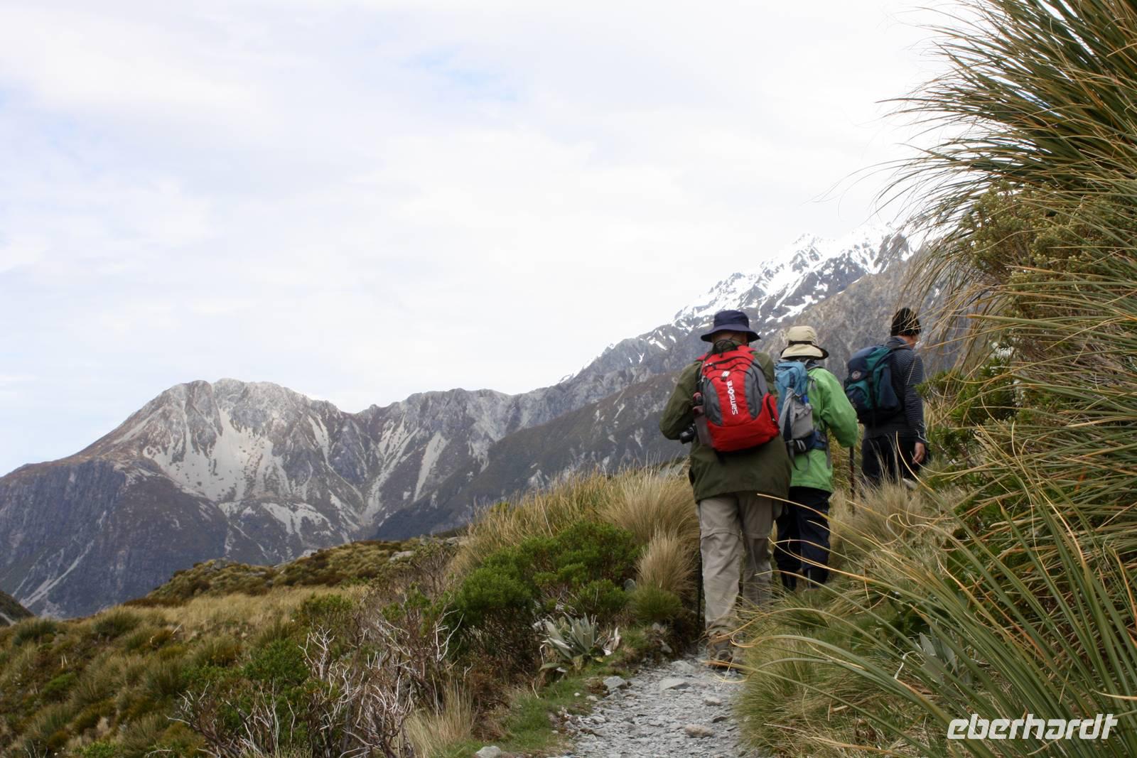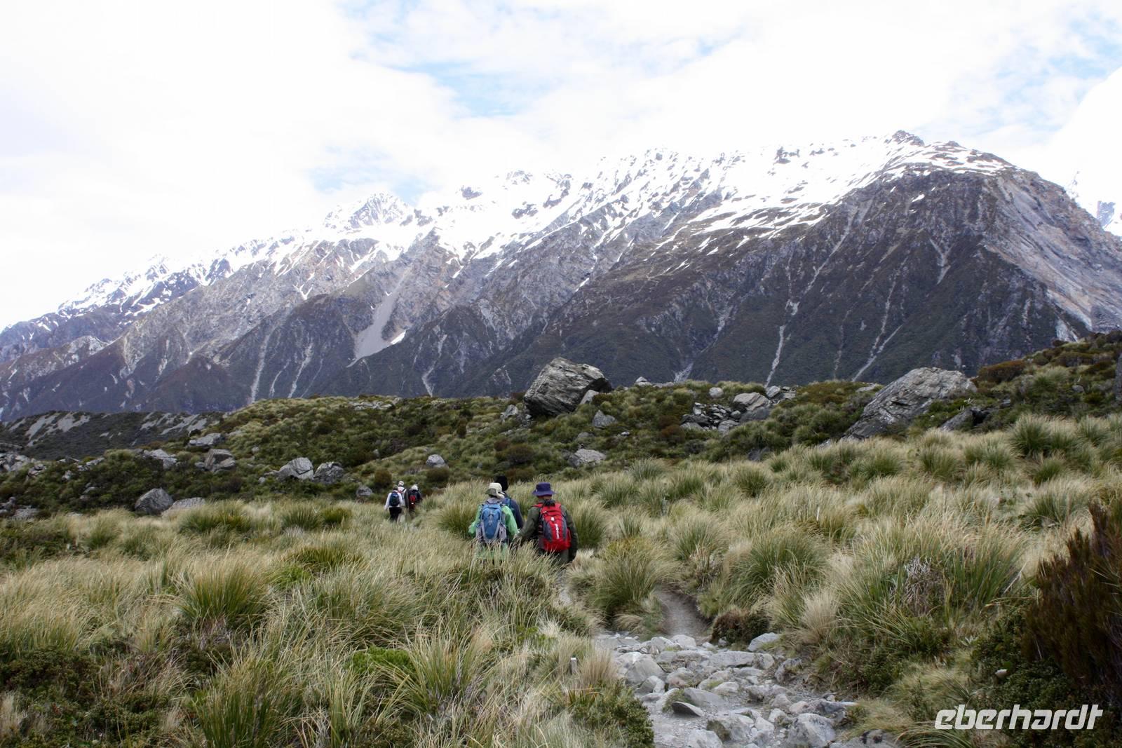 Endlich beginnt die lang ersehnte Reise nach Neuseeland! Unsere Eberhardt-Reisegäste haben sich das - in meinen Augen - schönste Land der Welt ausgesucht. Vor uns liegt jedoch erst einmal eine lange Anreise: Unser Flug geht über Frankfurt, Singapur und Sydney nach Christchurch auf der Südinsel Neuseelands. Nach etlichen Flugstunden heißt es endlich „Willkommen in Aotearoa"! Nach den Einreiseformalitäten, empfängt uns unser Schweizer Reiseleiter Hampi und bringt uns zum Hotel. Um dem Jetlag zu trotzen, unternehmen wir nach dem Check In und einer Erfrischungspause einen Spaziergang durch den Botanischen Garten im nahe gelegenen Hagley Park. Es ist Frühling auf der Südhalbkugel und alles grünt und blüht in voller Pracht. Den ersten Abend beschließen wir bei einem leckeren Abendessen im Restaurant Trevinos.