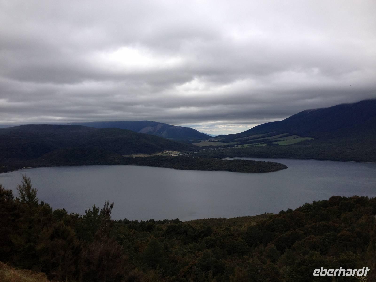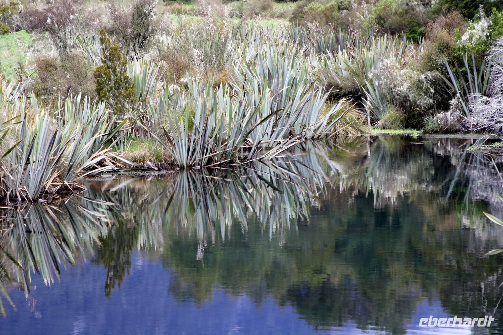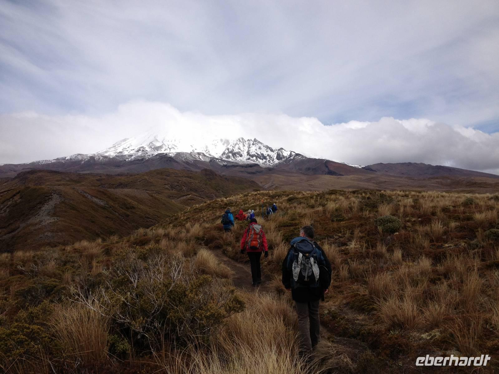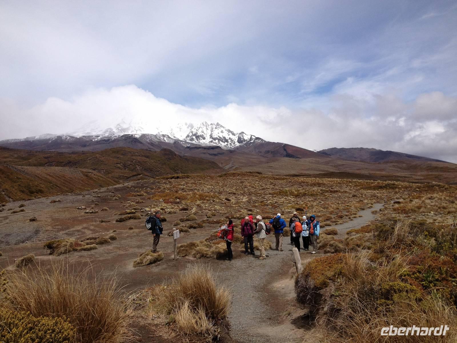 Nach heftigen Regenfällen in der Nacht und am frühen Morgen sah es erst einmal nicht nach einem Wandertag aus. Aber wieder meint es das Wetter gut mit uns und der Regen stoppt pünktlich zum Abmarsch. Unsere Tour beginnt direkt am Hotel und führt uns durch die vulkanische Landschaft. Die drei Vulkane verstecken sich zu Beginn noch in den dichten Wolken, doch später zeigen sich der Ruhapehu, der Ngauruhoe und der Tongariro. Unser Ziel sind die blau schillernden Tama Lakes. Vom Lower Tama Lake „kämpfen" wir uns gegen starken, eisigen Wind hinauf zum Upper Tama Lake. Auf dem Grat werden wir mit einem fantastischen Blick auf den Mount Ruhapehu belohnt. Im Windschatten der Felsen genießen wir unser Picknick. Es ist erstaunlich, wie sich in dieser rauen Umgebung dennoch kleine Pflanzen mit lieblichen Blüten zeigen. Auf dem Rückweg statten wir noch den Taranaki Falls einen Besuch ab und wandern durch ein Waldstück zurück zum Hotel.