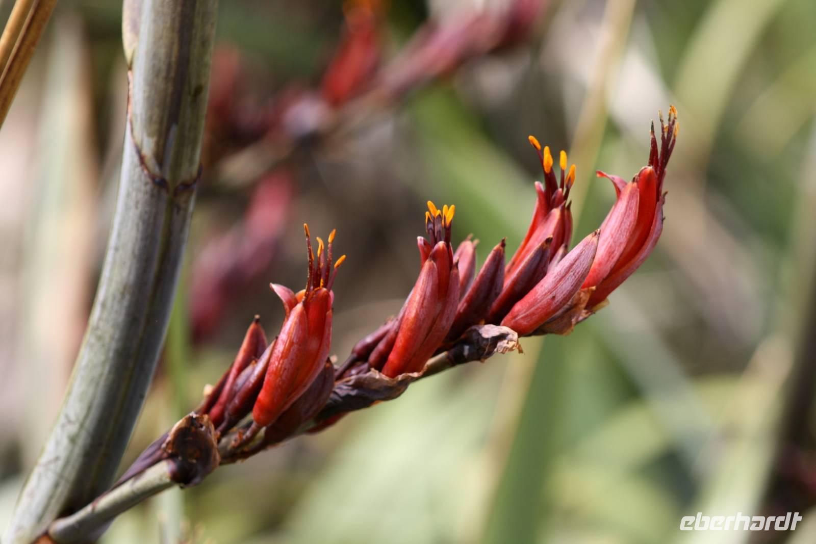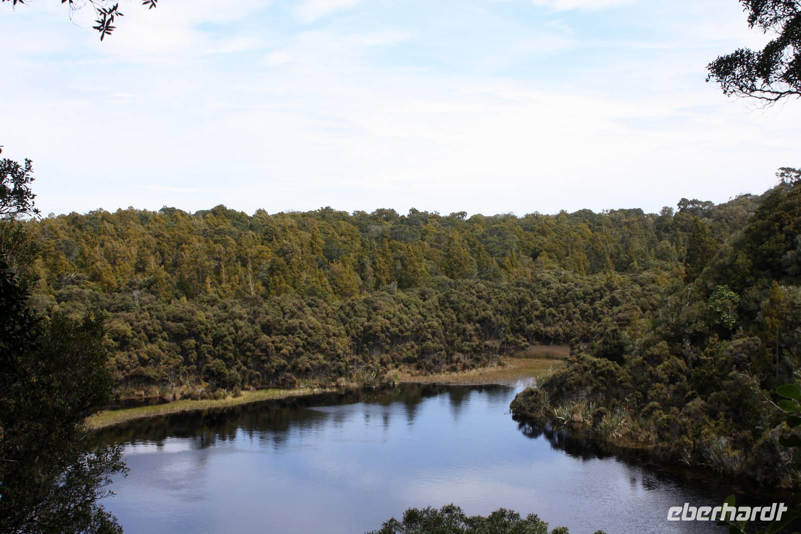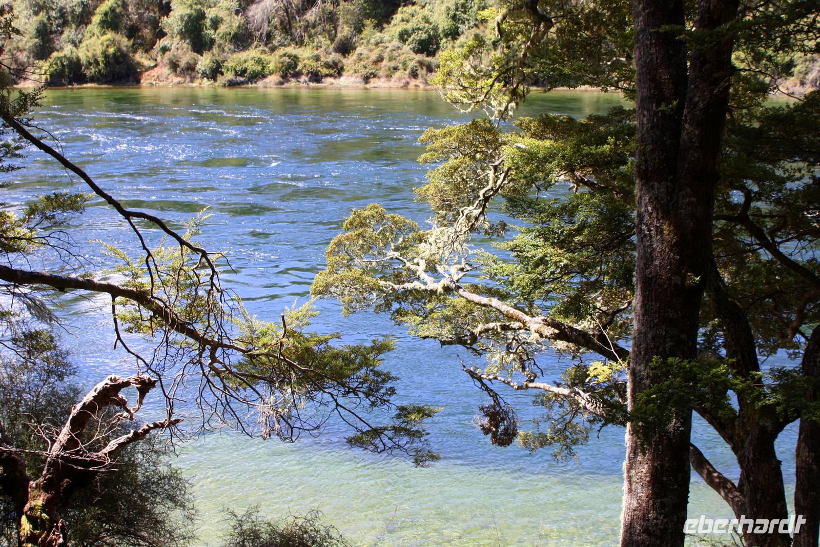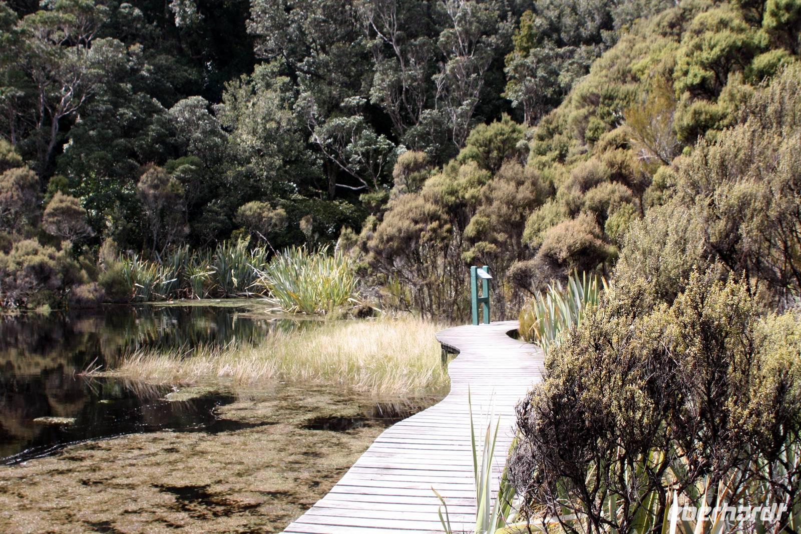 Nach heftigen Regenfällen in der Nacht und am frühen Morgen sah es erst einmal nicht nach einem Wandertag aus. Aber wieder meint es das Wetter gut mit uns und der Regen stoppt pünktlich zum Abmarsch. Unsere Tour beginnt direkt am Hotel und führt uns durch die vulkanische Landschaft. Die drei Vulkane verstecken sich zu Beginn noch in den dichten Wolken, doch später zeigen sich der Ruhapehu, der Ngauruhoe und der Tongariro. Unser Ziel sind die blau schillernden Tama Lakes. Vom Lower Tama Lake „kämpfen" wir uns gegen starken, eisigen Wind hinauf zum Upper Tama Lake. Auf dem Grat werden wir mit einem fantastischen Blick auf den Mount Ruhapehu belohnt. Im Windschatten der Felsen genießen wir unser Picknick. Es ist erstaunlich, wie sich in dieser rauen Umgebung dennoch kleine Pflanzen mit lieblichen Blüten zeigen. Auf dem Rückweg statten wir noch den Taranaki Falls einen Besuch ab und wandern durch ein Waldstück zurück zum Hotel.