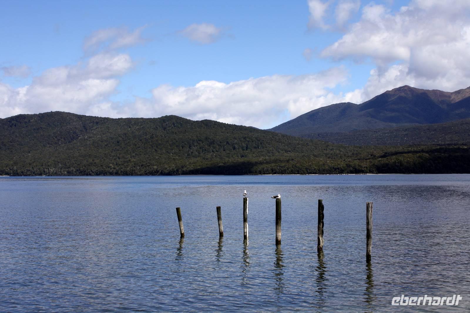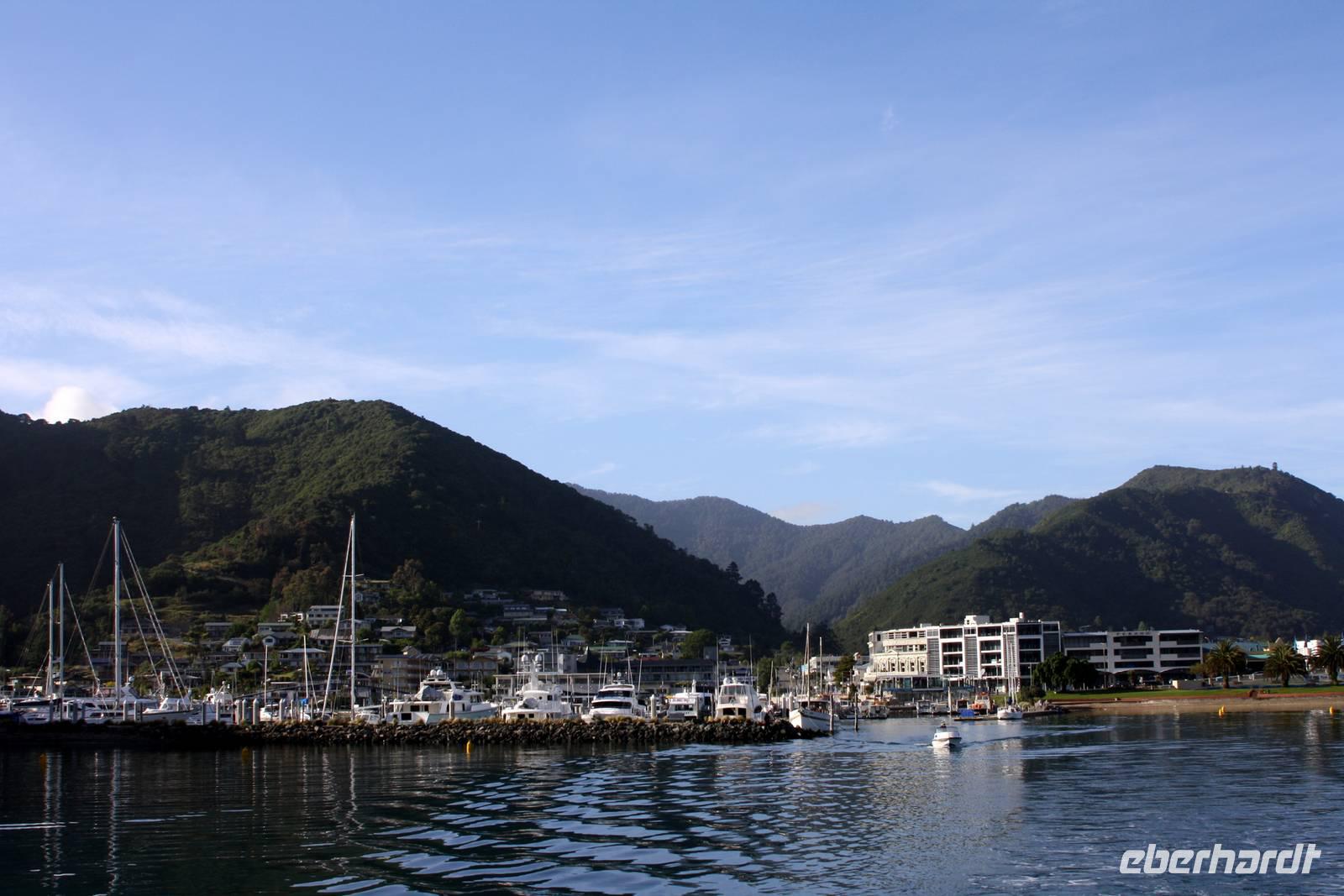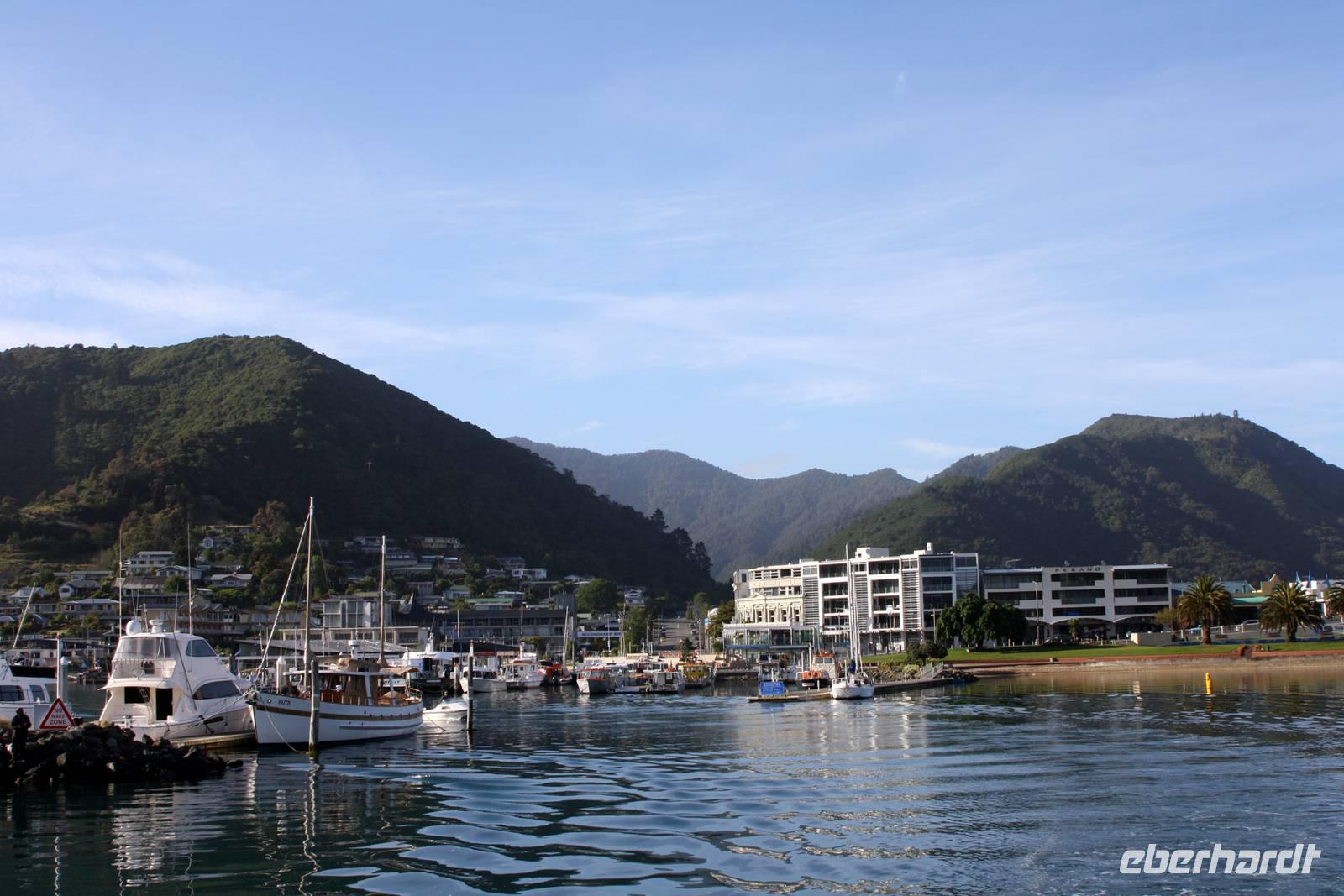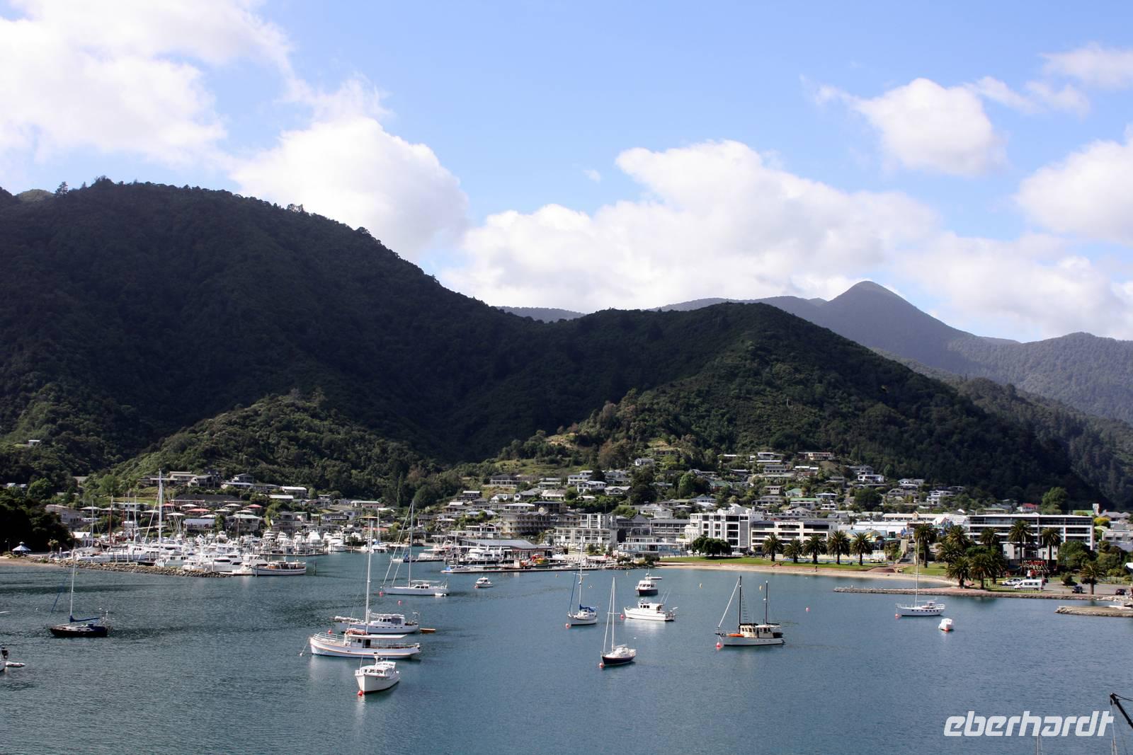 Heute lernen wir die Schönheiten des Nelson Lakes Nationalparks näher kennen. Unsere Wanderung führt uns durch Südbuchenwald mit einem wunderbaren morgendlichen Konzert. Der Weg ist naturbelassen und erinnert ein wenig an unsere Wanderwege in der Sächsischen Schweiz. Hampi fährt uns noch zu einem wunderbaren Aussichtspunkt am Mount Roberts, von wo sich uns ein toller Blick auf den See und die Berge und Wälder bietet. Ein Gläschen Sauvignon Blanc rundet dieses Erlebnis ab und wir stoßen auf eine schöne Reise an. Durch die Weinanbaugebiete von Marlborough geht es schließlich weiter in das kleine Hafenstädtchen Picton, wo wir übernachten.