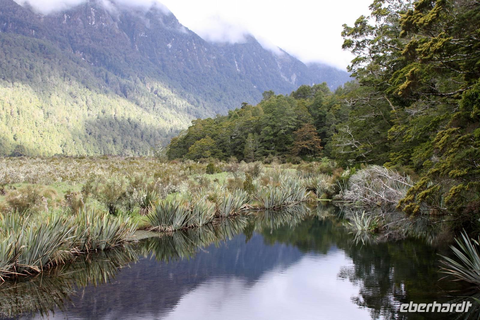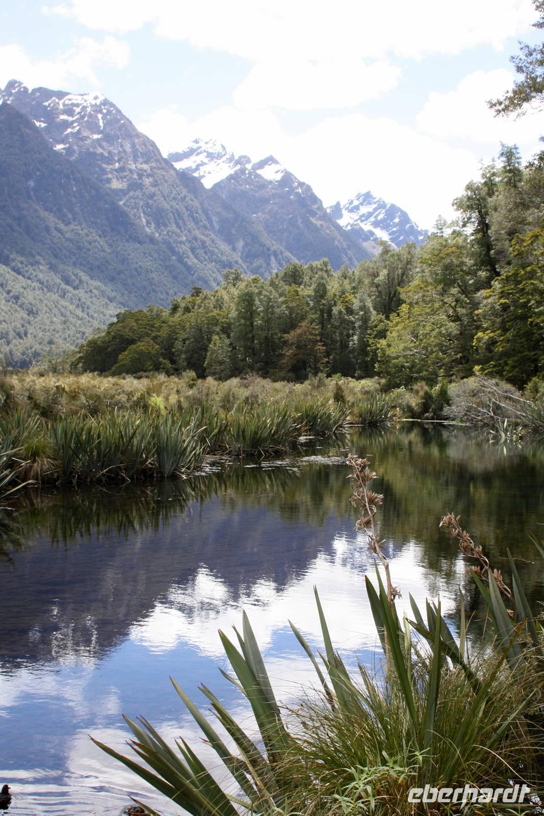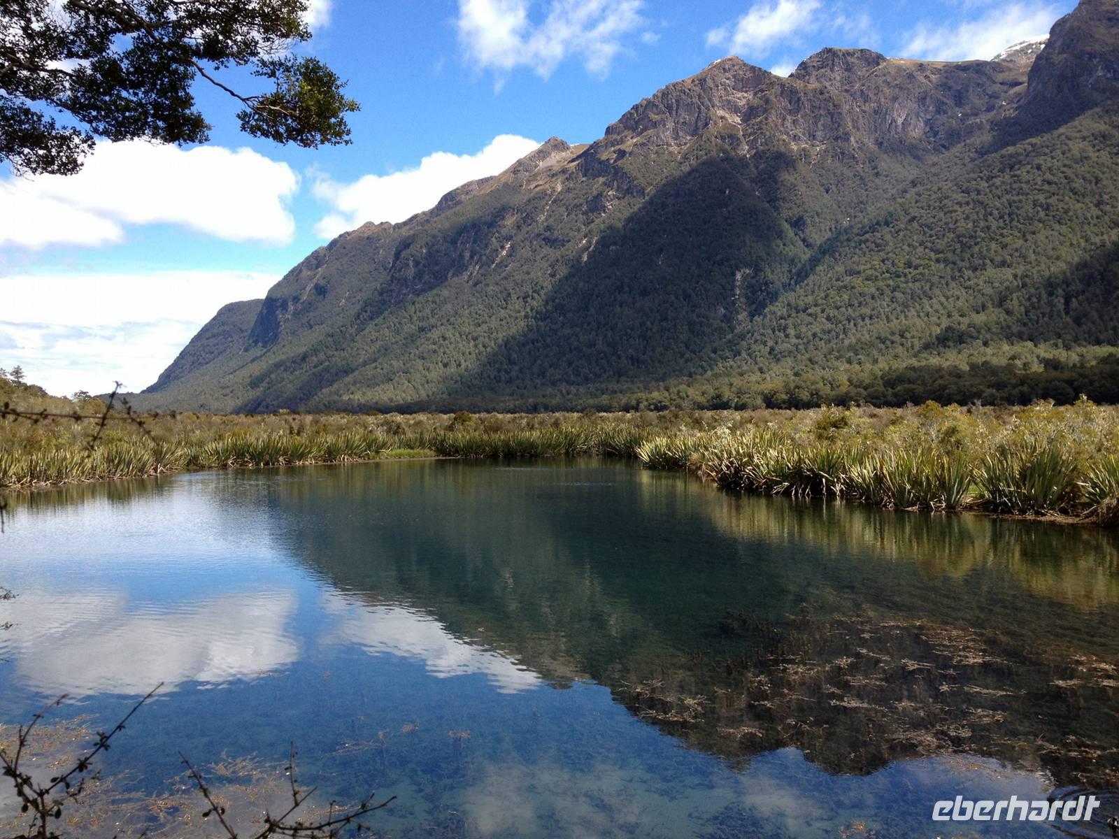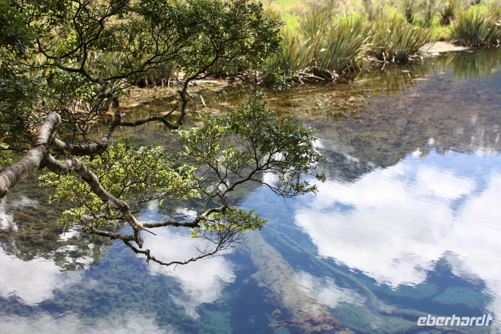 Wir reisen weiter entlang der Southern Scenic Route von der Küste in die Berge nach Te Anau, dem Tor zum Fiordland Nationalpark. Die Regenschauer während der Busfahrt stören uns wenig, denn sonst wäre es hier wohl kaum so grün. Die Landschaft um den Lake Manapouri und den Lake Te Anau ist traumhaft schön und auch das Wetter meint es wieder gut mit uns. Nach dem Mittag unternehmen wir eine Wanderung auf einem Teilstück des berühmten Kepler Tracks. Der Weg führt durch Neuseeländischen Buchenwald entlang des Waiau Rivers. Der Wald wirkt fast märchenhaft mit all den Moosen, Farnen und Flechten. Am Abend besuchen wir das Kino in Te Anau und lernen das Fiordland aus einer besonderen Perspektive kennen. Der Film „Ata Whenua" (Land der Schatten) zeigt spektakuläre Bilder der Region und lädt zum Träumen ein.