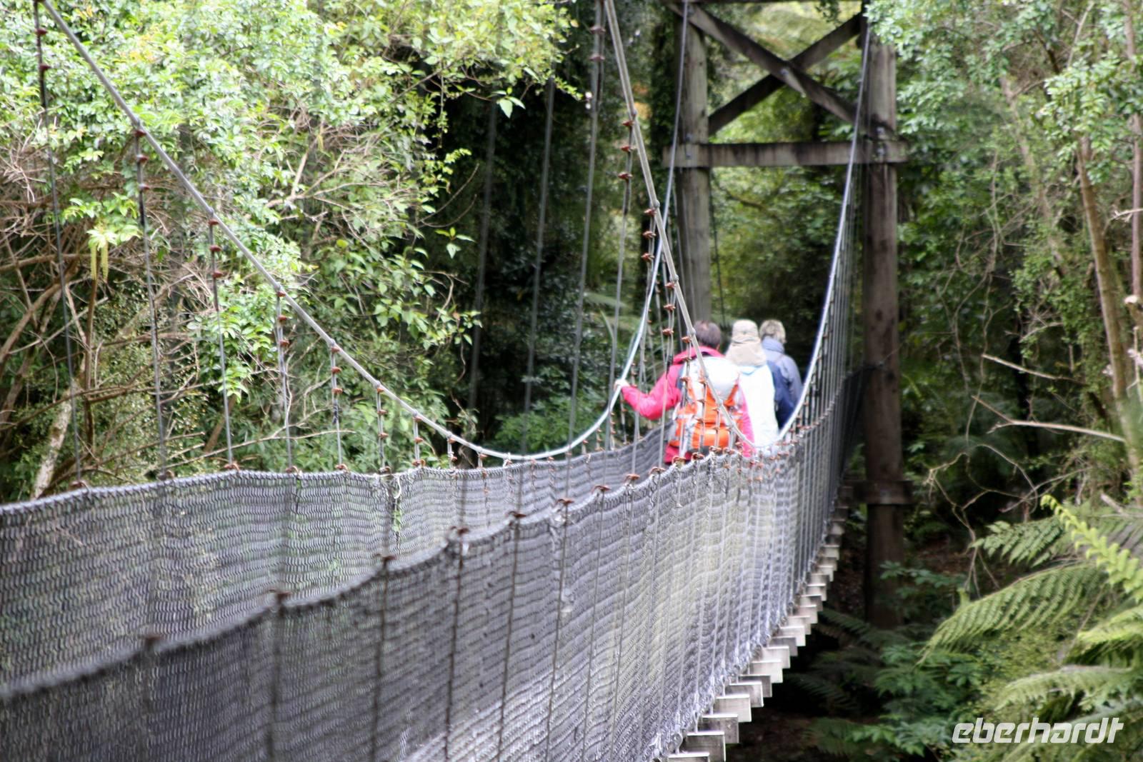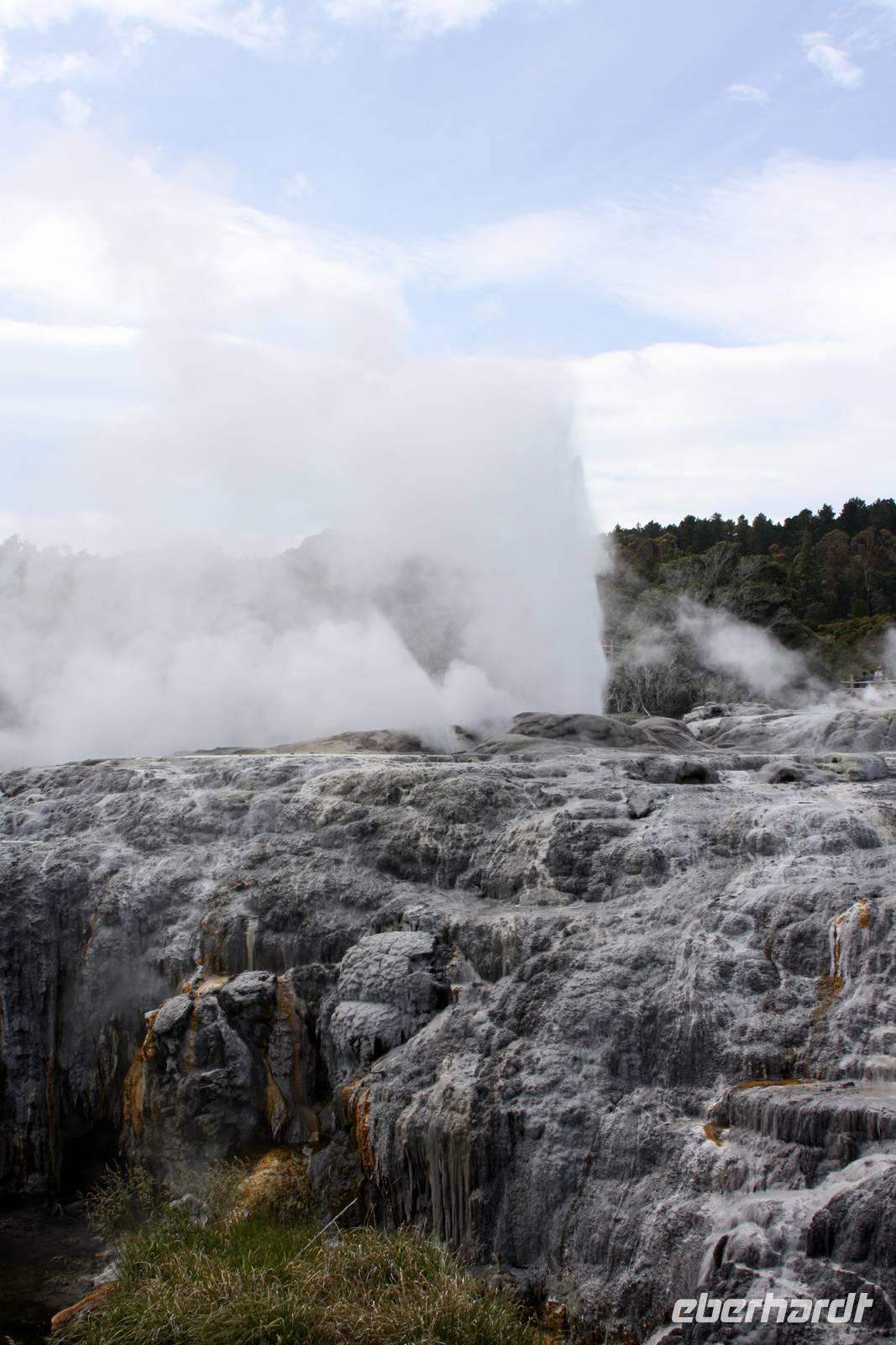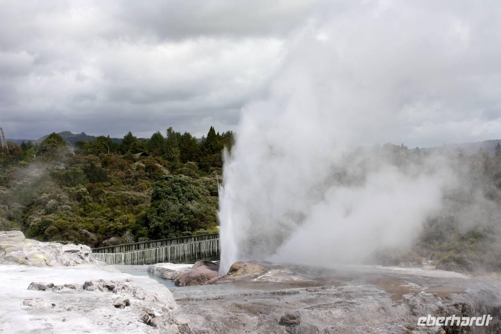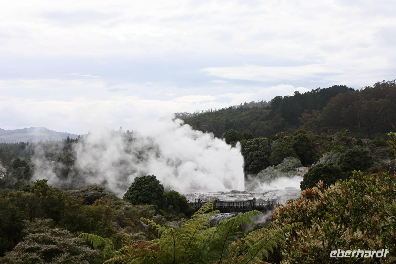 Am Vormittag besuchen wir die „Hexenküche" im Te Puia. Die Erdkruste ist hier so dünn, dass es überall dampft und blubbert. Der Pohutu-Geysir schießt eine Wassersäule in den Himmel und im Kiwi-Haus können wir endlich auch den seltsamen Vogel live beobachten. Nach einer Mittagspause am Lake Rotorua fahren wir in die Redwoods. Hier unternehmen wir eine Wanderung durch den Wald aus eingeführten Redwood- und Eukalyptus-Bäumen sowie einheimischen Baumfarnen (Mamaku und Ponga). Am Abend lernen wir bei dem traditionellen Hangi im Hotel nicht nur die Küche der Maori kennen sondern auch Tänze und Gesang. Der Chief kommt aus unseren Reihen und schlägt sich tapfer !