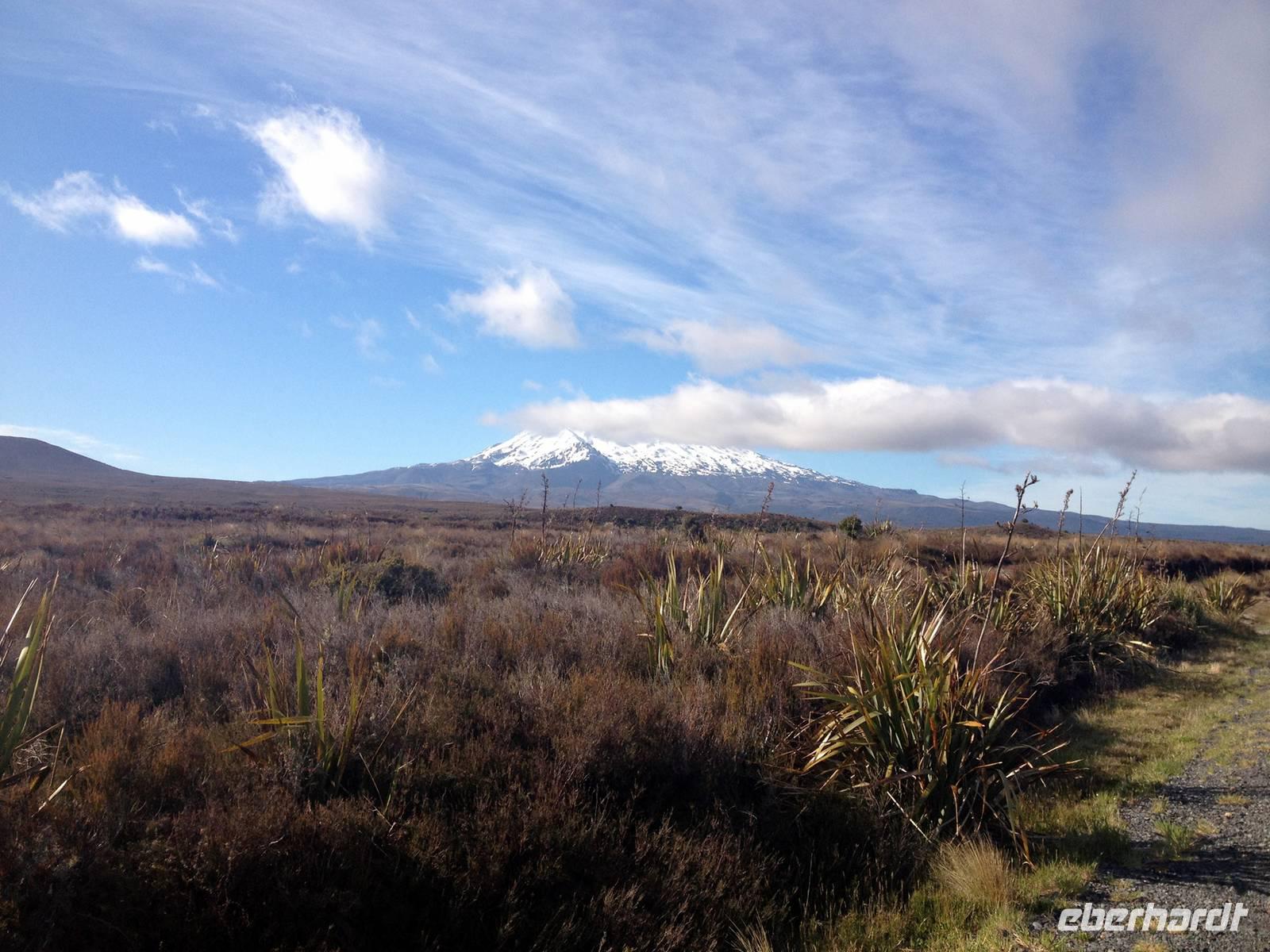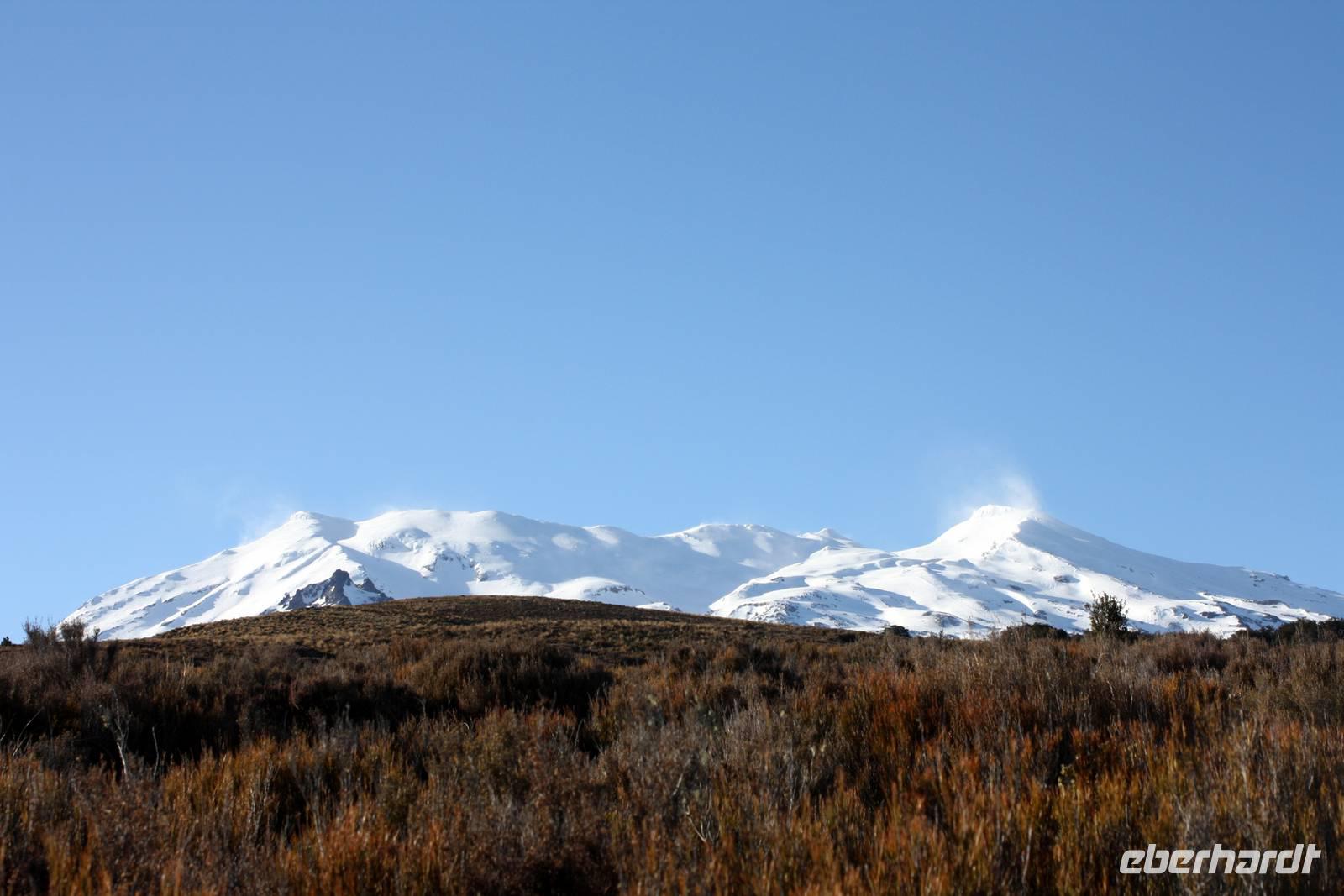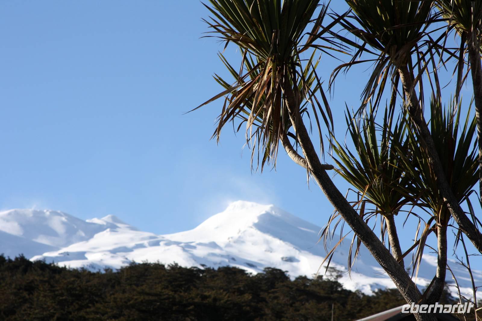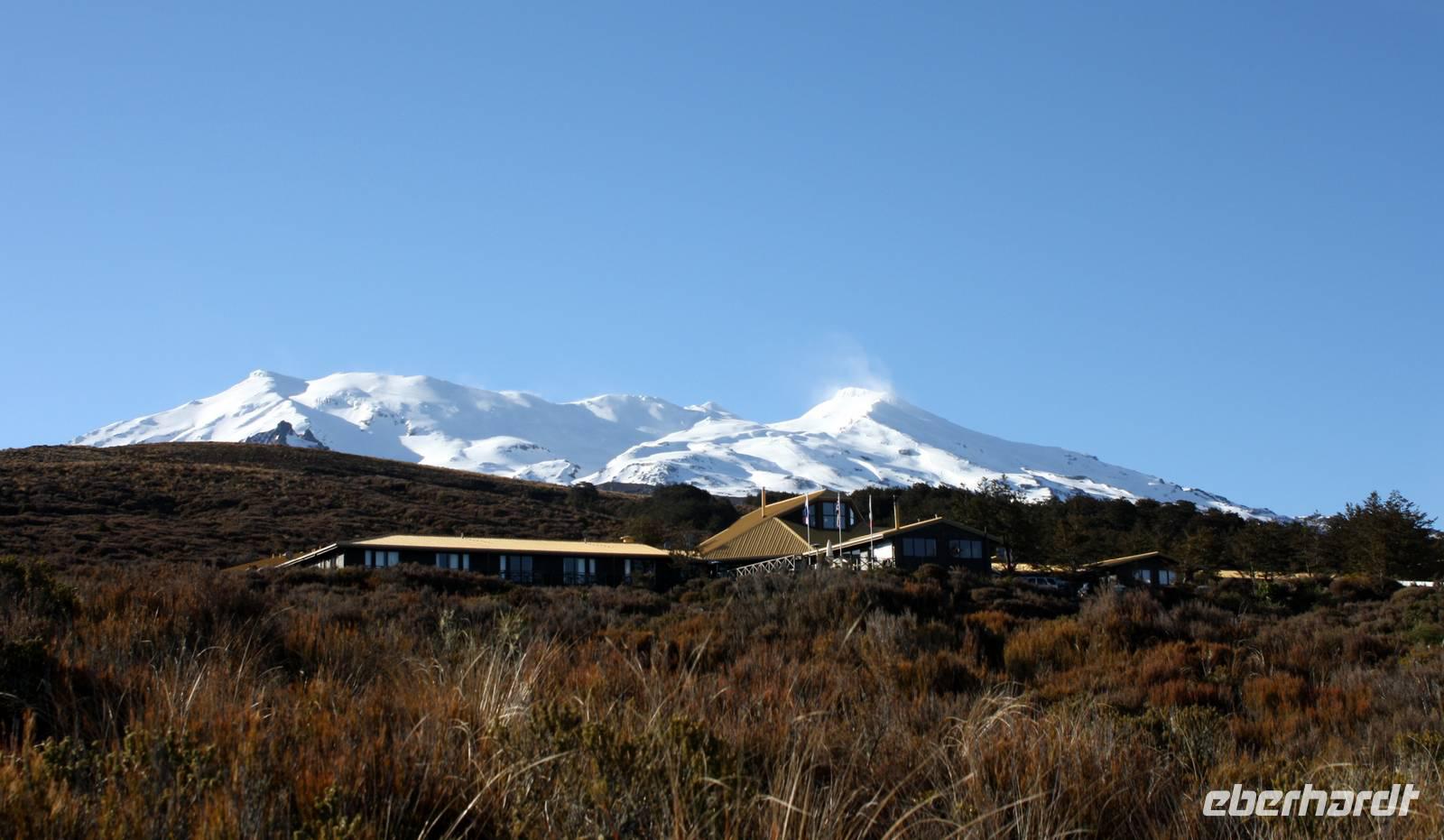 Heute gönnen wir unseren Füßen noch einmal eine Ruhepause. In der Tageszeitung wird von den Stars und Sternchen von der Filmpremiere am Vortag berichtet und wir waren ganz nah dran! Bevor wir Wellington verlassen, legen wir noch einen Stopp auf dem Mount Victoria ein. Von hier haben wir einen tollen Blick auf die Stadt, den Hafen und die Umgebung. Es zeigt sich schnell, dass die Nordinsel deutlich urbaner ist. Wir fahren in nördlicher Richtung entlang der Kapiti Coast durch kleinere Städte, danach wechselt das Landschaftsbild wieder zu grünen Hügeln mit Schaf- und Kuhweiden, bis wir auf das Hochplateau des Tongariro Nationalparks gelangen. Unsere Unterkunft liegt im Herzen der Nordinsel auf ca. 1.100 Meter Höhe und auf den Gipfeln der drei Vulkane liegt immer noch Schnee. Erst vor einer Woche war der Ausbruch am Tongariro und die Aktivitäten werden hier ganz genau beobachtet.