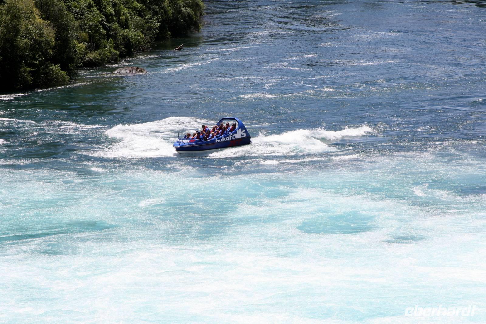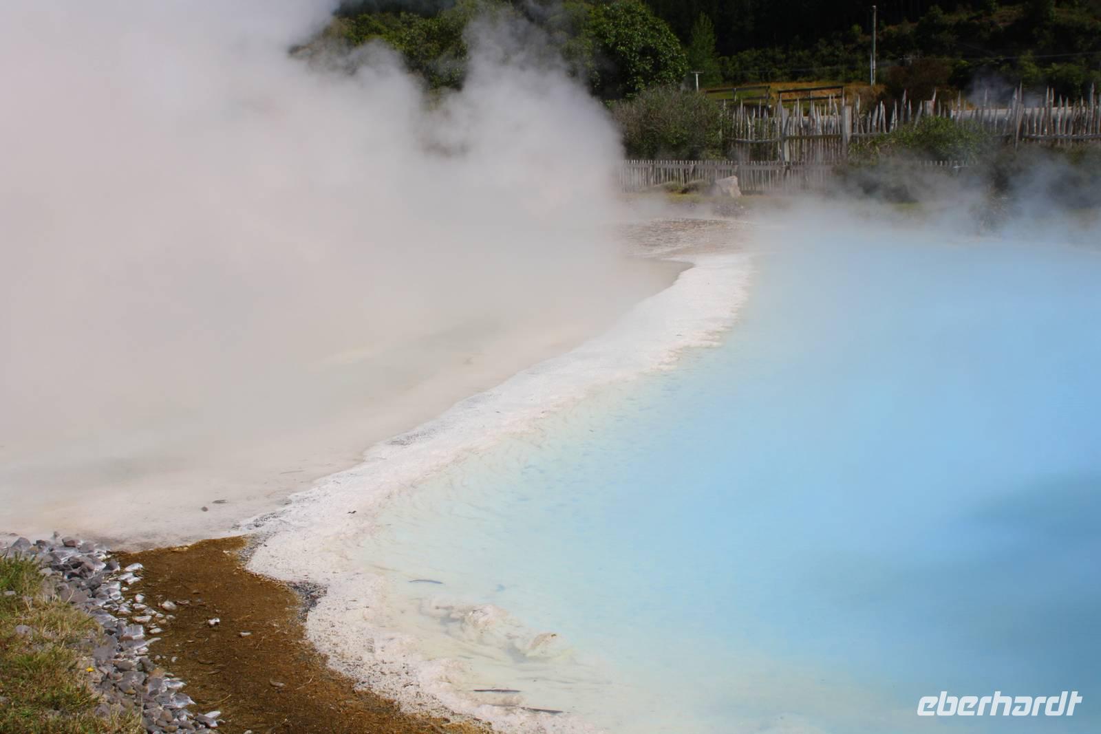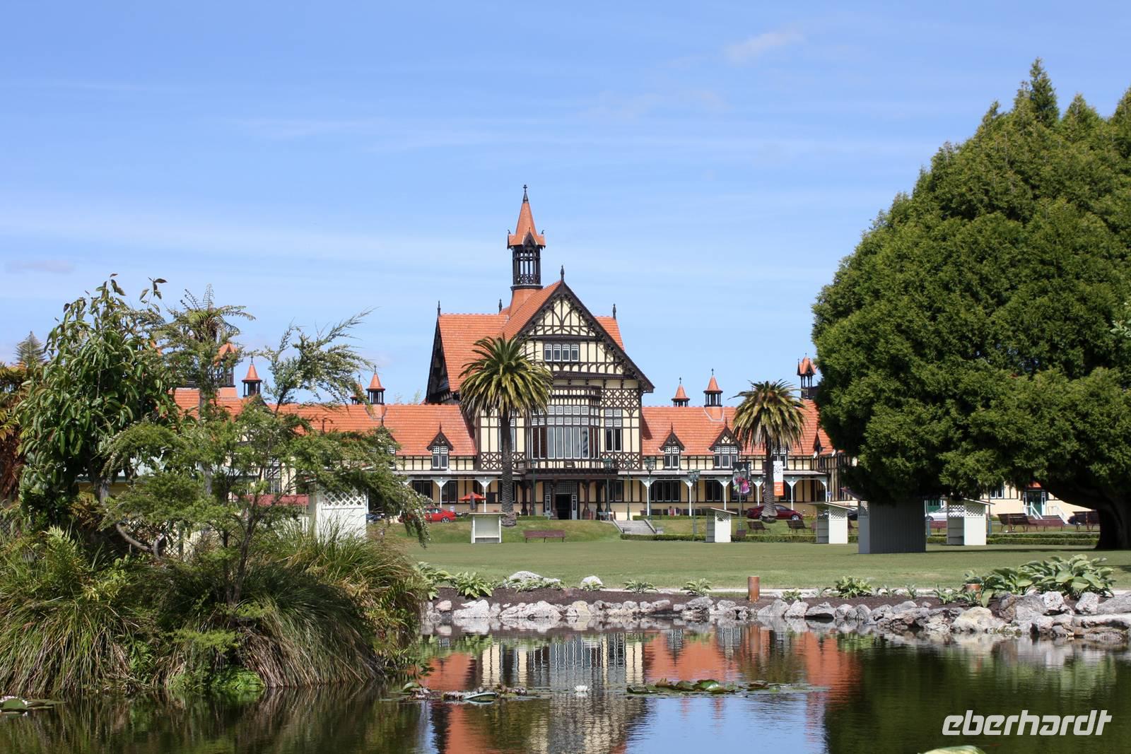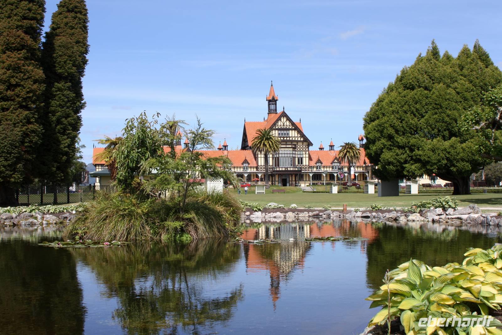 Am Morgen zeigen sich die Vulkane zum Abschied noch einmal unter blauem Himmel und bei Sonnenschein. Wir sehen sogar den rauchenden Vulkan-Krater des Tongariro, der vor gut einer Woche ausgebrochen ist. Am Ufer des größten Binnensees von Neuseeland, dem Lake Taupo, fahren wir nach Wairakei. Hier wird die geothermale Energie durch Kraftwerke genutzt. An den Wairakei Terraces bekommen wir einen Einblick in die Kultur der Maori. Nach einem Rundgang auf dem Gelände mit den heißen Quellen treffen wir Atamira, die Stammesälteste der Tuwharetoa. Sie beantwortet uns bei einer Tasse Tee persönlich jegliche Fragen zur Kultur der Maori. Auf unserer Weiterreise legen wir einen Stopp bei den Huka-Falls ein. Der längste Fluss Neuseelands, der Waikato-River, bahnt sich hier mit unglaublicher Kraft seinen Weg. In Taupo findet pünktlich zum 1. Dezember eine bunte Weihnachtsparade statt - für uns etwas merkwürdig mit den sommerlichen Temperaturen! Rotorua riecht man schon lange bevor man es erreicht. Aus der Erde steigt Dampf auf und in Schlammtümpeln blubbert es. Nicht nur wir bekommen hier warme Füße, sondern auch die Manuka- und Kanuka-Bäume, die hier schon herrlich blühen. Nach dem Besuch der Government Gardens mit dem Badehaus im Tudor-Stil checken wir im Hotel ein.