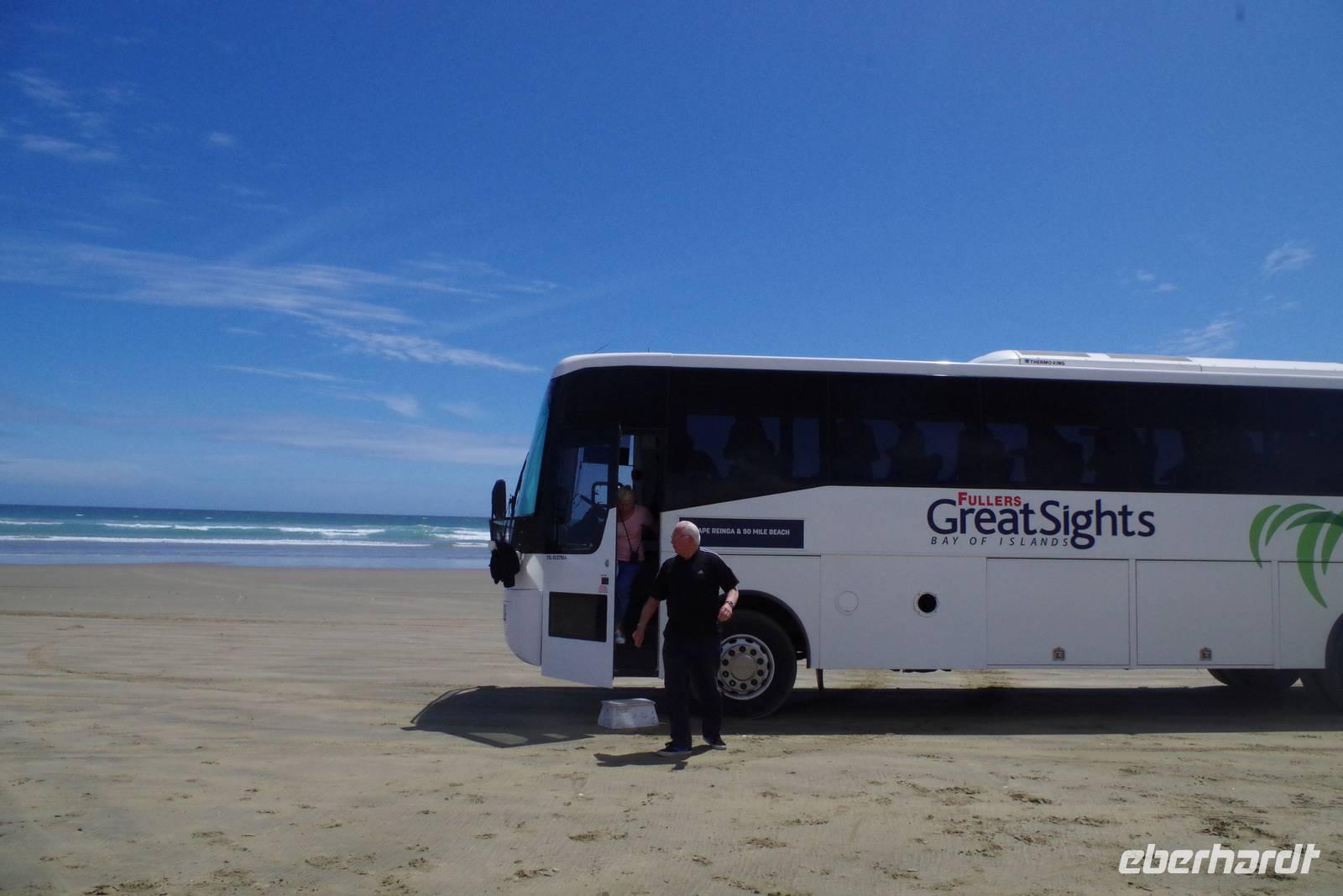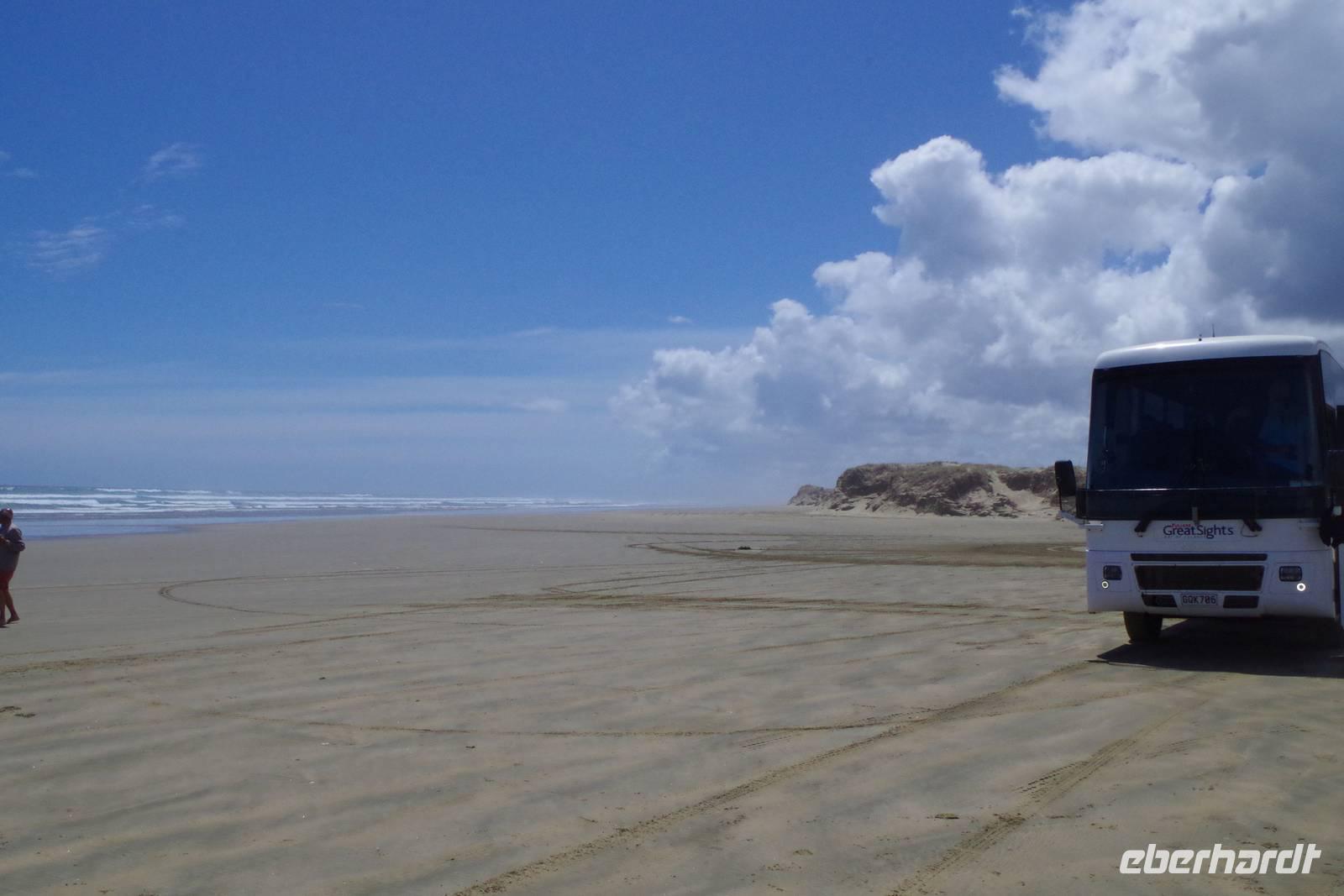 Der Tag begann somit für uns mit einem sehr zeitigen Frühstück denn bis zum Cap Reinga lagen 250 Kilometer vor uns. Unser Maori Fahrer begrüßte uns mit einem Maori Lied und erzählte uns viele interessante Sachen zur Umgebung und zum Leben der Maoris. Da das Wetter heute auf der Kippe stand, fuhren wir auf direktem Weg zum Cap Reinga. Und es hatte sich gelohnt. Der Spaziergang zum Leuchtturm und der Blick auf das Meer, wo sich die Tasman See mit dem Pazifischen Ozean verbindet, sind einfach unbeschreiblich. Wir waren alle froh, den Weg noch einmal auf uns genommen zu haben und wurden mit der Aussicht belohnt. Nach einer Mittagspause fuhren wir mit dem Bus noch am 9 Mile Beach entlang. Es ist schon beeindruckend, wenn der große Bus auf dem Strand am Wasser entlang fährt. Der Abschluss bot ein kleiner Spaziergang zum Kauriwald. Am späten Abend kamen wir erschöpft und mit vielen Eindrücken wieder im Hotel an.