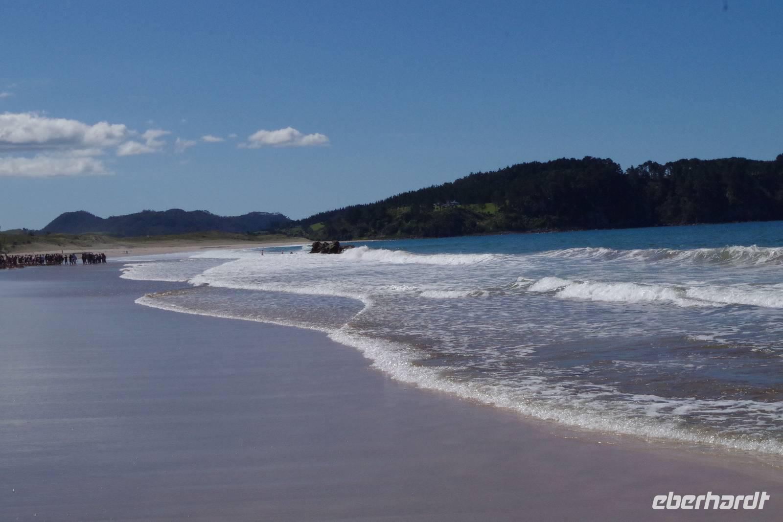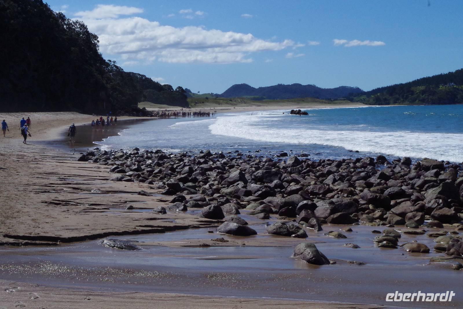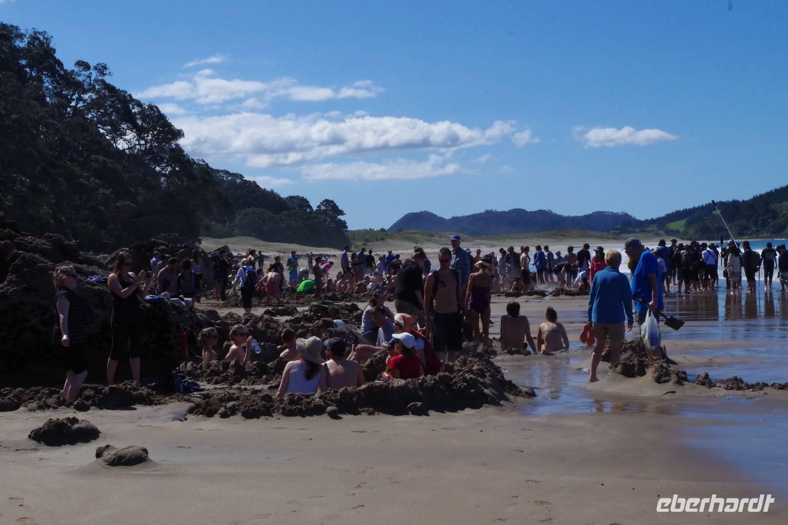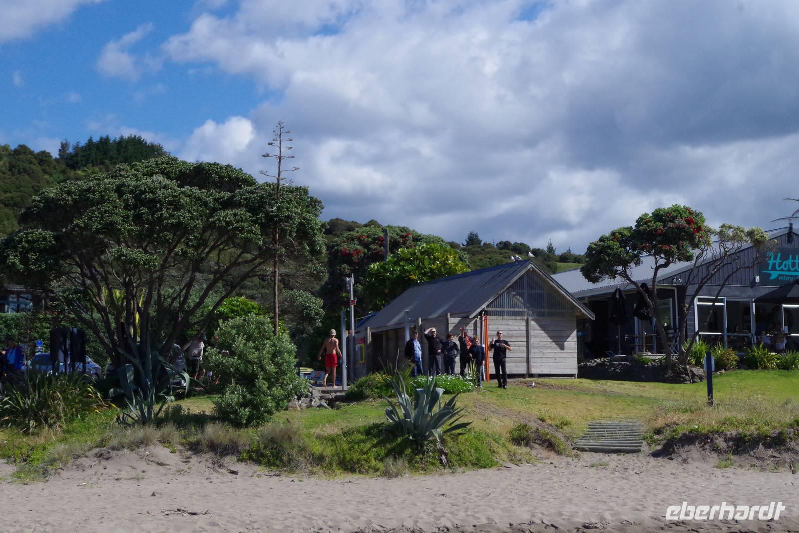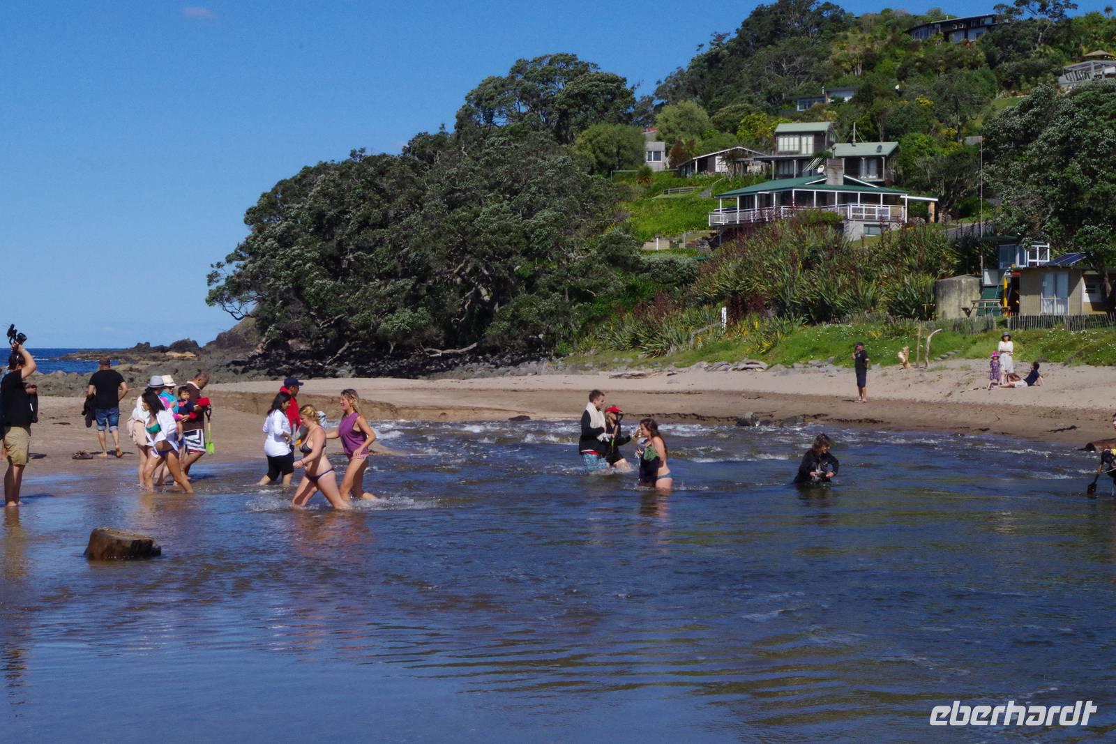 Nach einer erholsamen Nacht und einem echten Farmersfrühstück müssen wir leider bereits wieder Abschied von der Familie nehmen. Ein wahrhaft spannendes Erlebnis, wobei wir einmal tief in das Leben der Farmer Neuseelands blicken durften. Beim Wiedertreffen der Gruppe erzählen alle von ihren Erlebnissen. Für uns ging die Fahrt nun weiter zu Coromandel Halbinsel. Am Strand konnten wir erste schöne Fotos machen. Ziel des Tages war der Ort Tairua welcher ca. 150 km östlich von Auckland liegt. Nach einer ausgiebigen Mittagspause machten wir uns, bepackt mit Handtüchern und Schaufeln, auf Richtung Cathedral Code. Nach einer kleinen Wanderung bei schönsten Sonnenschein dieses Stück Küstenschutzgebiet genießen. Wieder am Bus angekommen machten wir uns auf zum letzten Stopp des heutigen Tages. Der Hot Water Beach ist ein Standabschnitt an der Pazifikküste. Der Strand trägt seinen Namen wegen des Austrittes von Thermalwasser. Also nahmen wir uns unsere Handtücher und die Schaufeln und wollten uns davon überzeigen. Der kleine Spaziergang am Strand entlang war ein Klacks und wir genossen es unsere Füße im heißten Strand zu baden.