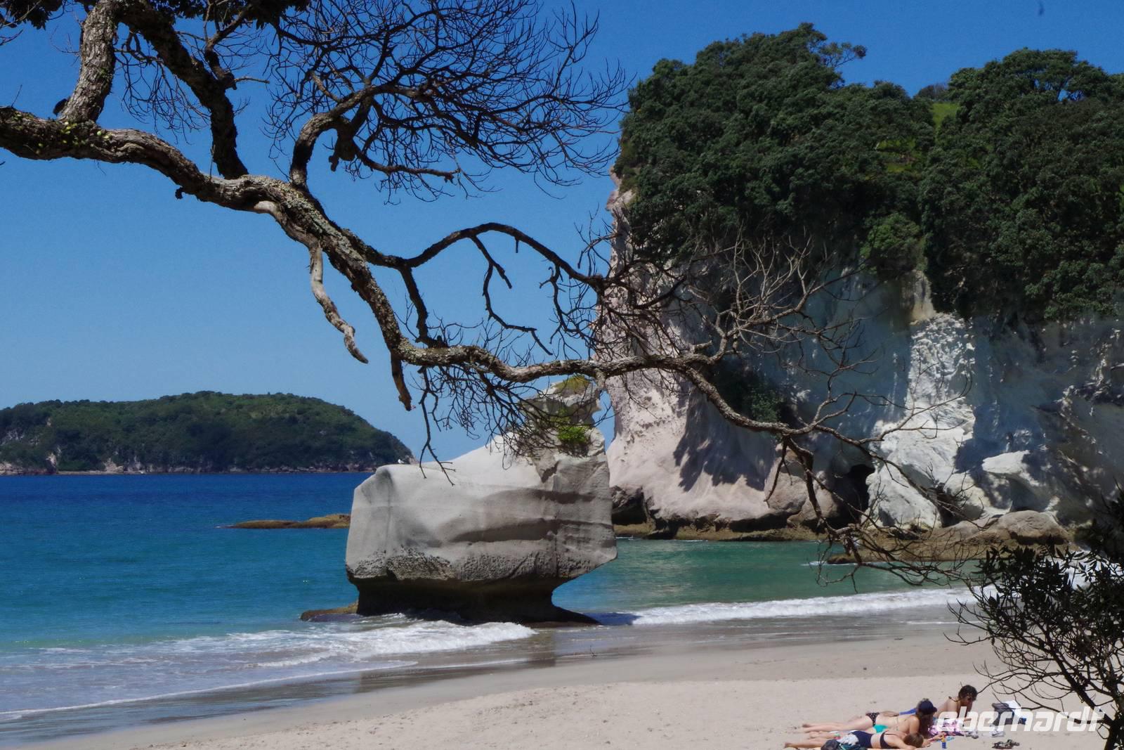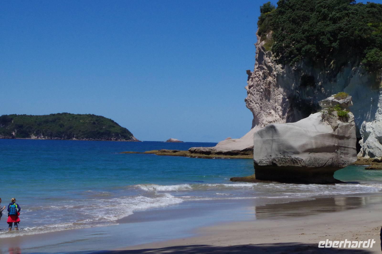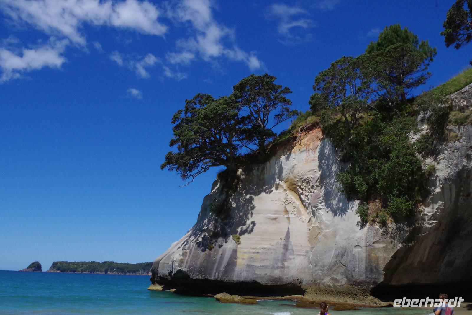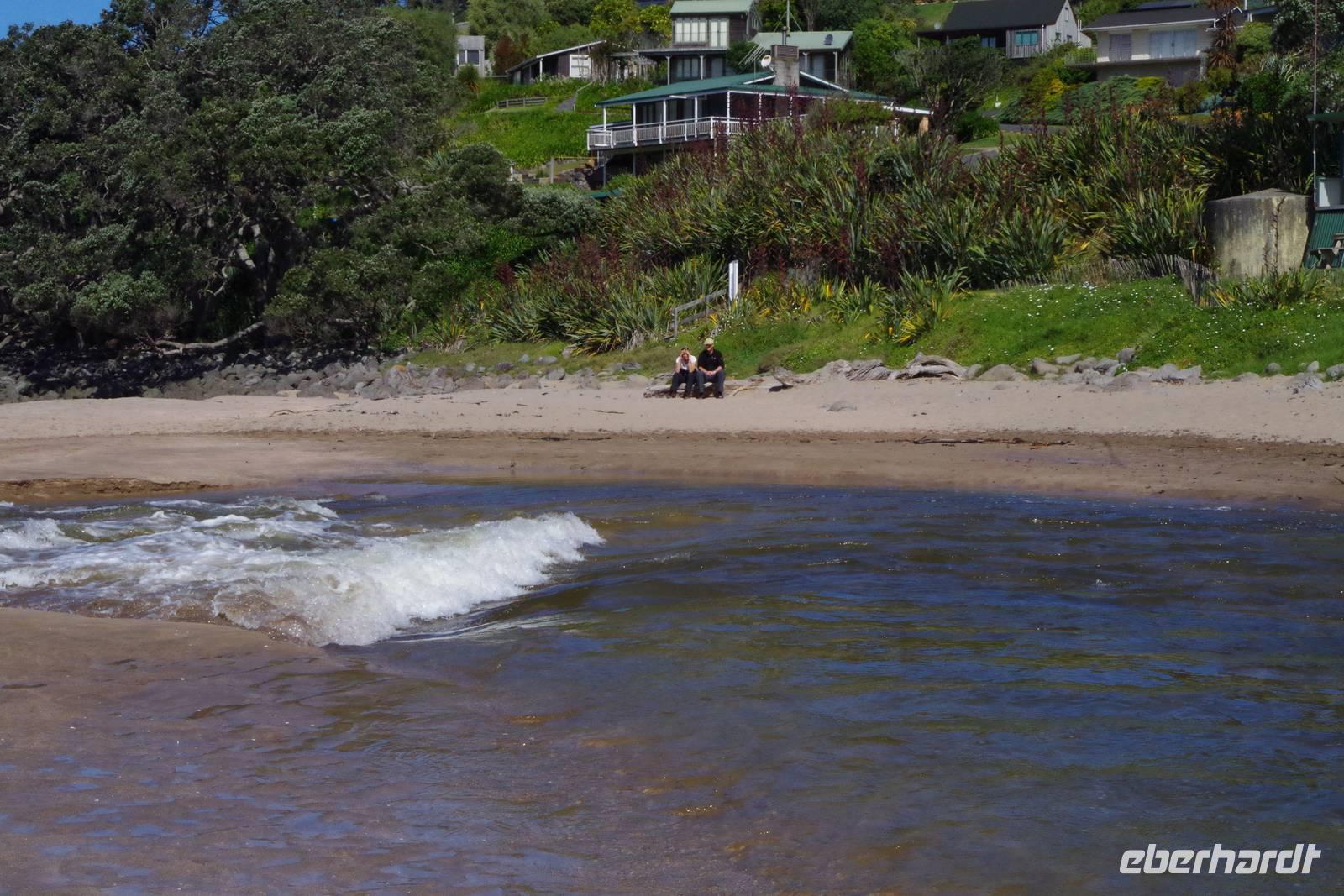 Nach einer erholsamen Nacht und einem echten Farmersfrühstück müssen wir leider bereits wieder Abschied von der Familie nehmen. Ein wahrhaft spannendes Erlebnis, wobei wir einmal tief in das Leben der Farmer Neuseelands blicken durften. Beim Wiedertreffen der Gruppe erzählen alle von ihren Erlebnissen. Für uns ging die Fahrt nun weiter zu Coromandel Halbinsel. Am Strand konnten wir erste schöne Fotos machen. Ziel des Tages war der Ort Tairua welcher ca. 150 km östlich von Auckland liegt. Nach einer ausgiebigen Mittagspause machten wir uns, bepackt mit Handtüchern und Schaufeln, auf Richtung Cathedral Code. Nach einer kleinen Wanderung bei schönsten Sonnenschein dieses Stück Küstenschutzgebiet genießen. Wieder am Bus angekommen machten wir uns auf zum letzten Stopp des heutigen Tages. Der Hot Water Beach ist ein Standabschnitt an der Pazifikküste. Der Strand trägt seinen Namen wegen des Austrittes von Thermalwasser. Also nahmen wir uns unsere Handtücher und die Schaufeln und wollten uns davon überzeigen. Der kleine Spaziergang am Strand entlang war ein Klacks und wir genossen es unsere Füße im heißten Strand zu baden.