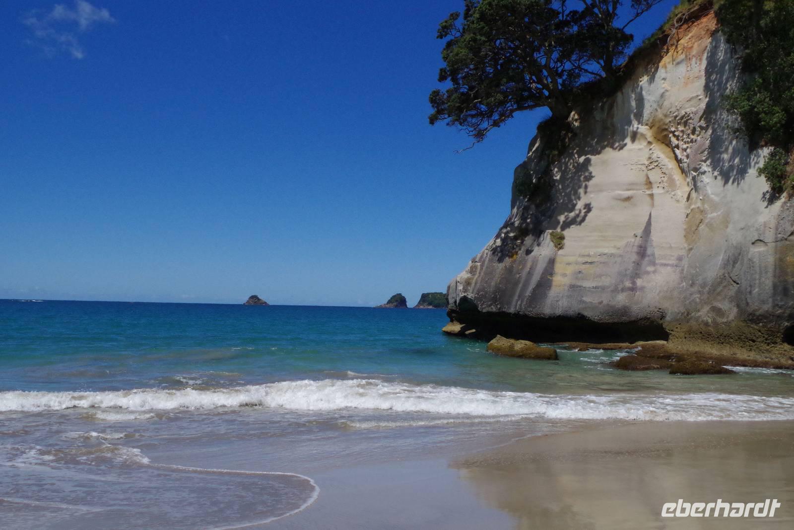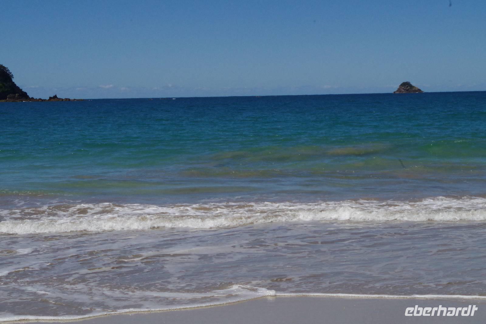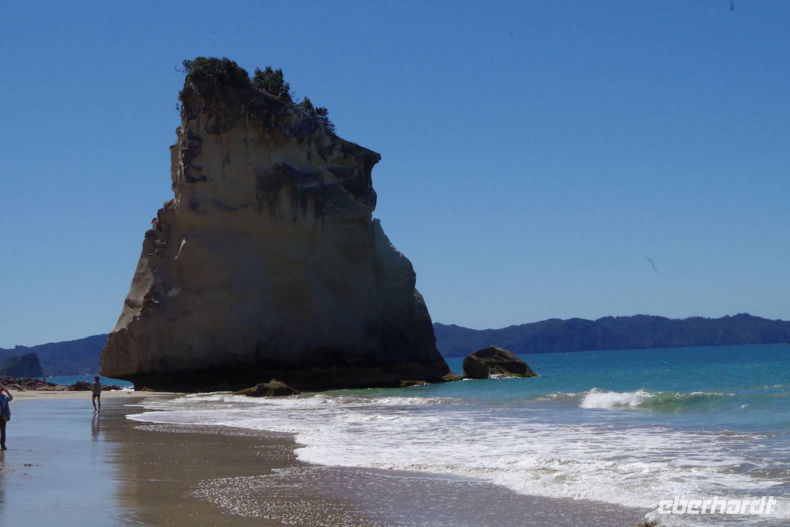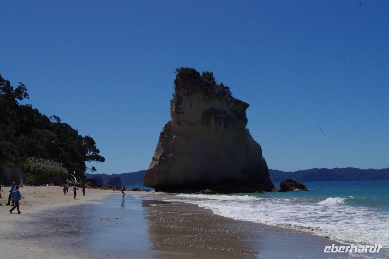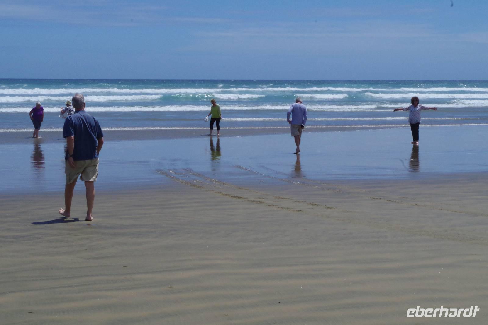 Nach einer erholsamen Nacht und einem echten Farmersfrühstück müssen wir leider bereits wieder Abschied von der Familie nehmen. Ein wahrhaft spannendes Erlebnis, wobei wir einmal tief in das Leben der Farmer Neuseelands blicken durften. Beim Wiedertreffen der Gruppe erzählen alle von ihren Erlebnissen. Für uns ging die Fahrt nun weiter zu Coromandel Halbinsel. Am Strand konnten wir erste schöne Fotos machen. Ziel des Tages war der Ort Tairua welcher ca. 150 km östlich von Auckland liegt. Nach einer ausgiebigen Mittagspause machten wir uns, bepackt mit Handtüchern und Schaufeln, auf Richtung Cathedral Code. Nach einer kleinen Wanderung bei schönsten Sonnenschein dieses Stück Küstenschutzgebiet genießen. Wieder am Bus angekommen machten wir uns auf zum letzten Stopp des heutigen Tages. Der Hot Water Beach ist ein Standabschnitt an der Pazifikküste. Der Strand trägt seinen Namen wegen des Austrittes von Thermalwasser. Also nahmen wir uns unsere Handtücher und die Schaufeln und wollten uns davon überzeigen. Der kleine Spaziergang am Strand entlang war ein Klacks und wir genossen es unsere Füße im heißten Strand zu baden.