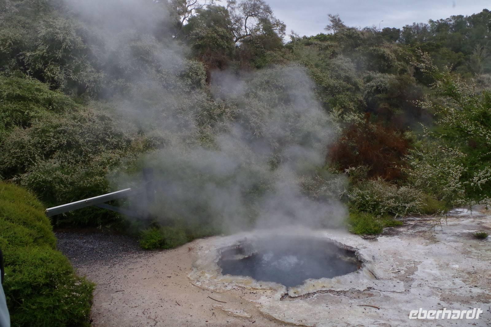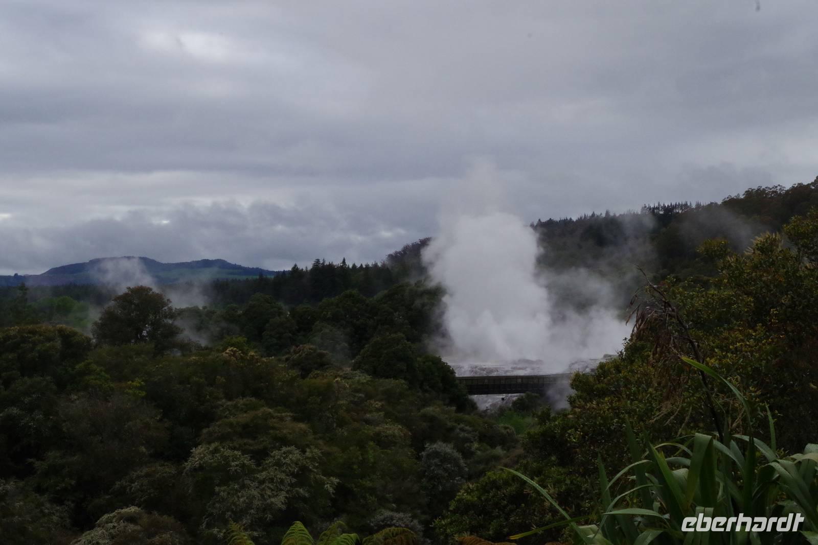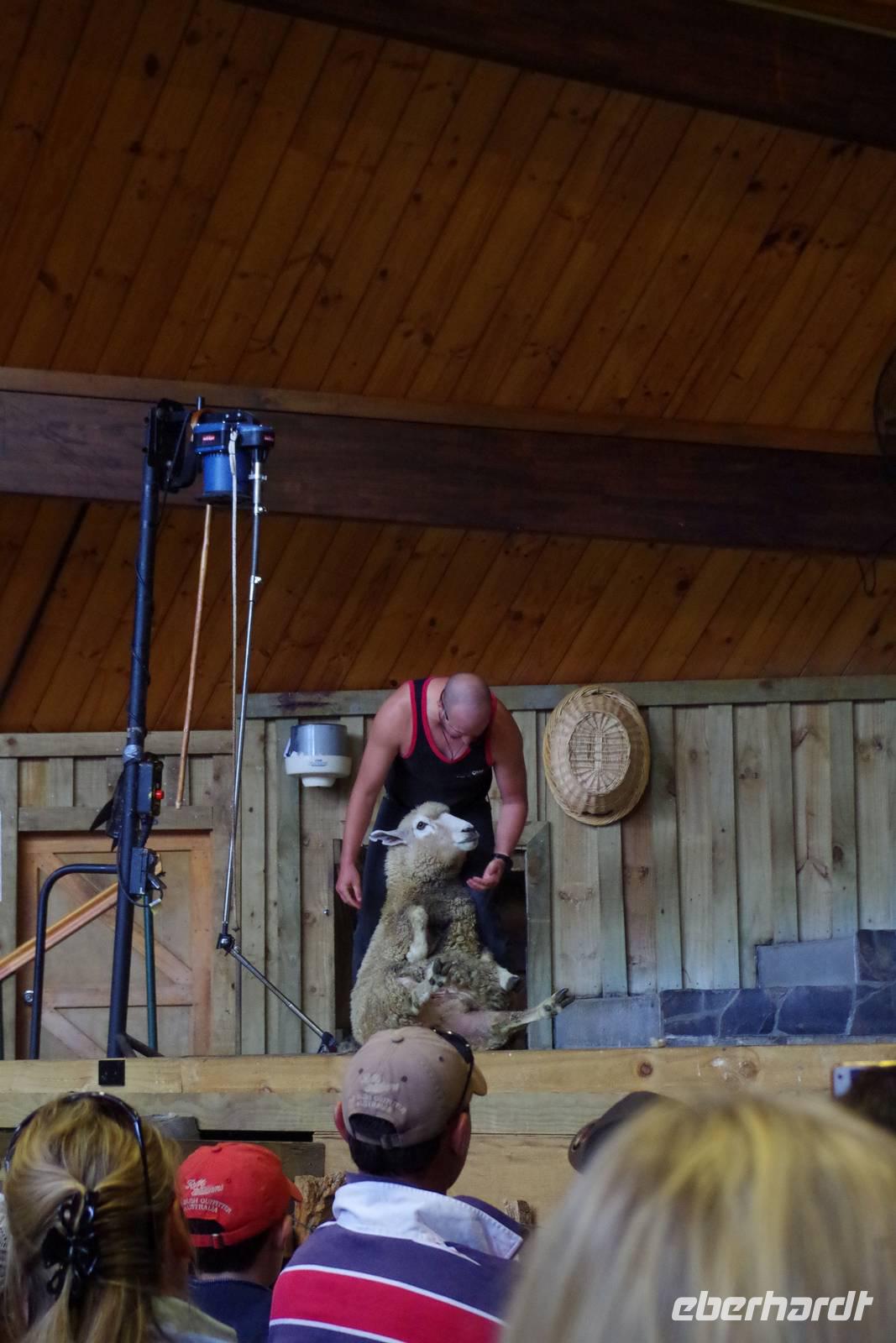 Wenn man zu Besuch in Roturua ist, darf natürlich ein Besuch der Geysire nicht fehlen. Im Thermalgebiet „Te Puia" schauen wir uns einmal diese heißen Quellen genauer an. Dabei ist natürlich das Spucken des Pohutu Geysir die Hauptattraktion. Überall brodelt und dampft es und heizt uns damit noch mal so richtig ein. Anschließend fuhren wir zum Agrodome, wo wir eine Schafshow der etwas anderen Art miterleben durften. Nachdem uns die einzelnen Schafarten vorgestellt werden, erleben wir das Scheren eines Schafes hautnah und gewinnen ebenfalls Einblicke in das Schaftreiben.