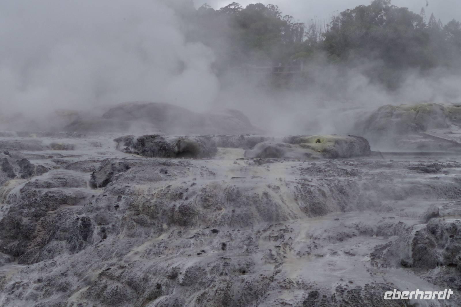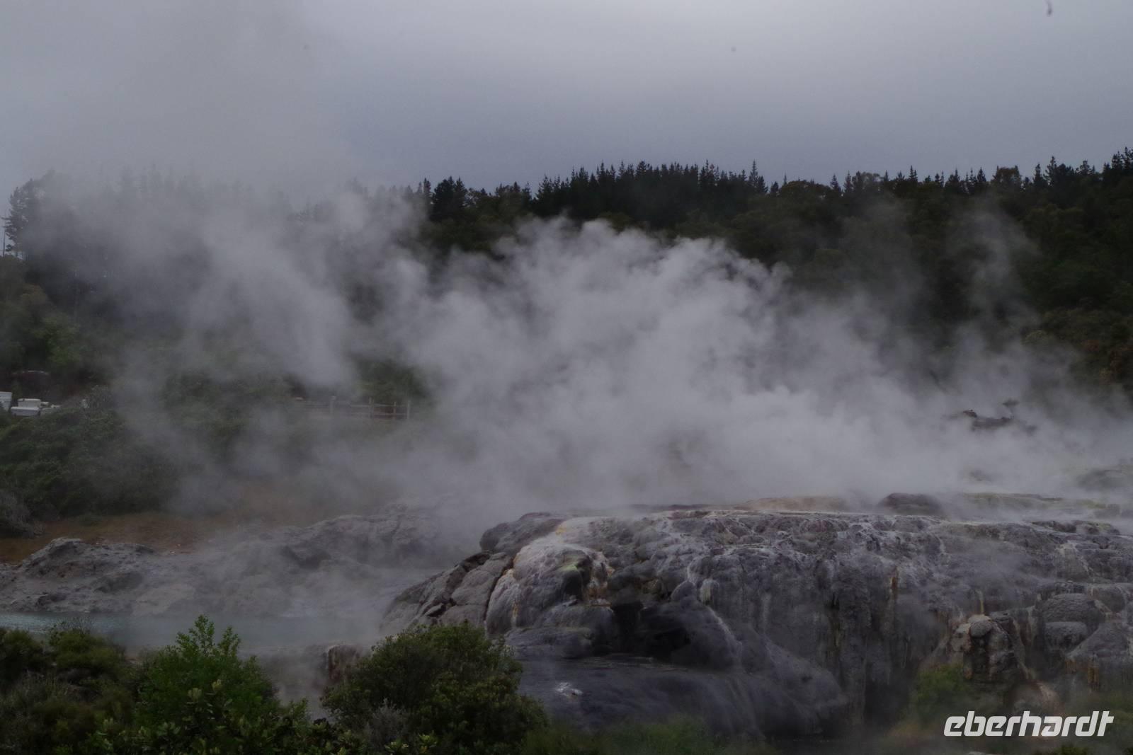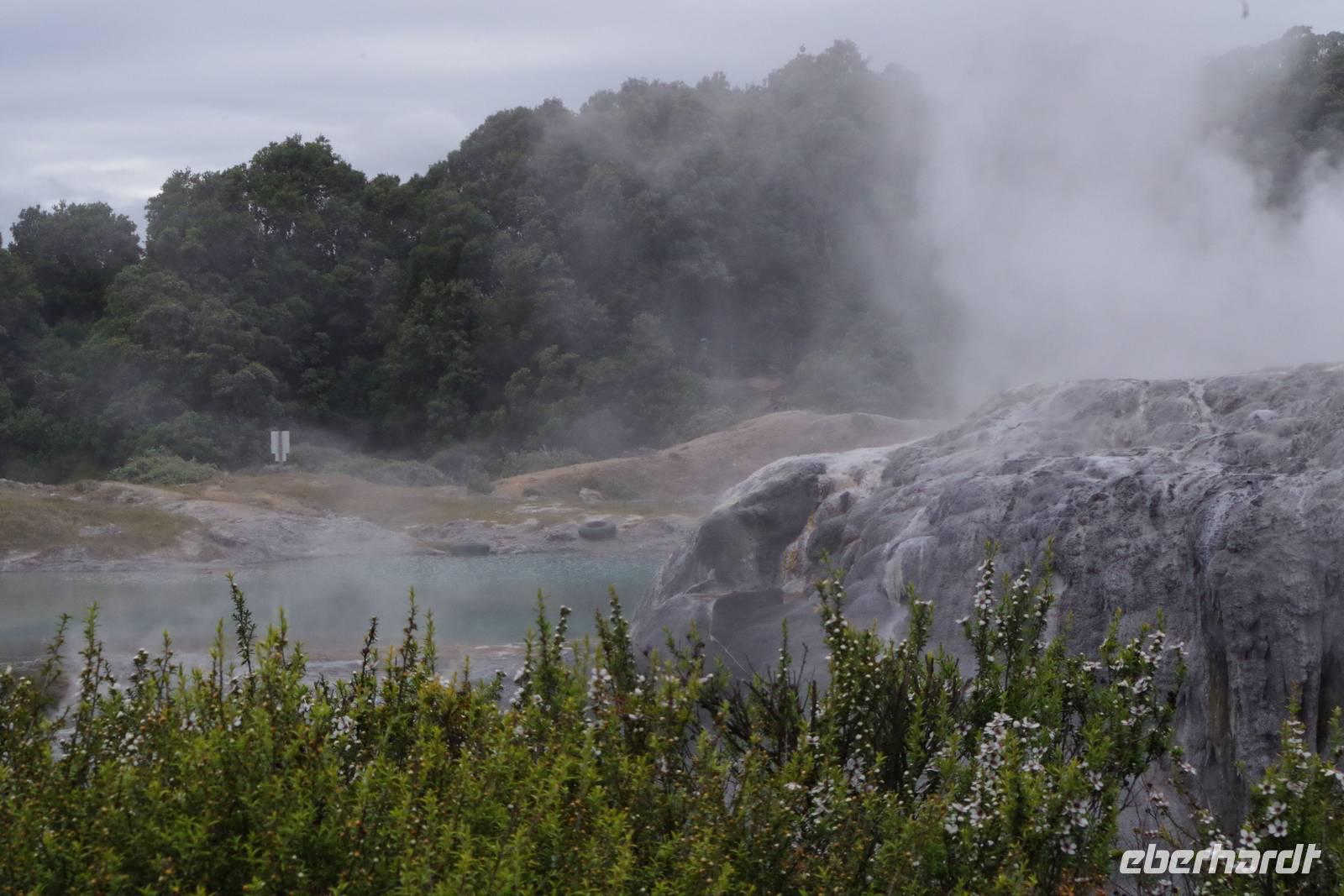 Wenn man zu Besuch in Roturua ist, darf natürlich ein Besuch der Geysire nicht fehlen. Im Thermalgebiet „Te Puia" schauen wir uns einmal diese heißen Quellen genauer an. Dabei ist natürlich das Spucken des Pohutu Geysir die Hauptattraktion. Überall brodelt und dampft es und heizt uns damit noch mal so richtig ein. Anschließend fuhren wir zum Agrodome, wo wir eine Schafshow der etwas anderen Art miterleben durften. Nachdem uns die einzelnen Schafarten vorgestellt werden, erleben wir das Scheren eines Schafes hautnah und gewinnen ebenfalls Einblicke in das Schaftreiben.