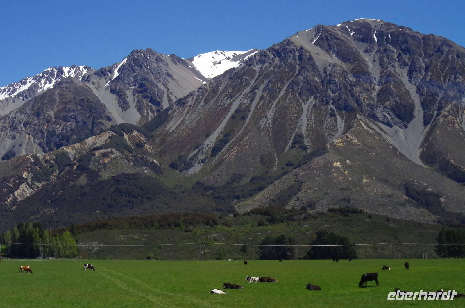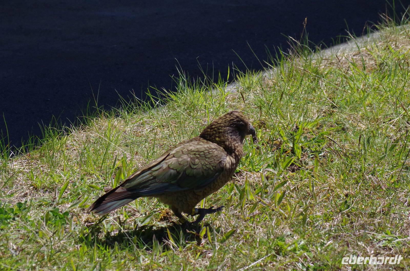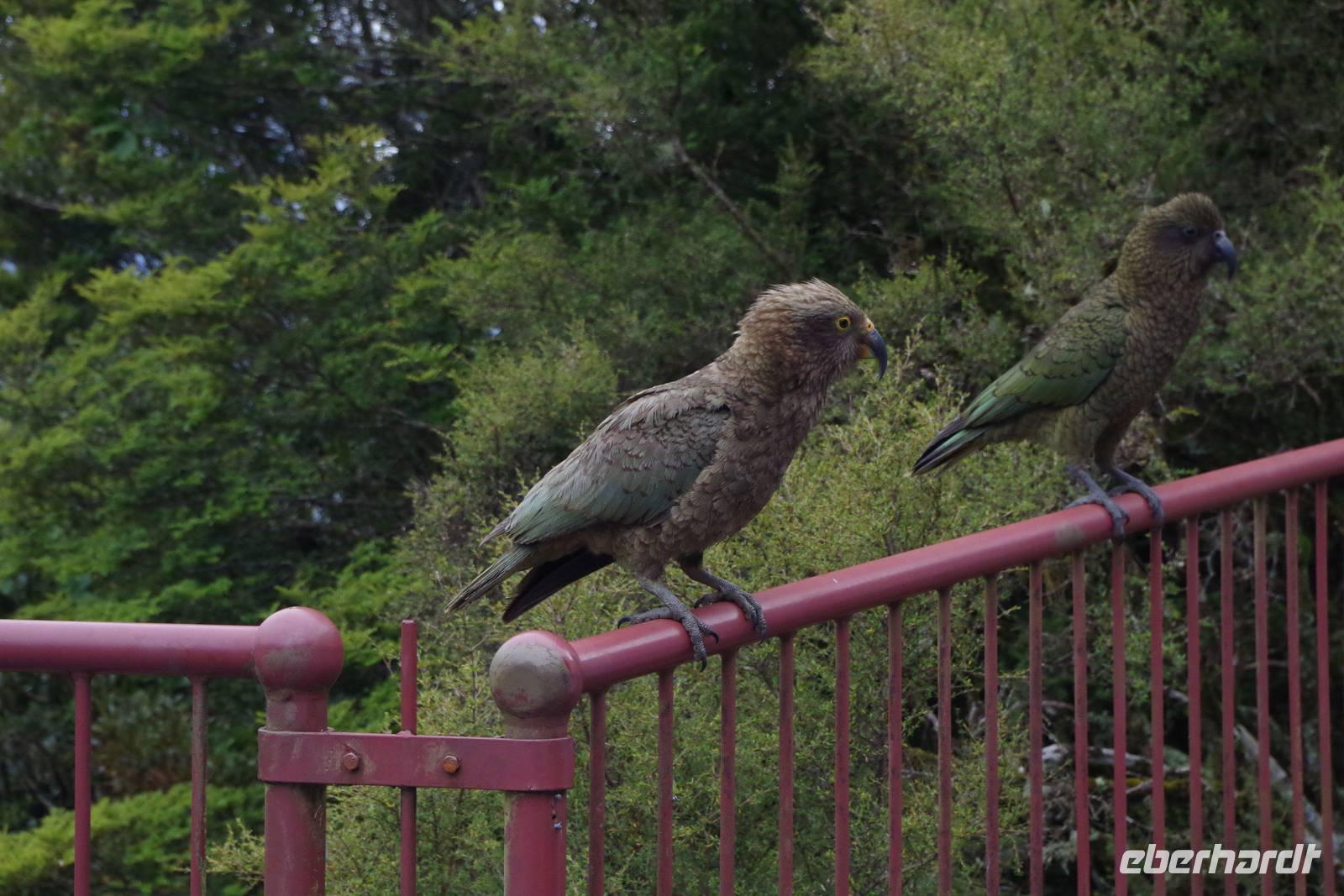 Wir machten Halt in der zerstörten Innenstadt und erkundeten unter anderem die Ruine der Kirche, das Mahnmal für die durch das Erdbeben 185 getöteten Menschen und auch bei der Pappkirche, die als Ersatz für die zerstörte Kirche aufgebaut wurde. Anschließend ging es für uns raus aus Christchurch durch die Cantebury Planes zum Arthurs Pass. In der Cantebury Planes sahen wir die ersten Schaf- und Kuhfarmen. Bald erhoben sich auch die ersten großen Berge des Arthur Passes vor uns. Am Arthurs Pass genossen wir unsere Mittagspause. Hier machten wir bereits erst Bekanntschaft mit dem Kea. Der Kea ist eine Papageienart, die sehr schlau ist und versucht, Touristen zu bestehlen. Ja sogar ein Sandwich inkl. Verpackung ist nicht vor ihnen sicher!