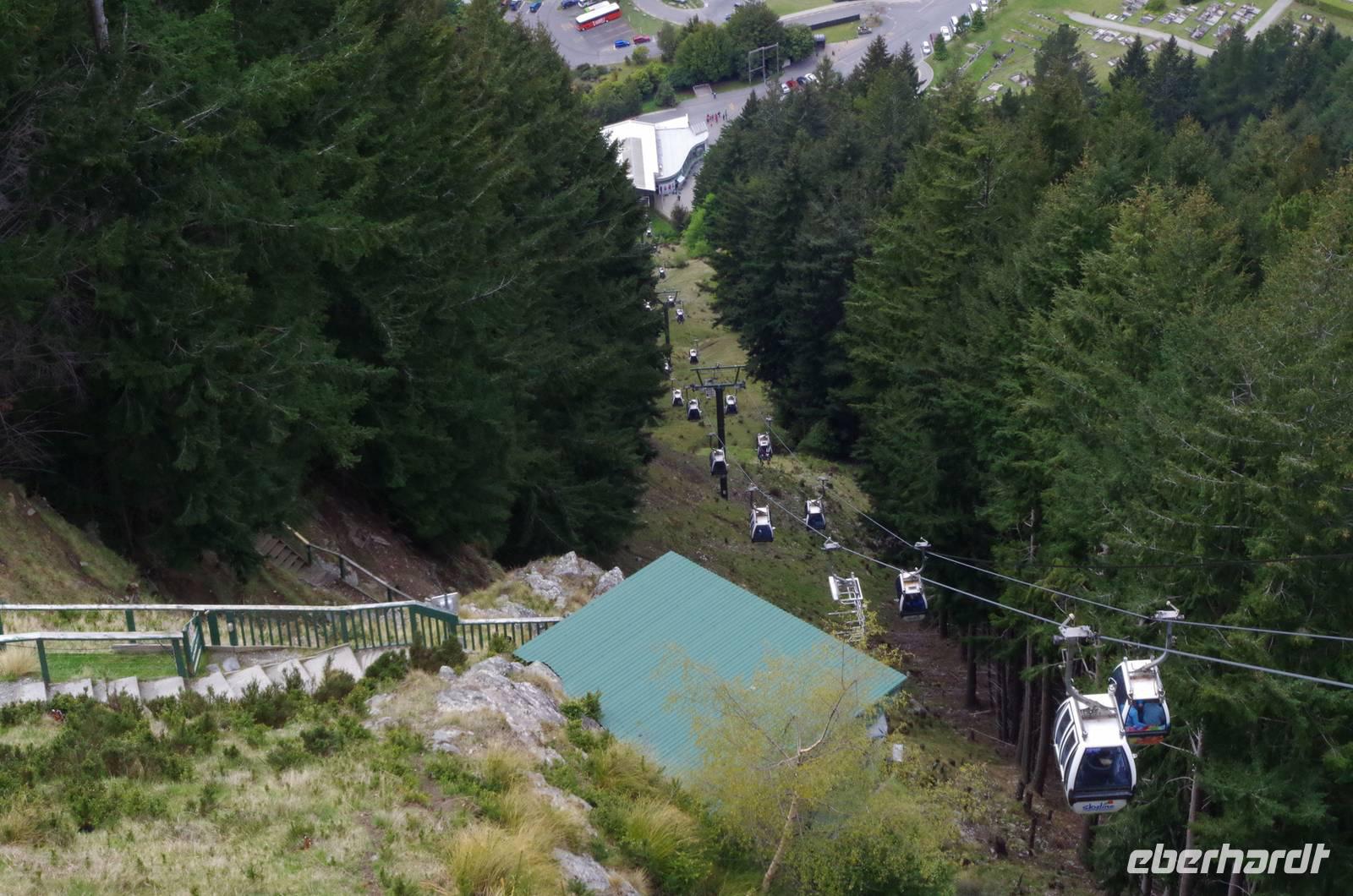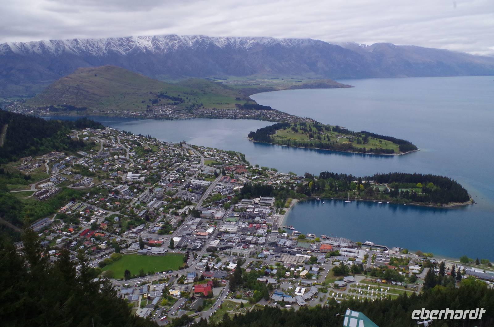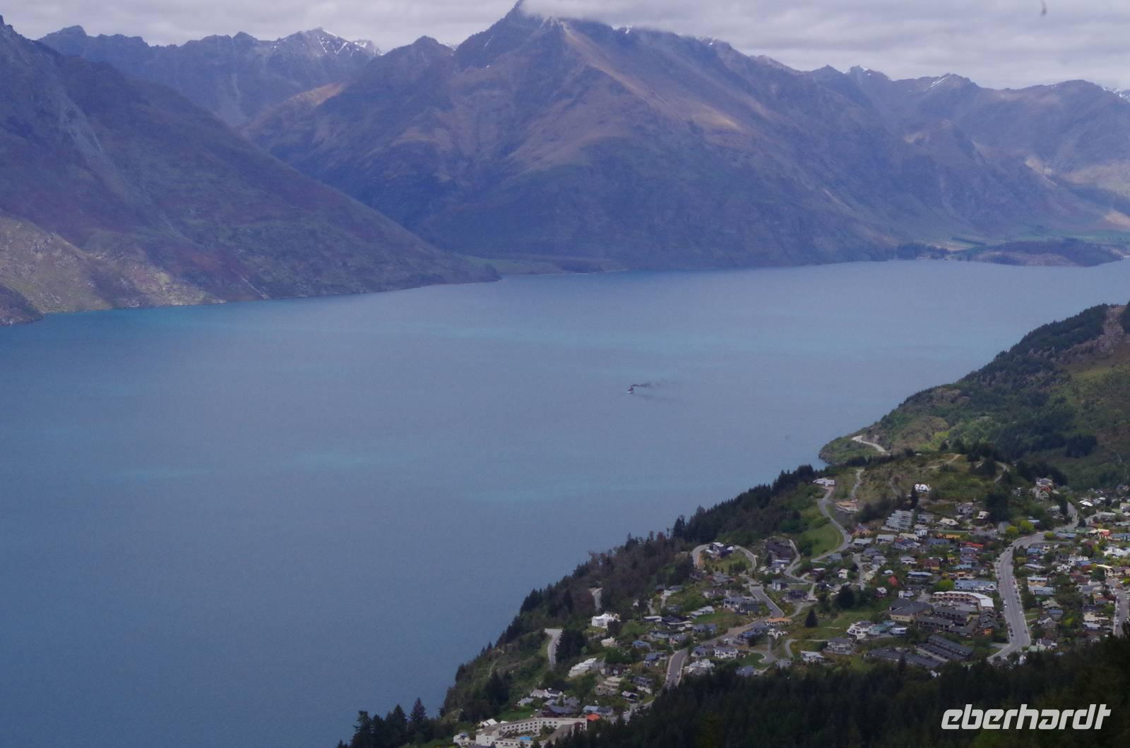 Somit bot sich als nächster Punkt eine Fahrt mit der Seilbahngondel auf den 450 Meter hohen Aussichtspunkt Bob's Peak. Der Blick auf Queenstown war atemberaubend. Wir konnten die TSS Earnslow entdecken, wie sie wieder ihre Fahrt auf dem Lake Wakatipu aufnahm. Wir entdeckten unser Hotel, die Einkaufsmeile und die wunderschönen Berge hinter dem Lake Wakatipu.
