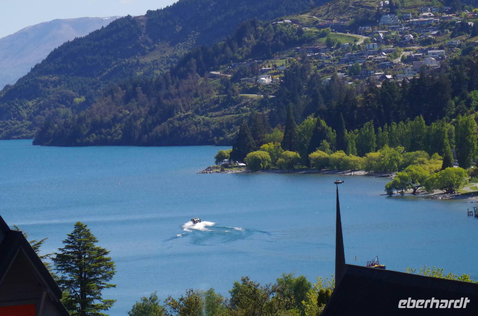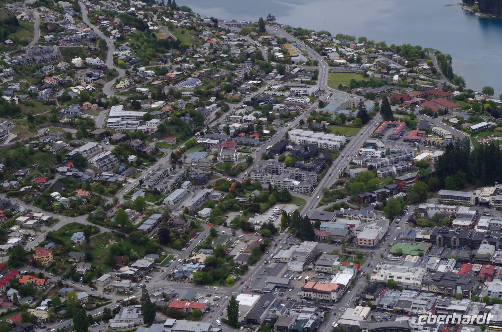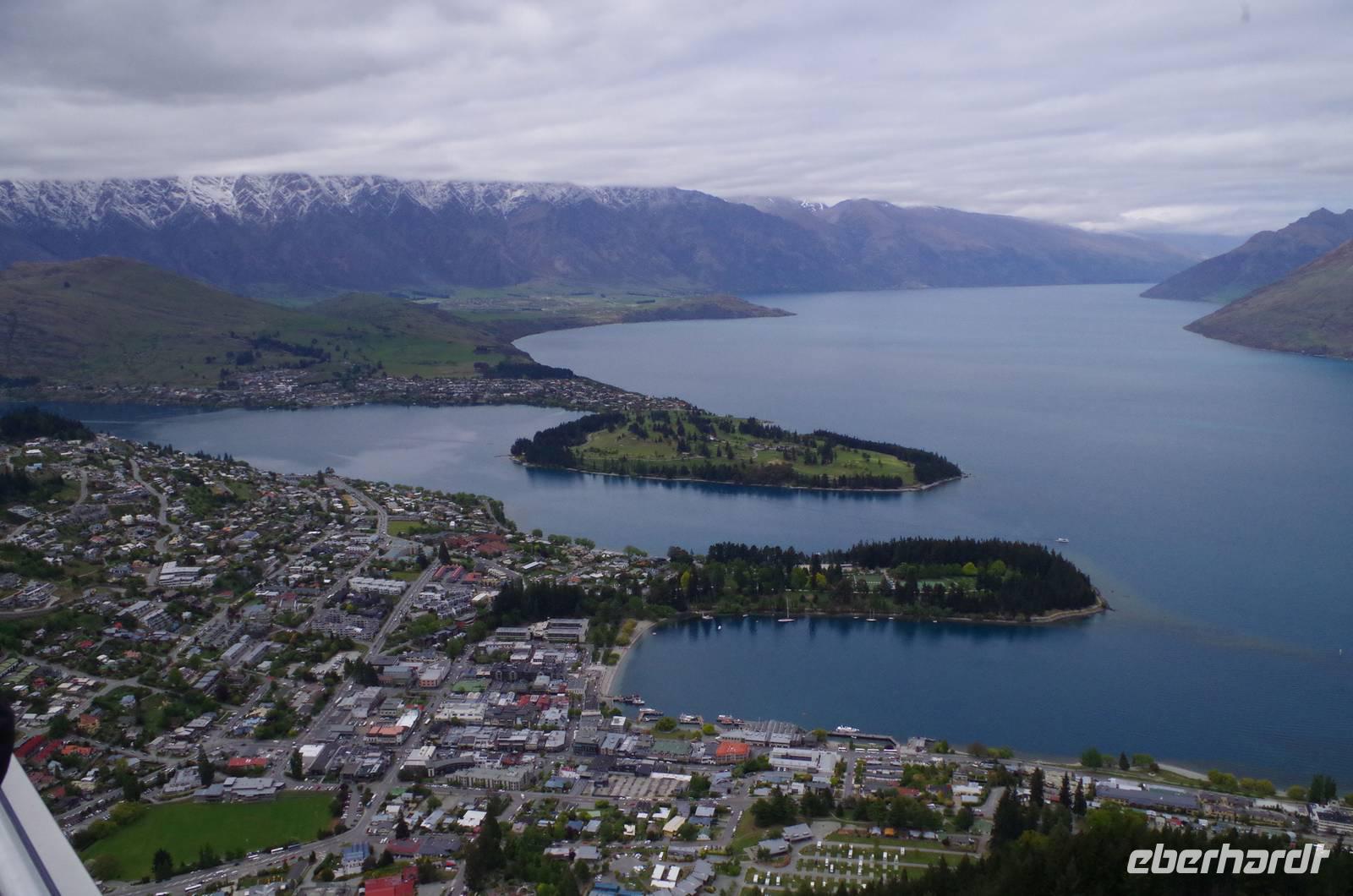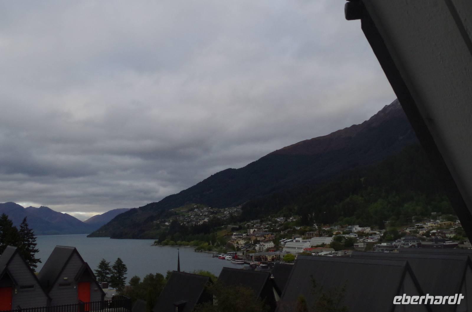 Somit bot sich als nächster Punkt eine Fahrt mit der Seilbahngondel auf den 450 Meter hohen Aussichtspunkt Bob's Peak. Der Blick auf Queenstown war atemberaubend. Wir konnten die TSS Earnslow entdecken, wie sie wieder ihre Fahrt auf dem Lake Wakatipu aufnahm. Wir entdeckten unser Hotel, die Einkaufsmeile und die wunderschönen Berge hinter dem Lake Wakatipu.