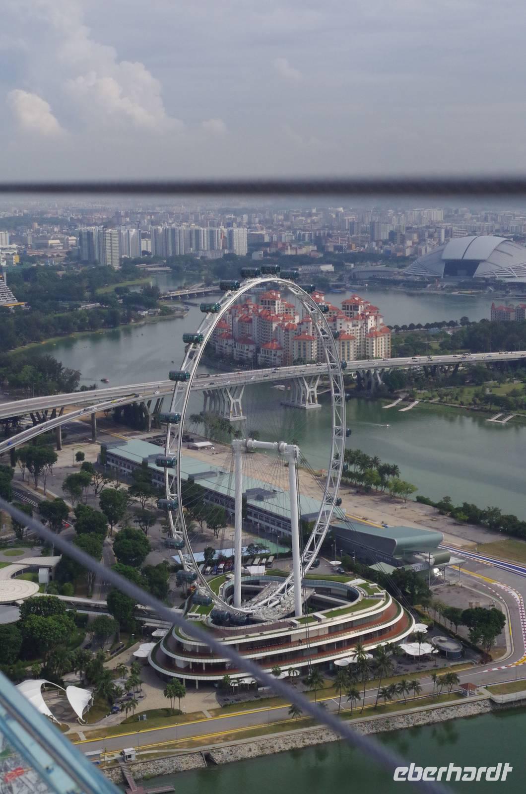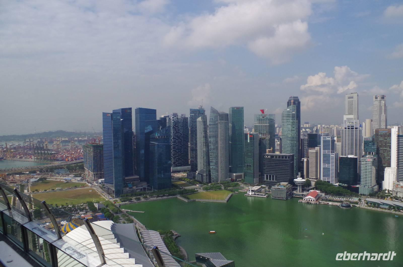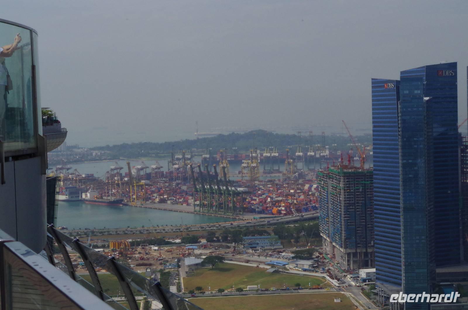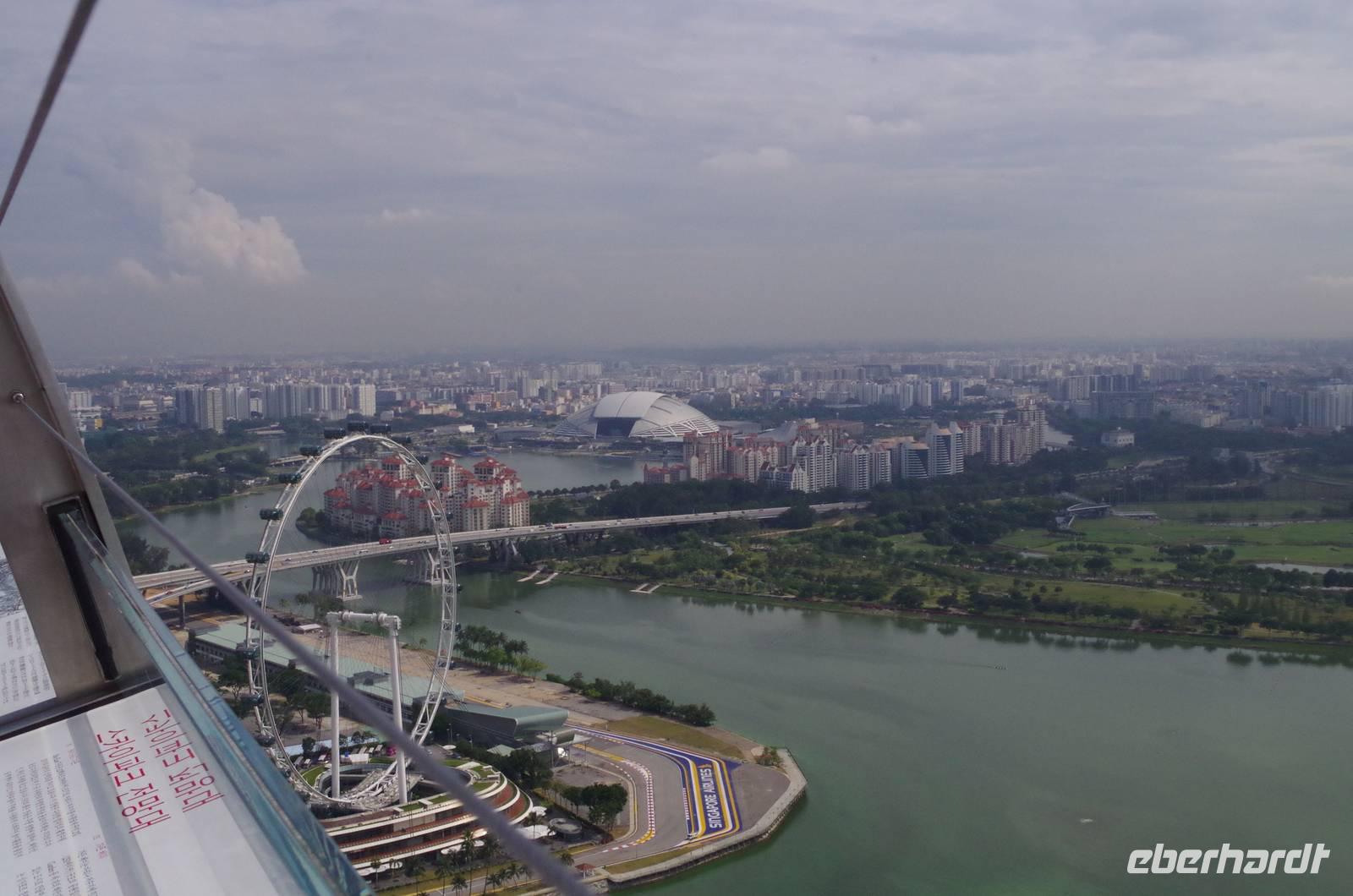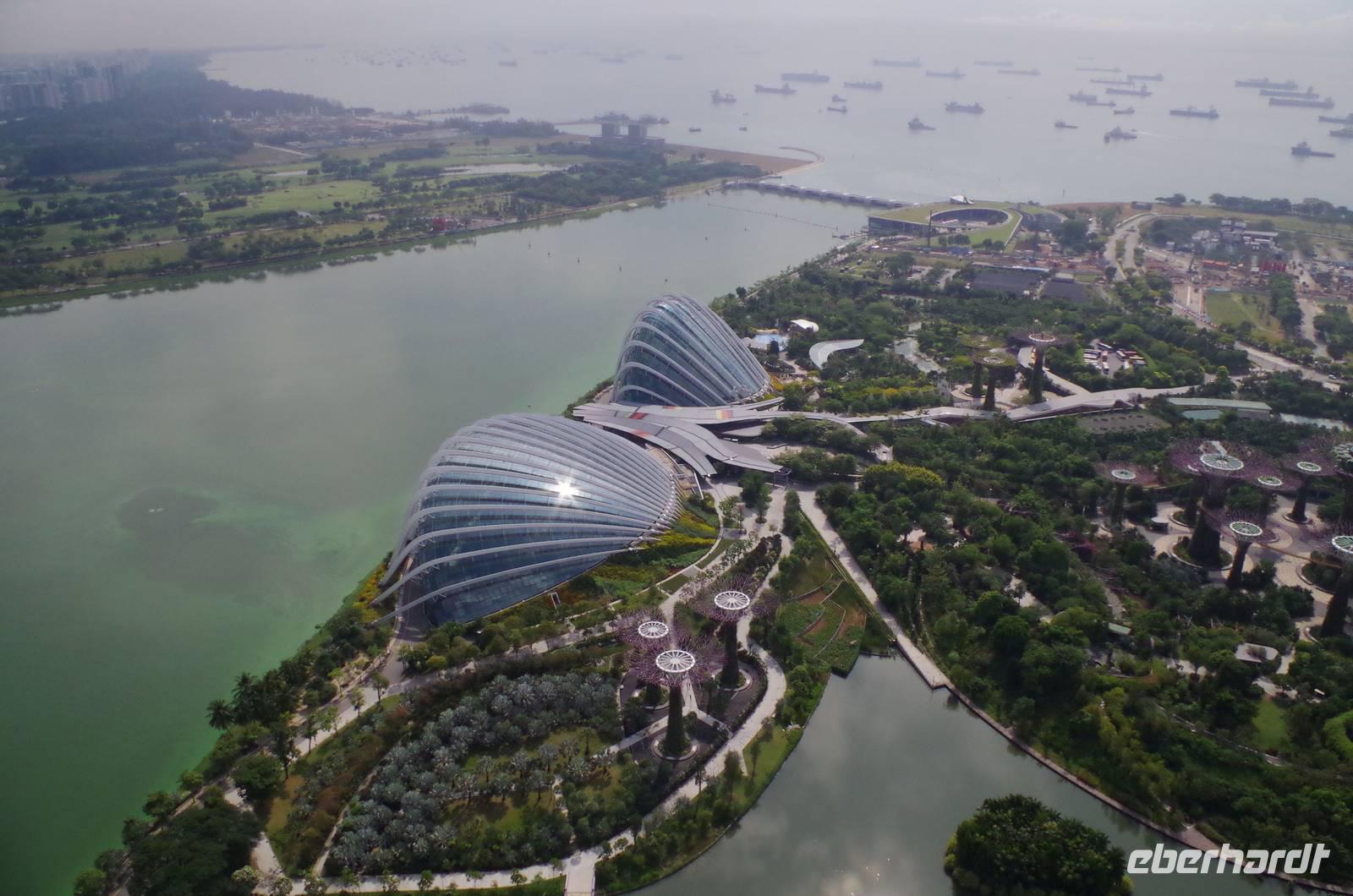 Hier hatten wir einen Wahnsinns-Ausblick auf Singapur. Wir entdeckten die Plätze, an denen wir gestern mit dem Boot entlang gefahren sind. Auch unseren nächsten Halt, die „Gardens of Bay", konnten wir schon ausfindig machen.